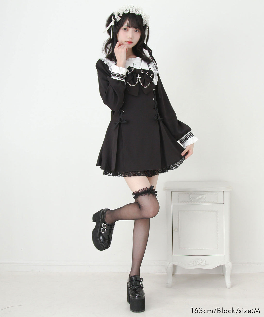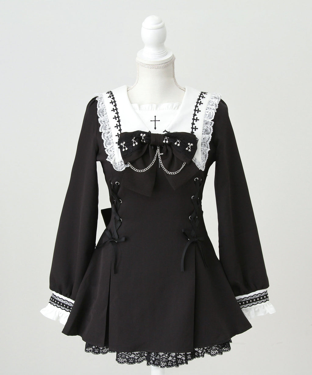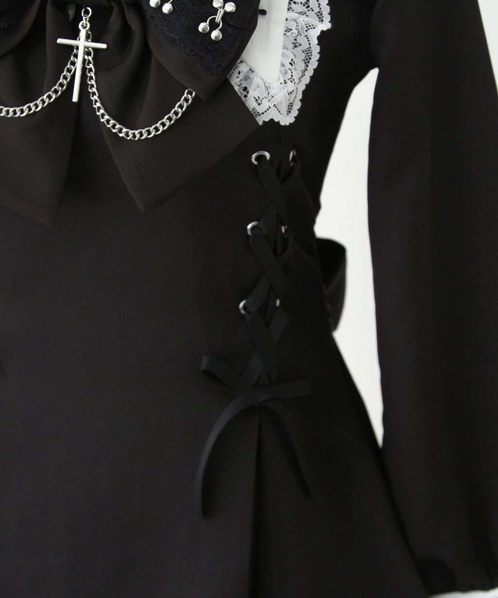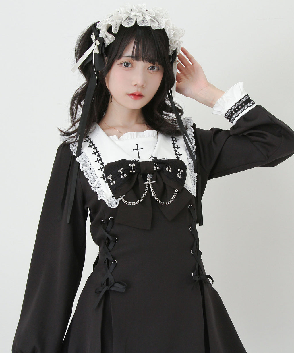 大きなリボンにあしらわれた十字架チャームとチェーンが胸元を印象的に飾り、繊細なレースや刺繍が上品なアクセントに。