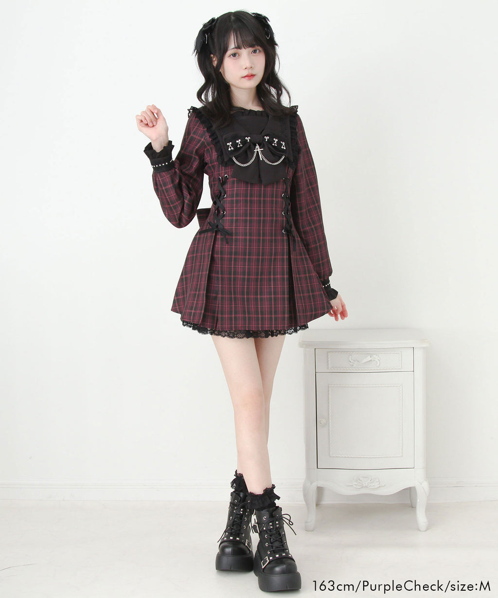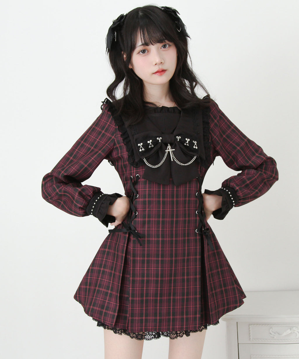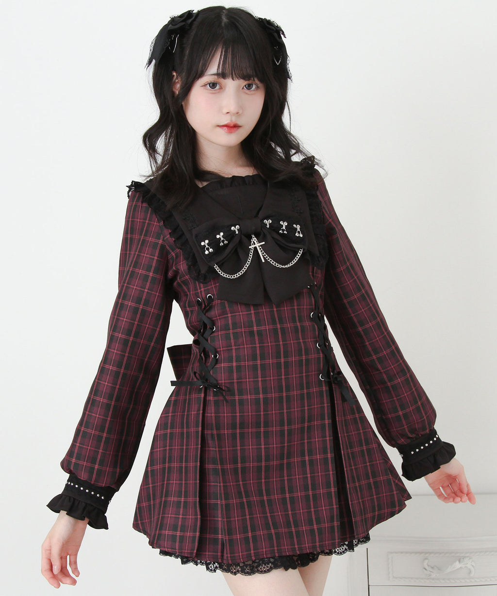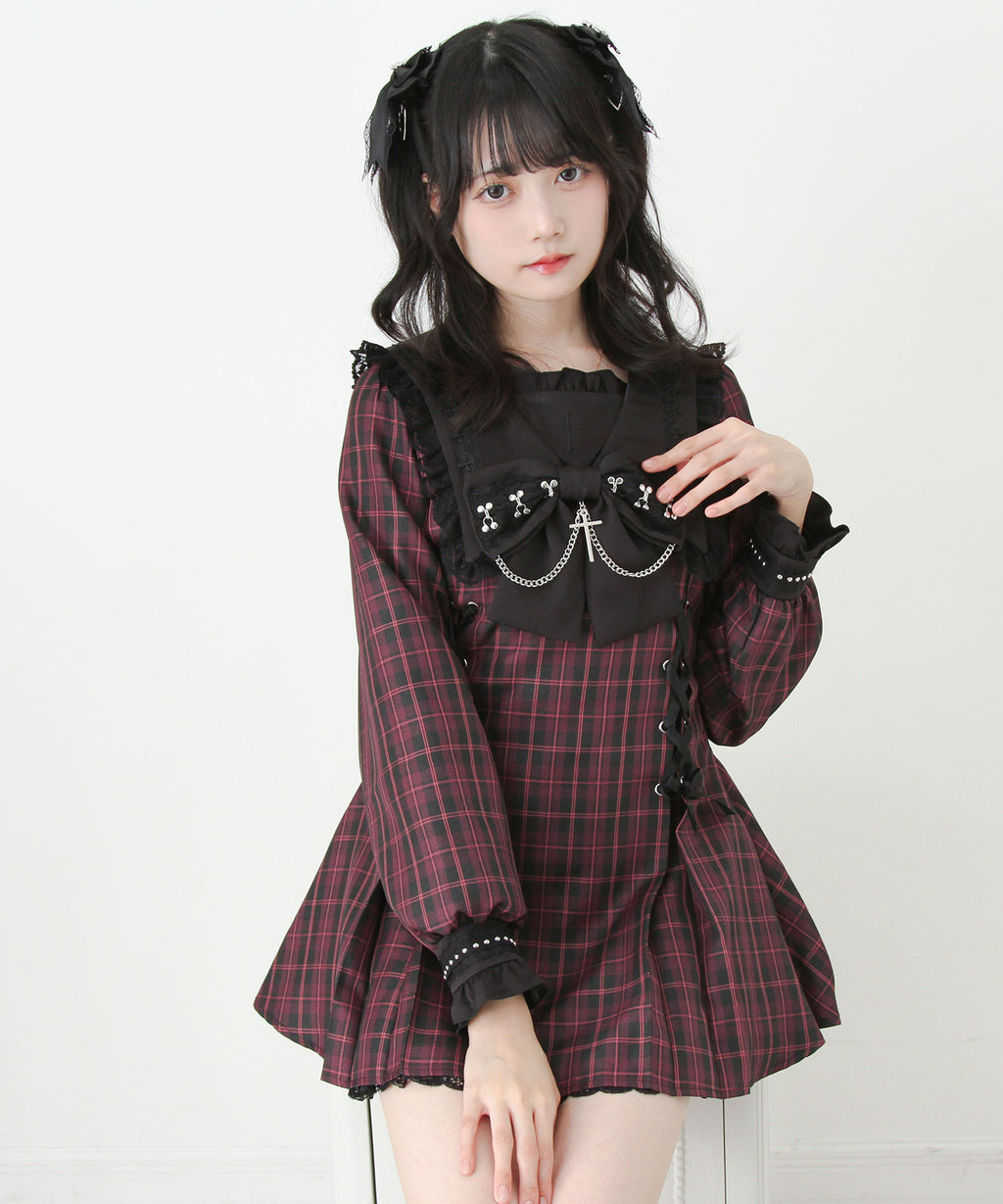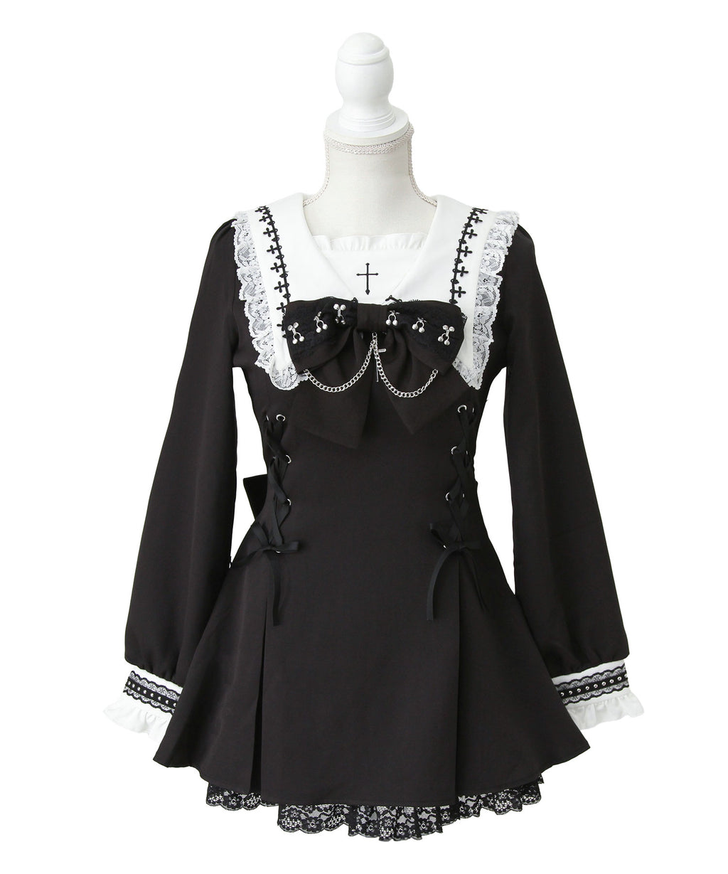 大きなリボンにあしらわれた十字架チャームとチェーンが胸元を印象的に飾り、繊細なレースや刺繍が上品なアクセントに。