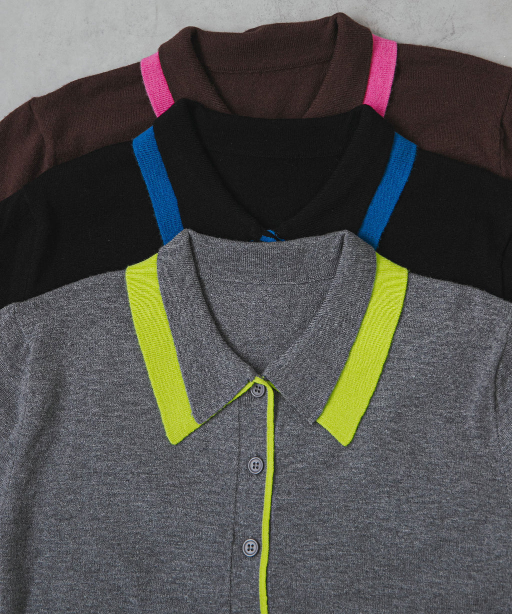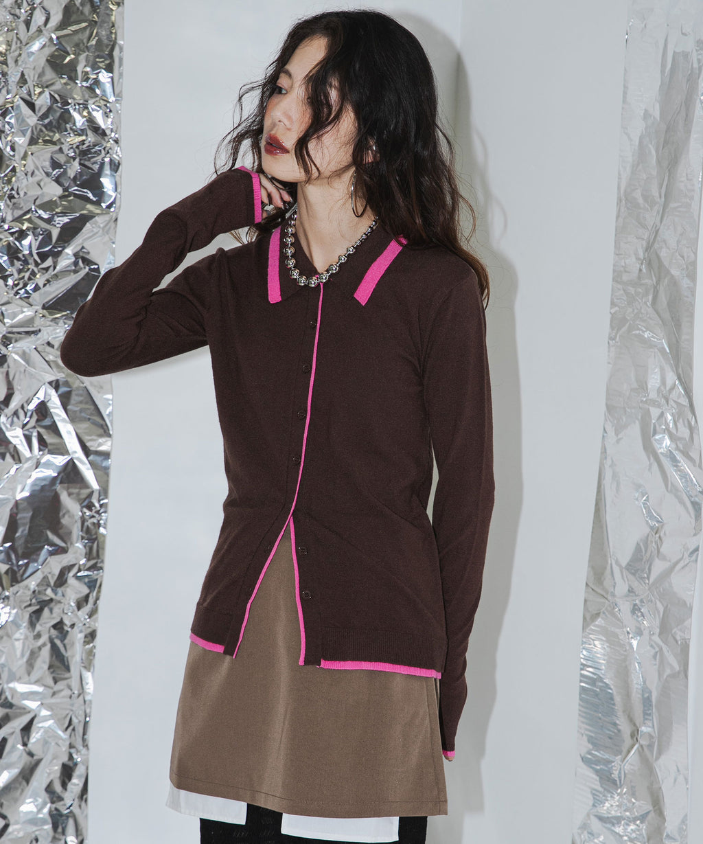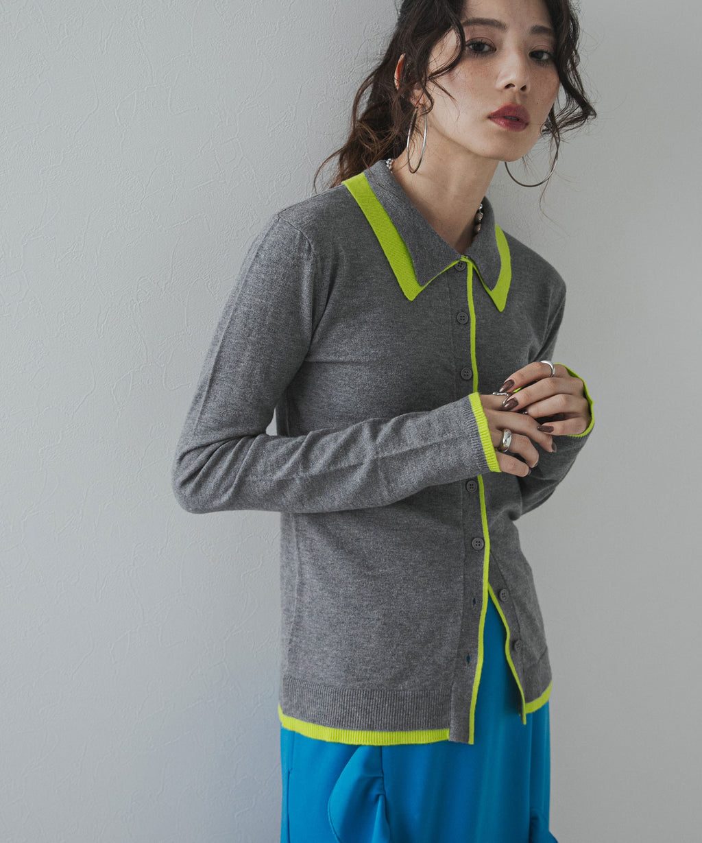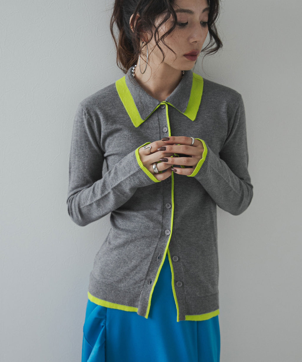 襟・前立て・裾・袖口に配色ラインを施した、メリハリのあるポロニットカーディガン。
