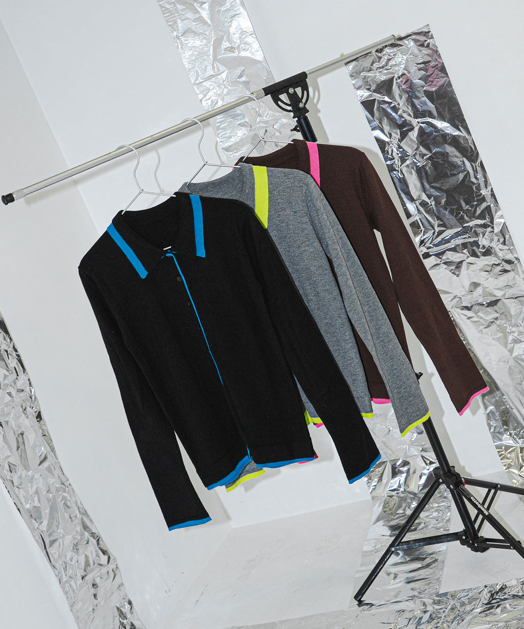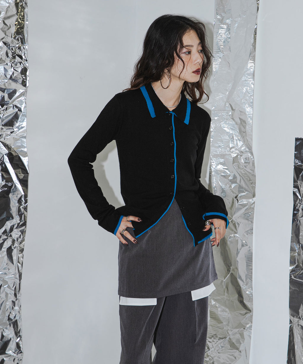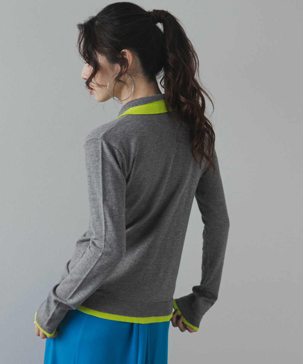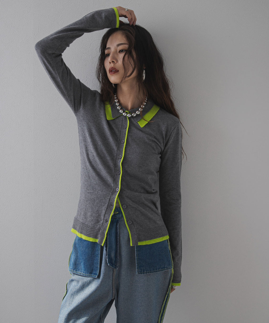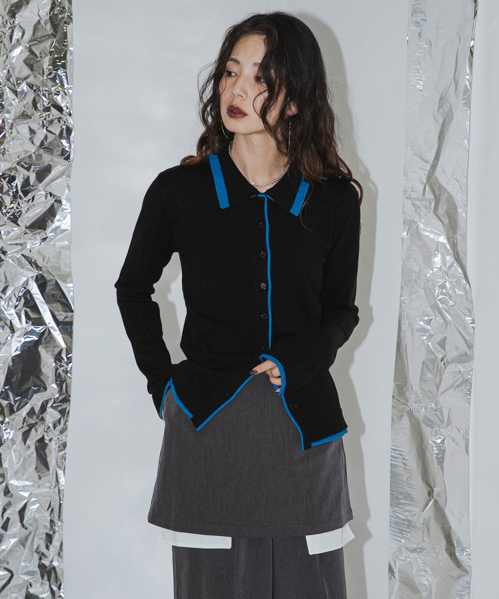 襟・前立て・裾・袖口に配色ラインを施した、メリハリのあるポロニットカーディガン。
