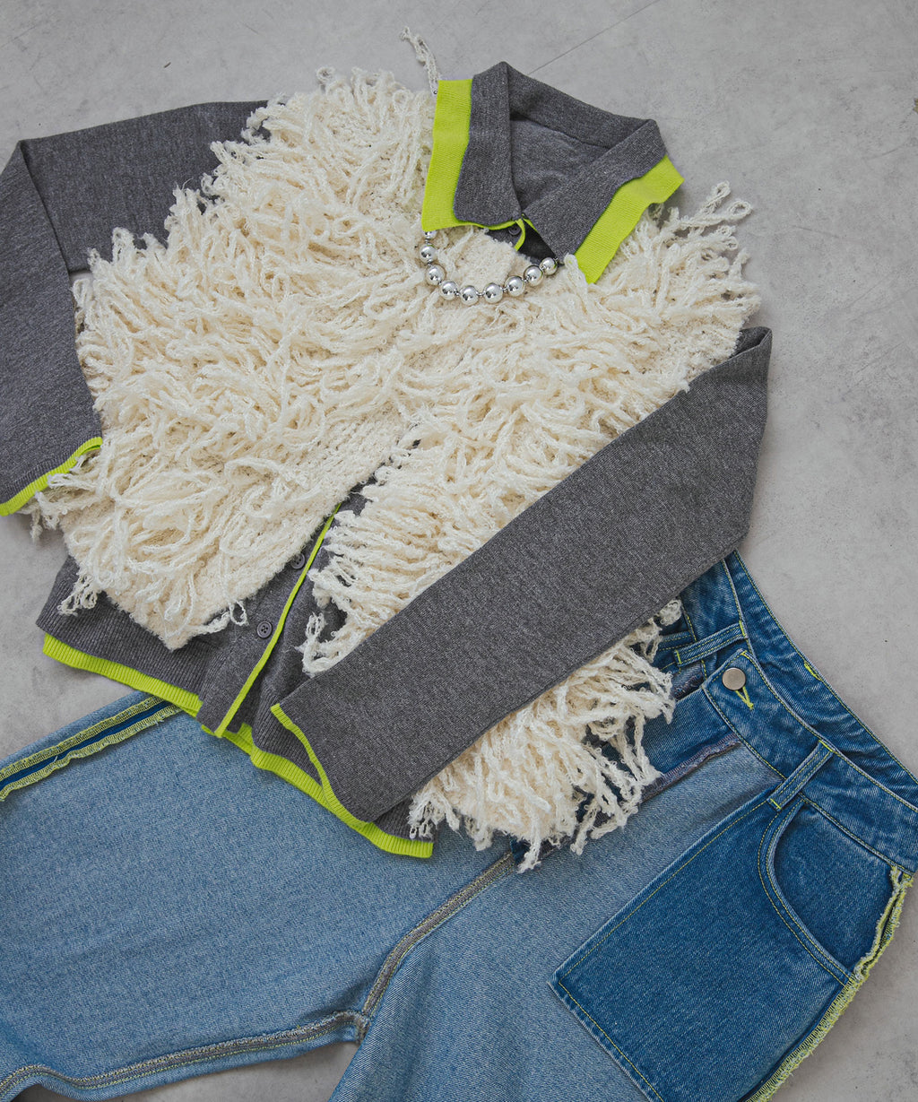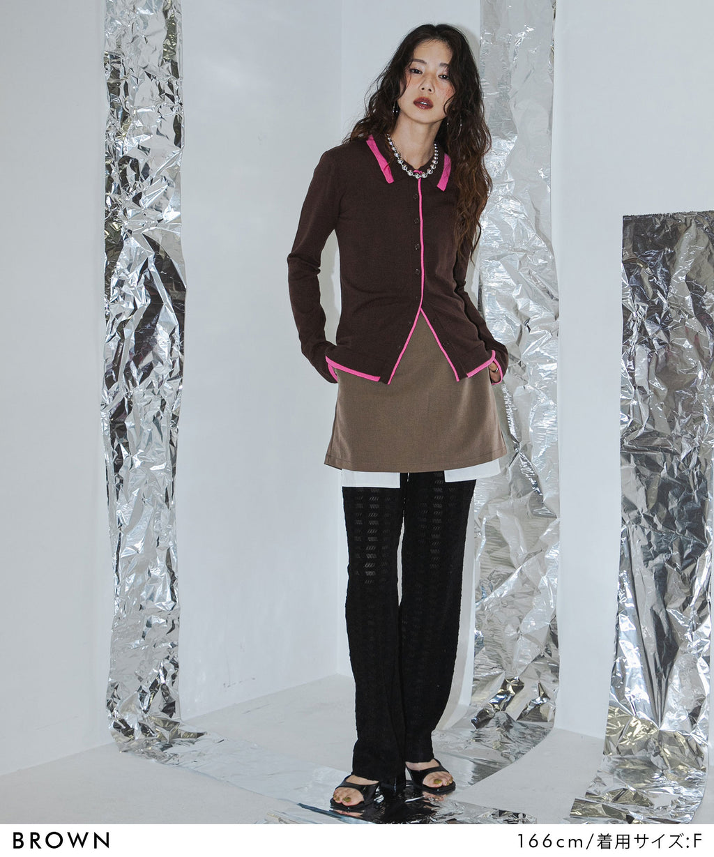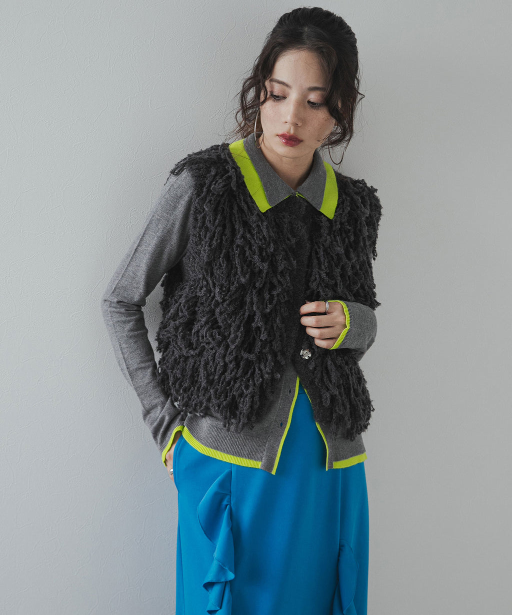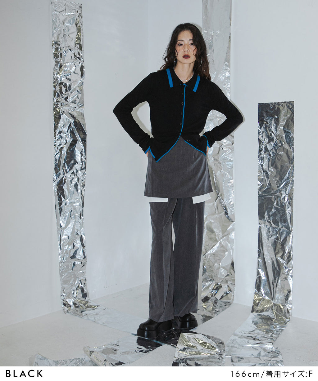 襟・前立て・裾・袖口に配色ラインを施した、メリハリのあるポロニットカーディガン。