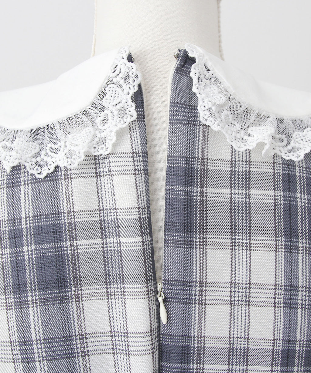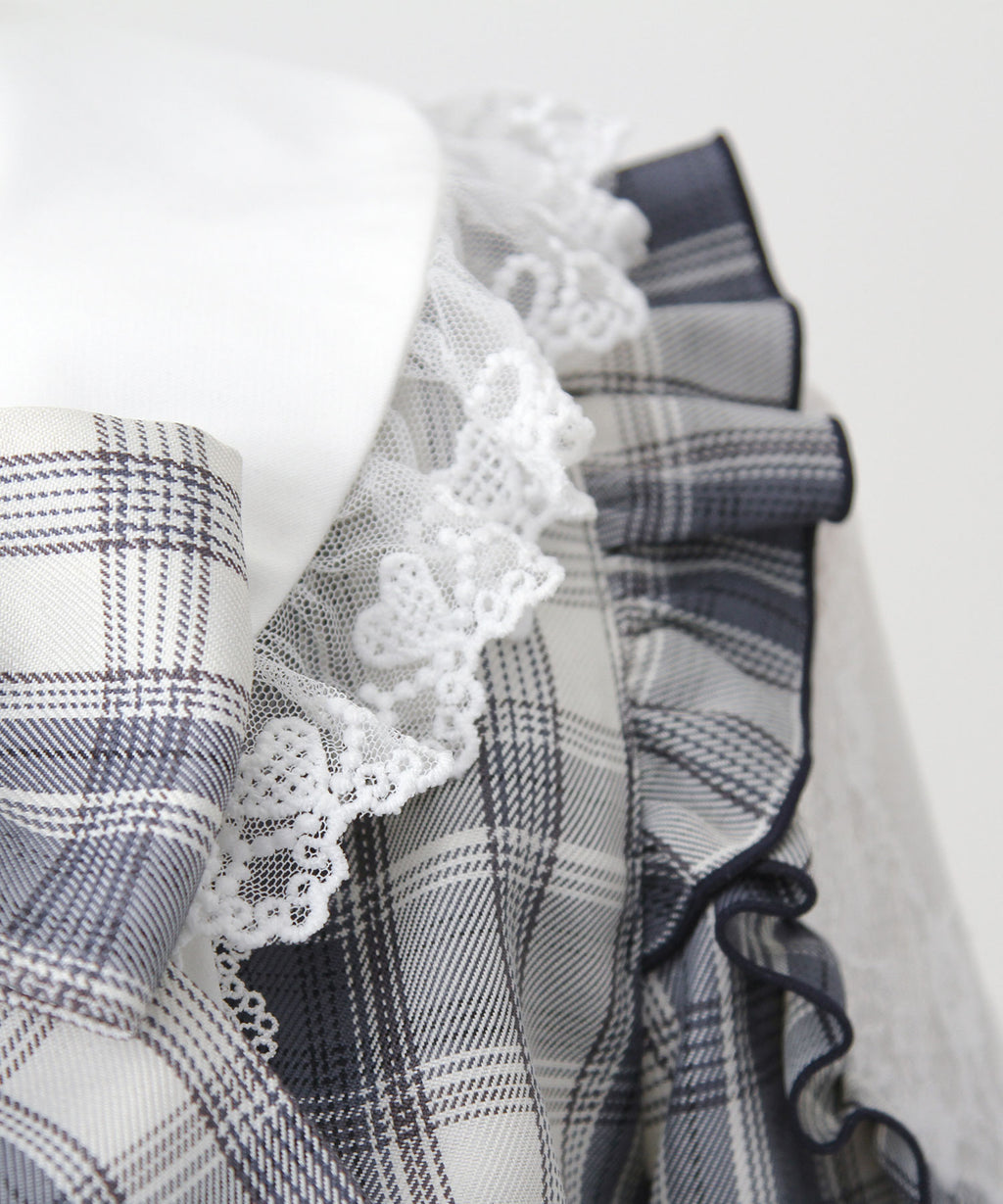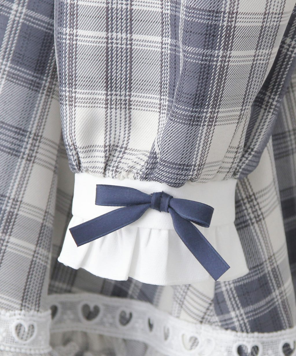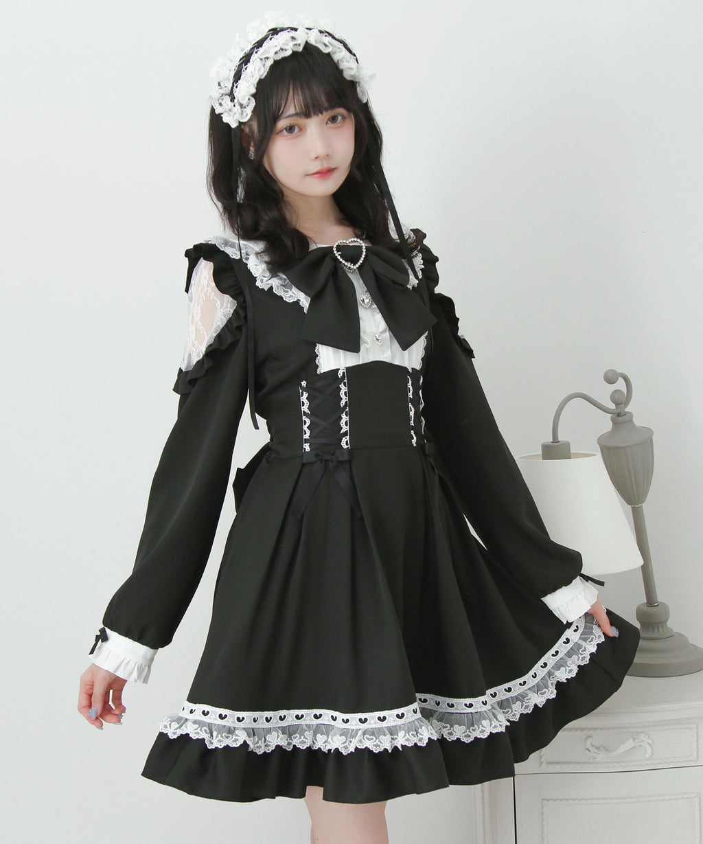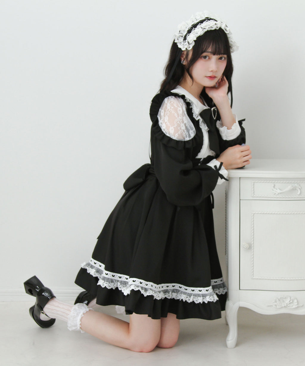 スカート部分にはフリルをふんだんに使用し、ハートモチーフを含む2種類のレースをあしらいました。