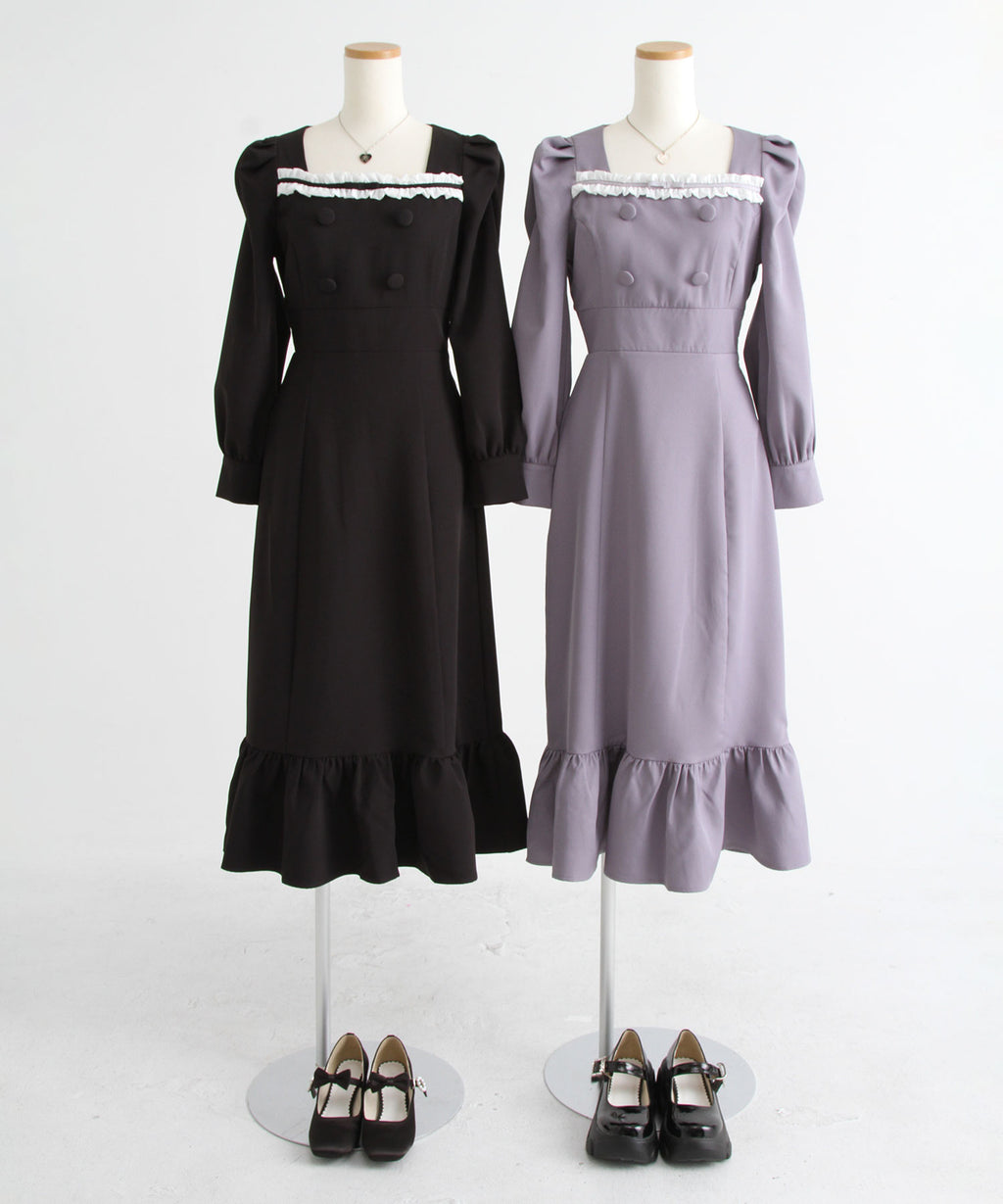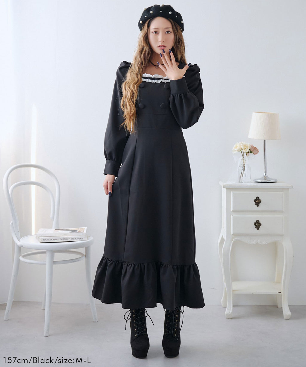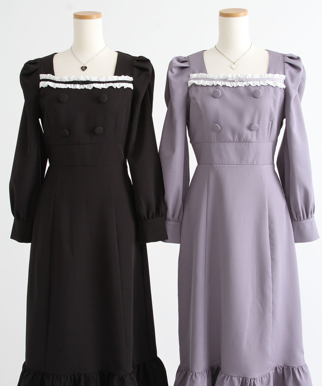 シンプルなデザインながらヨークフリルや大きめのくるみボタンがガーリーなデザイン。