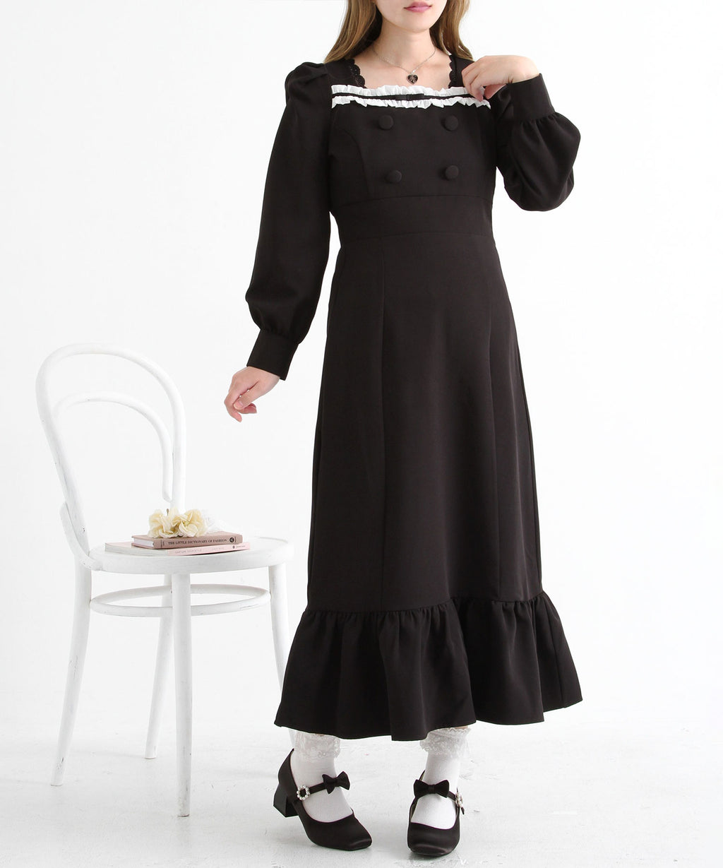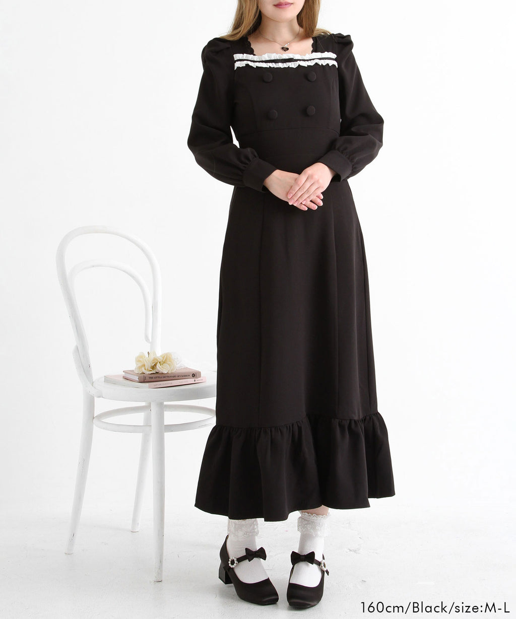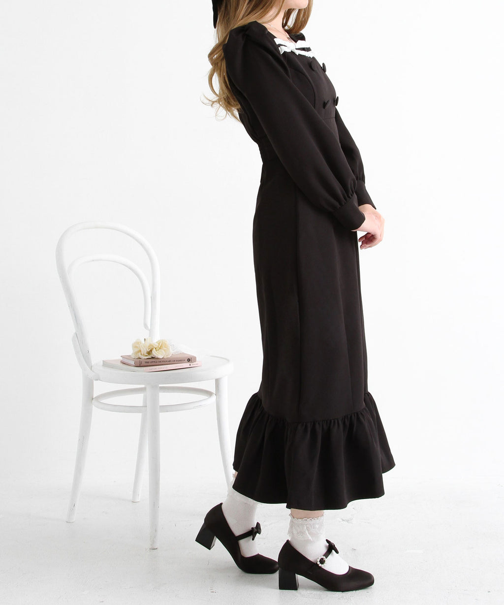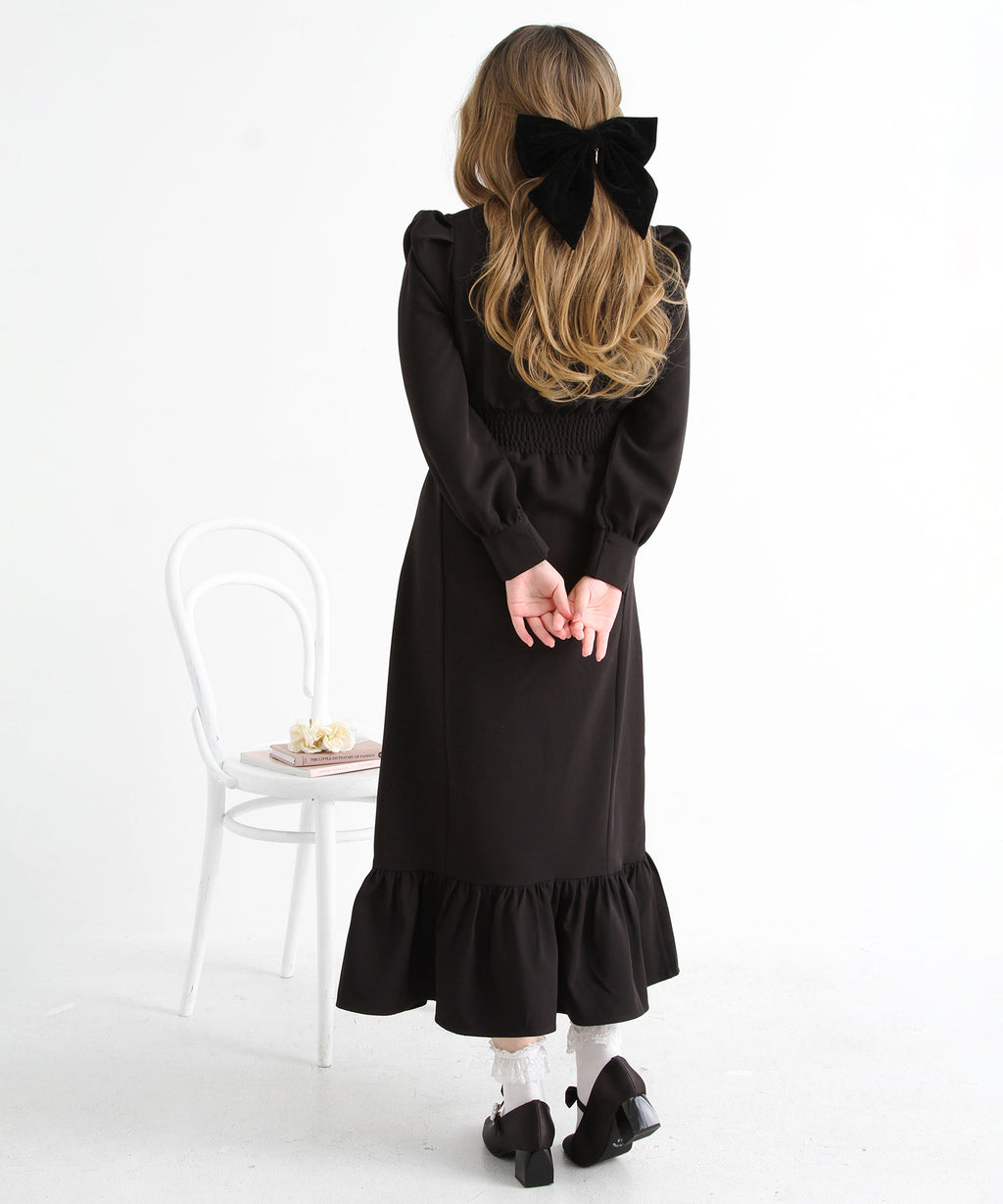 シンプルなデザインながらヨークフリルや大きめのくるみボタンがガーリーなデザイン。