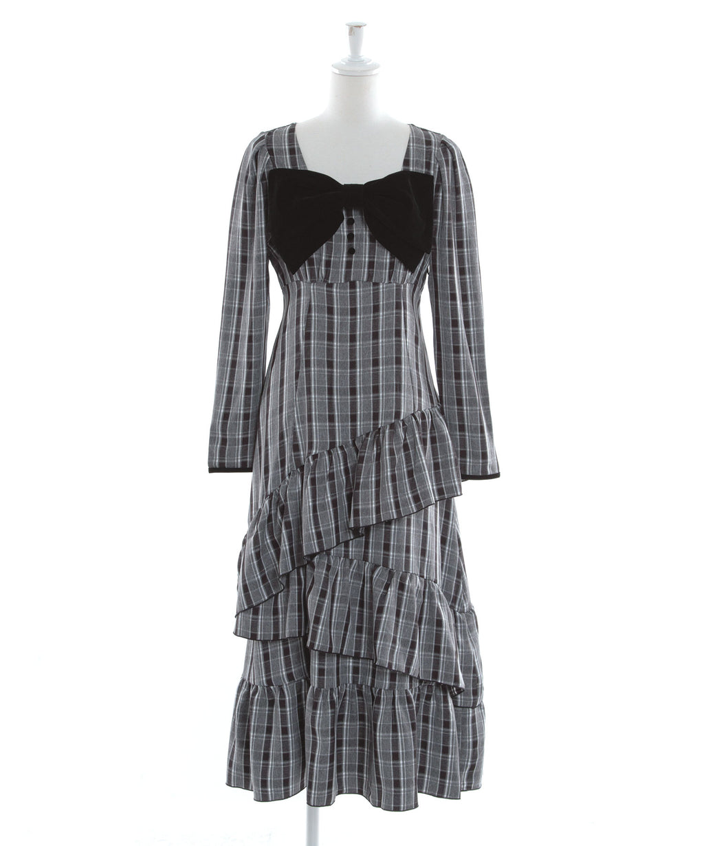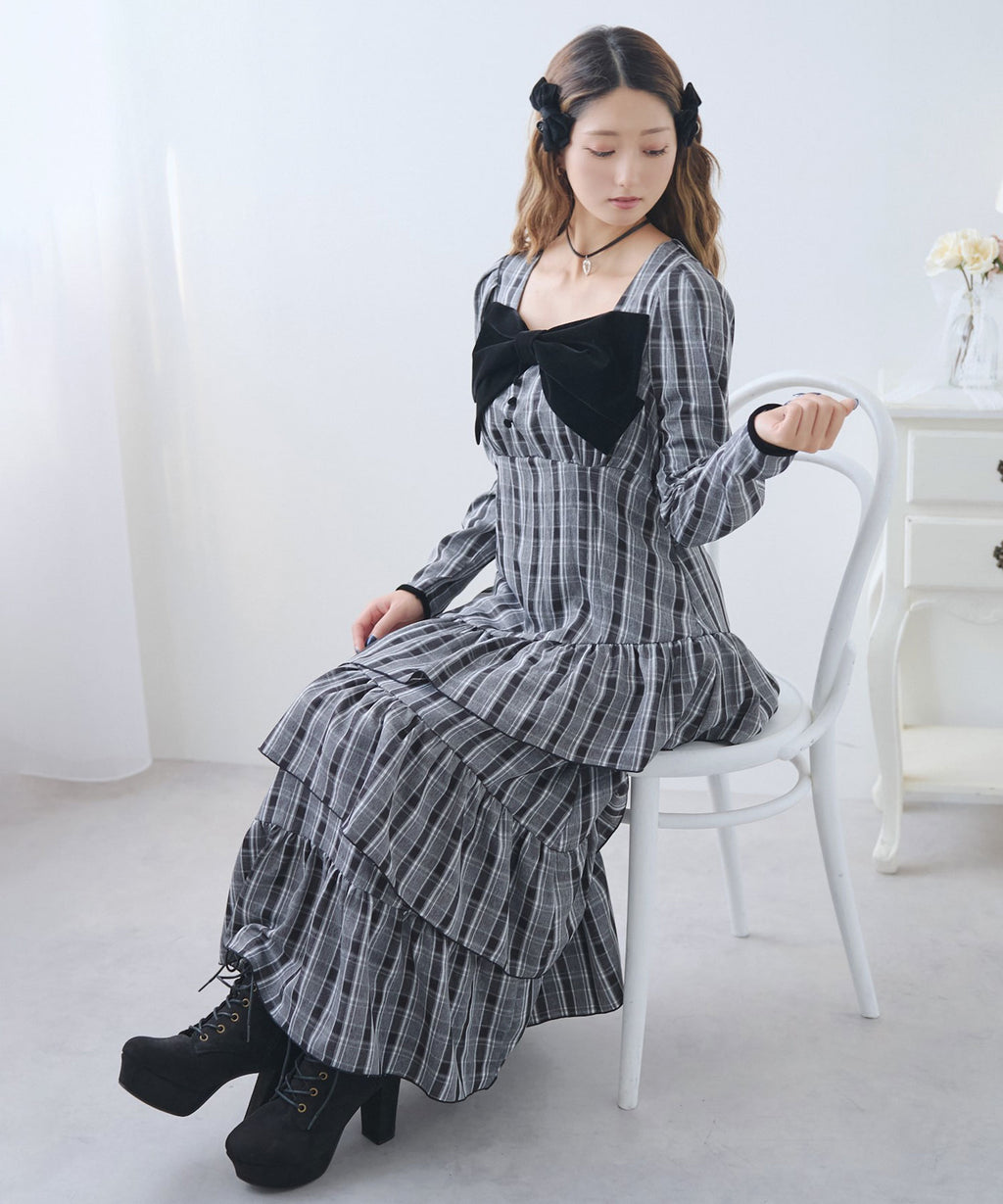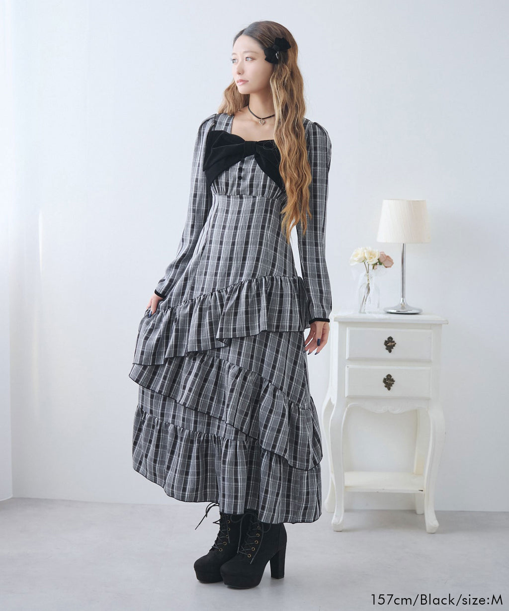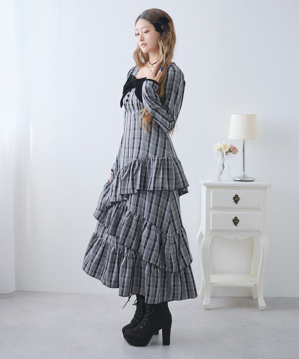 大きめリボン×チェック柄×ティアードフリルが主役の、クラシカルガーリーなロングワンピースが登場。