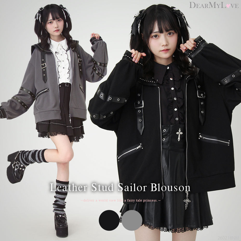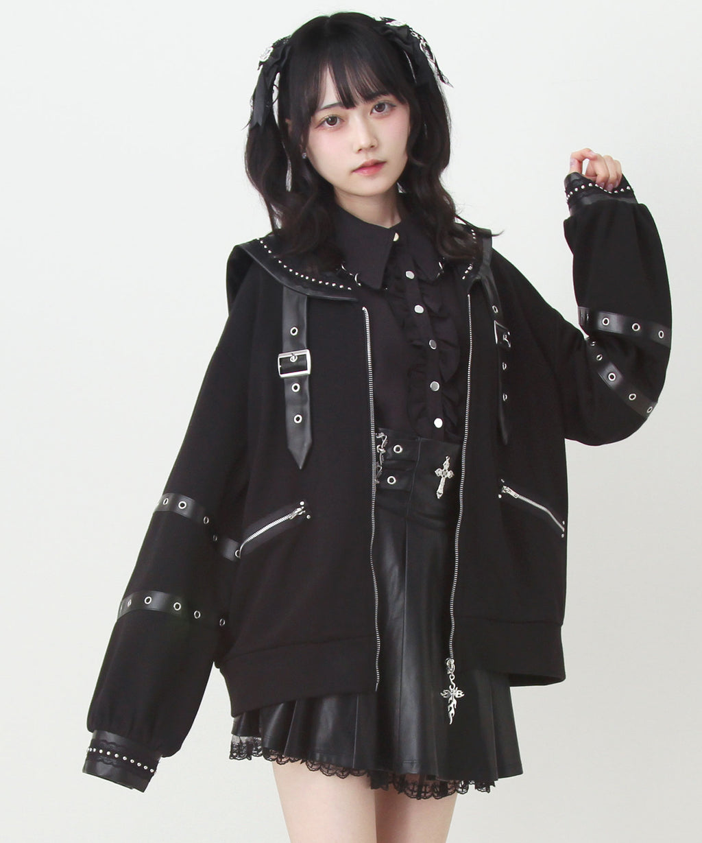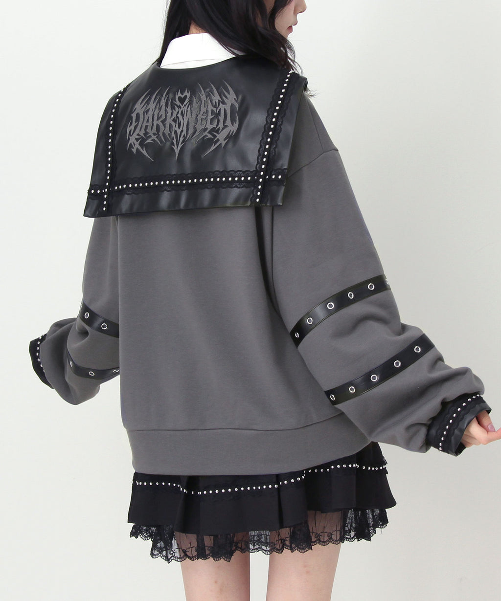 大きめセーラーカラーにレザー素材を使用し、縁にはスタッズ&レースをあしらったデザイン。