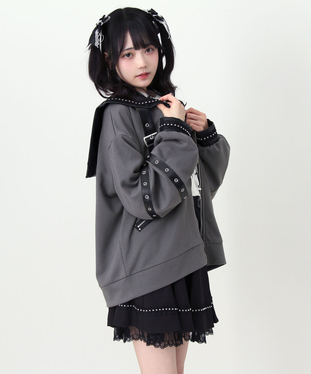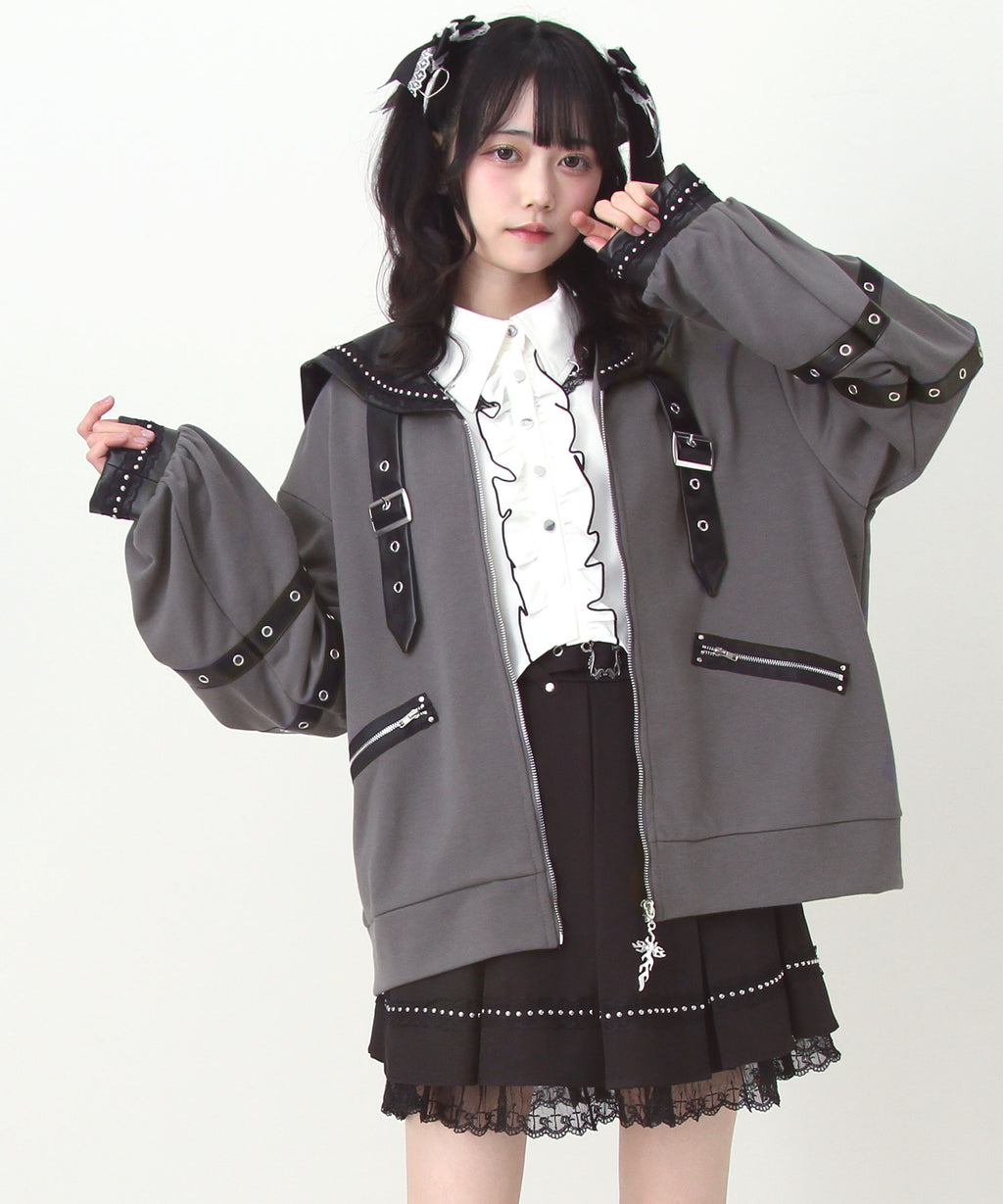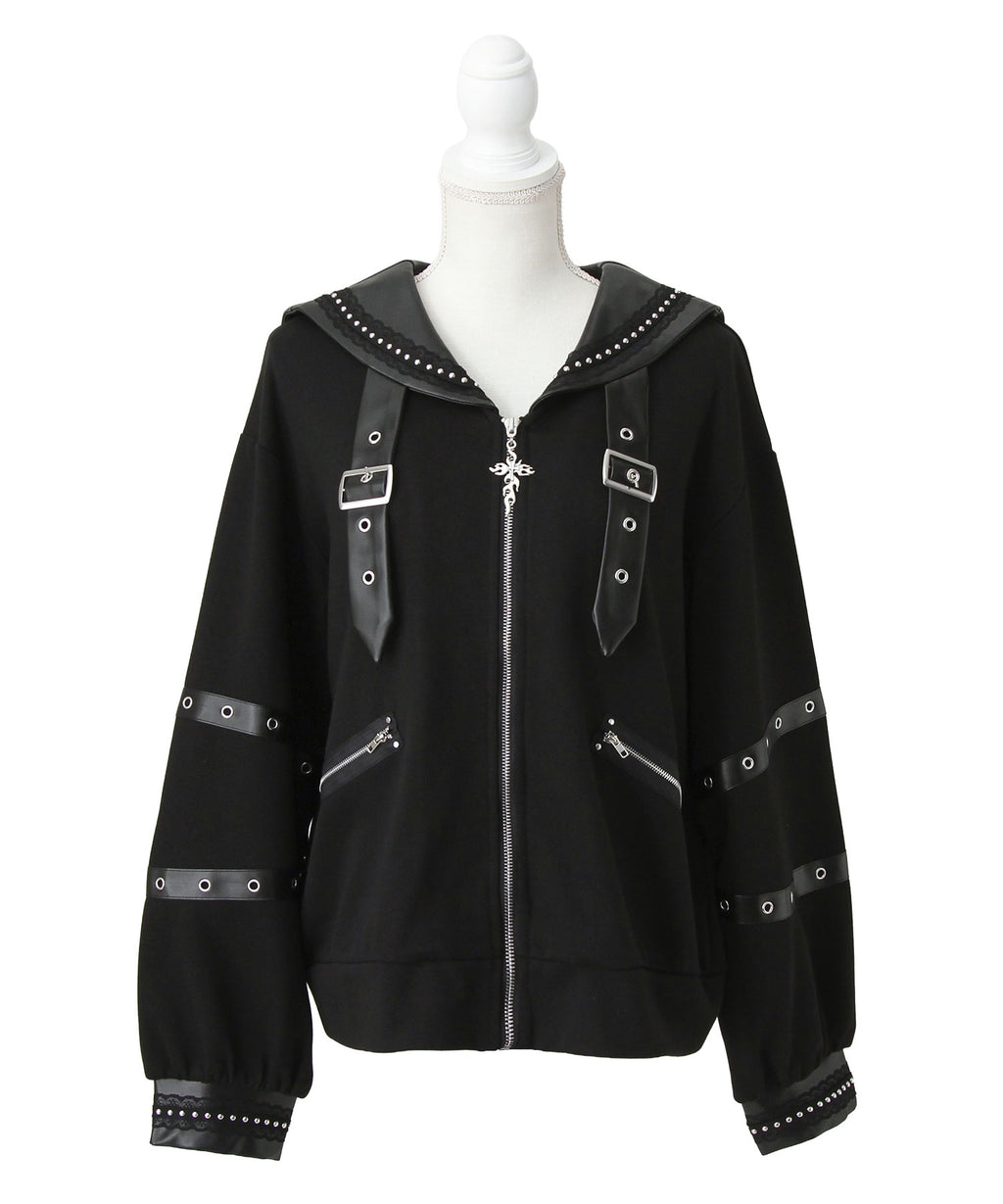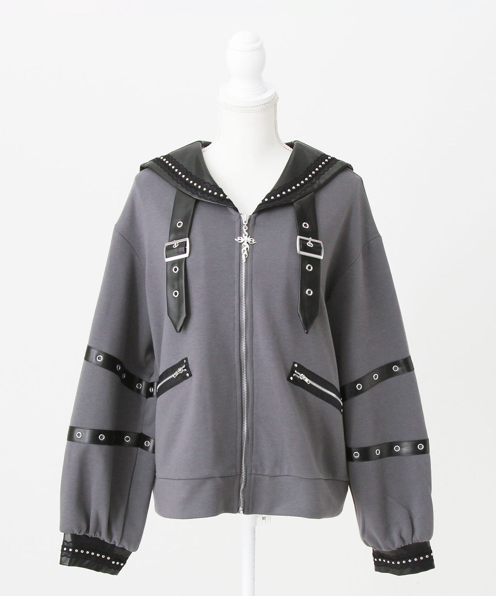 大きめセーラーカラーにレザー素材を使用し、縁にはスタッズ&レースをあしらったデザイン。