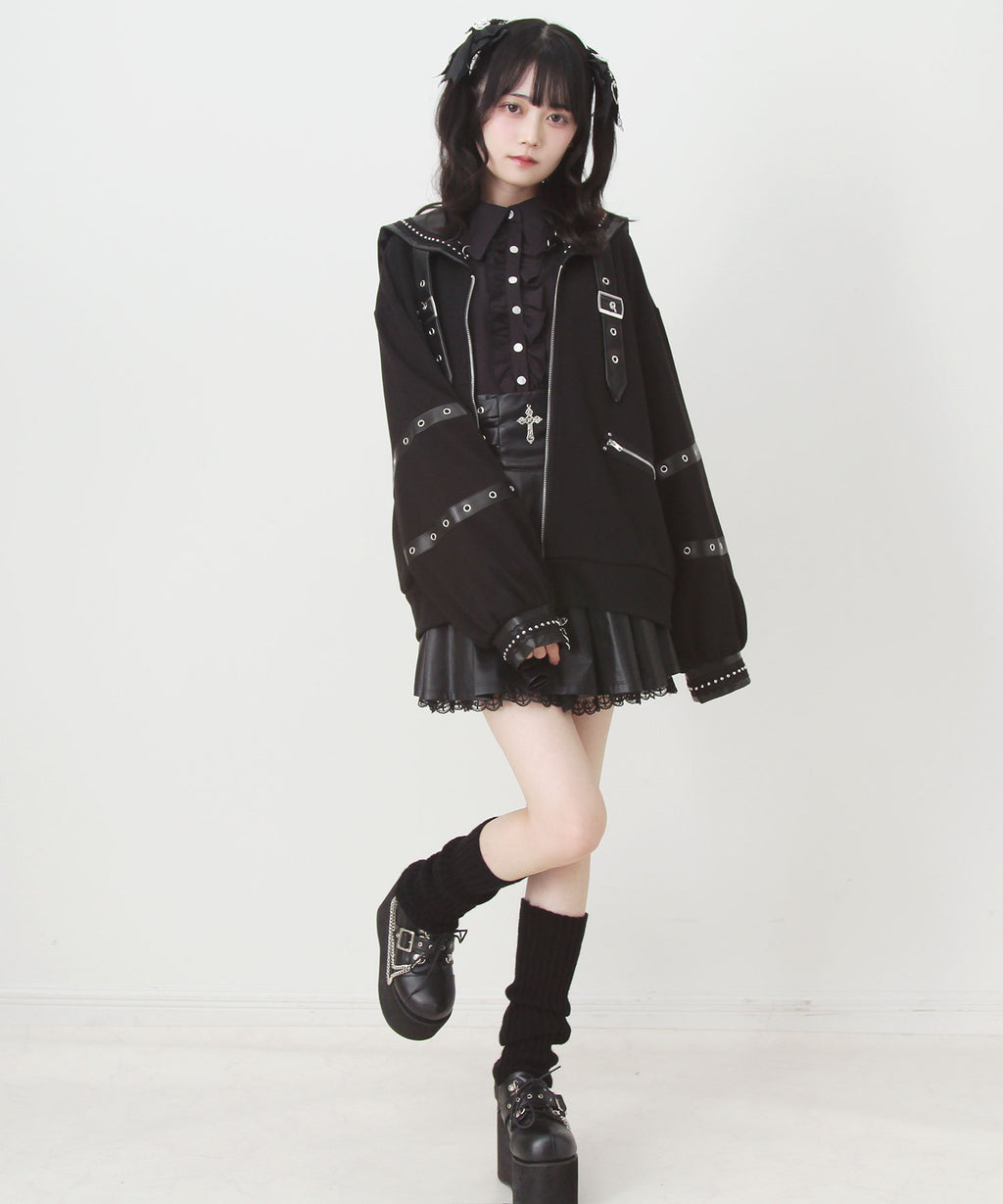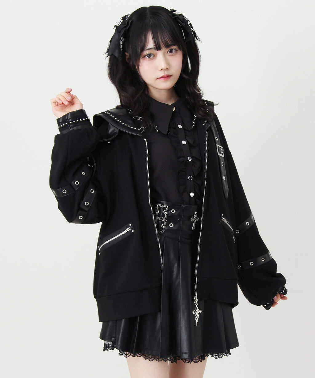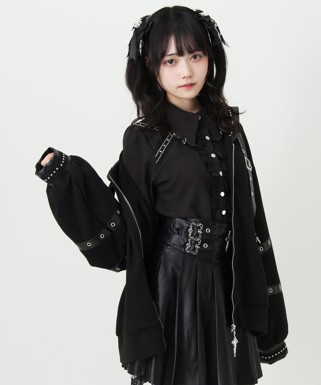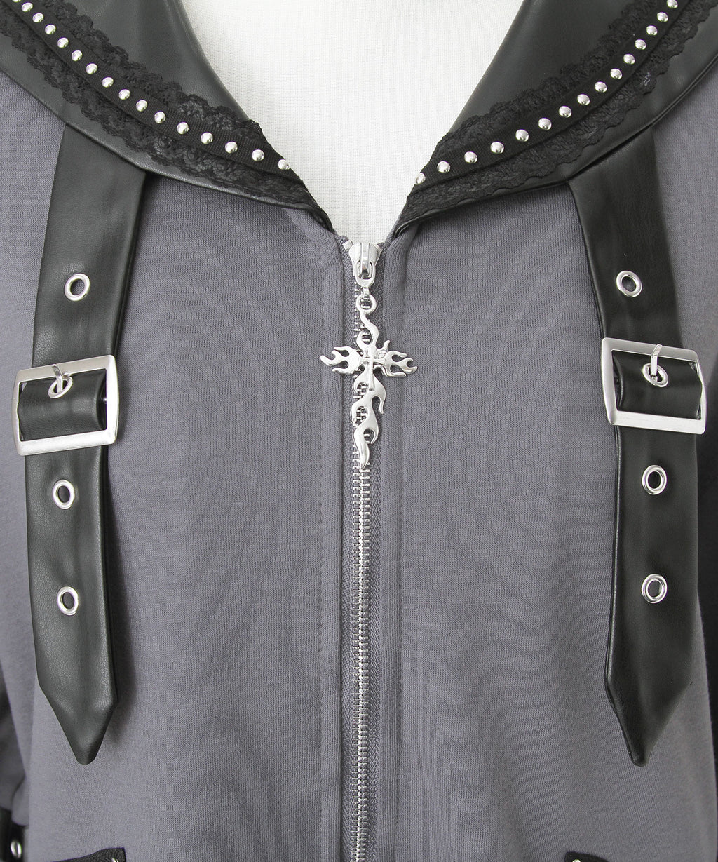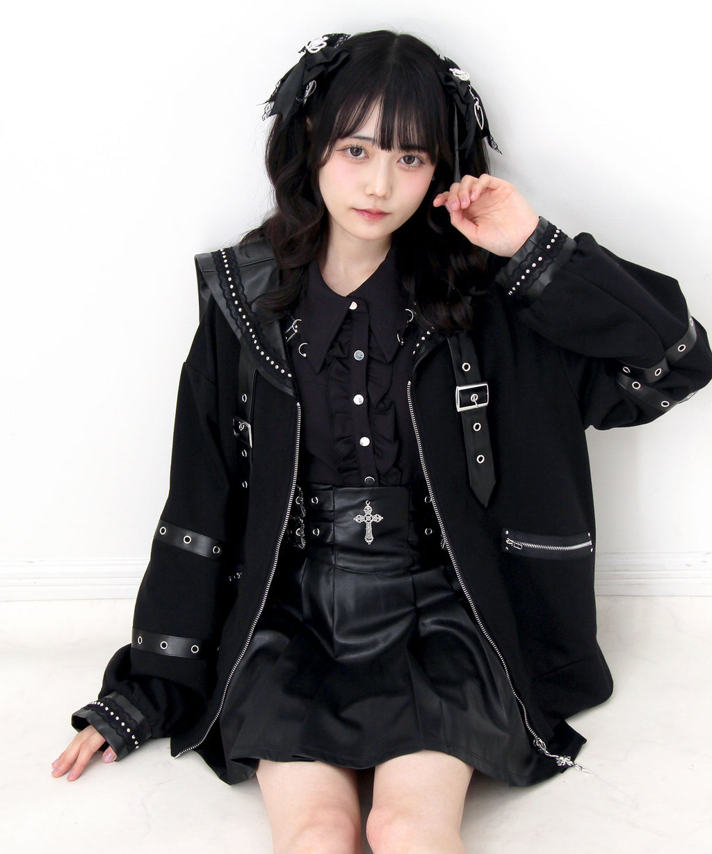 フロントはクロスチャーム付きファスナーで、細部までゴシックムードを演出。