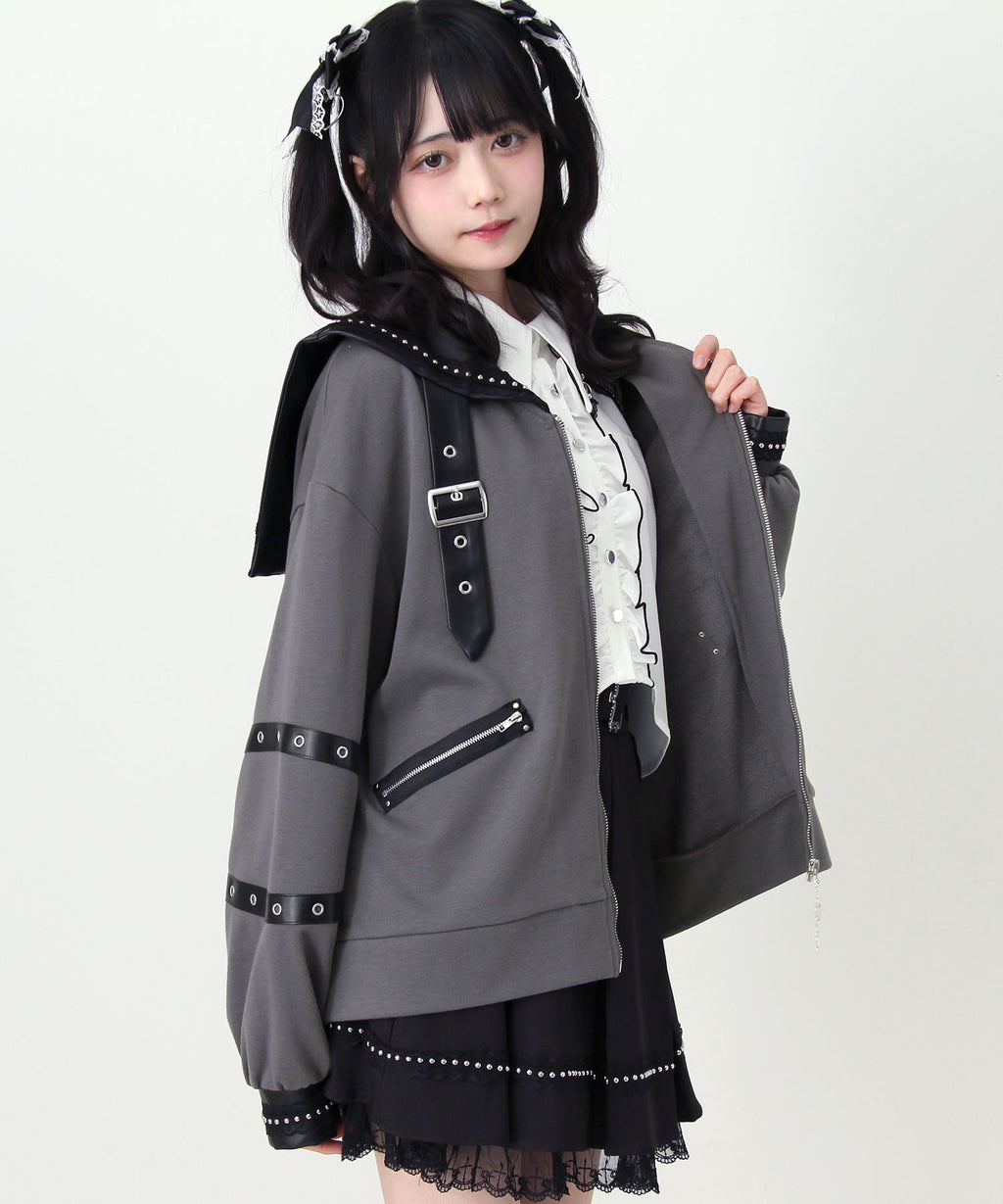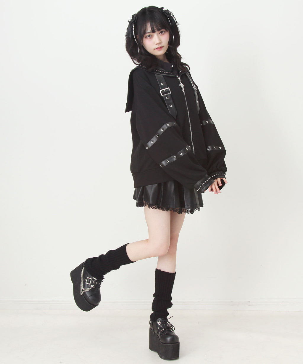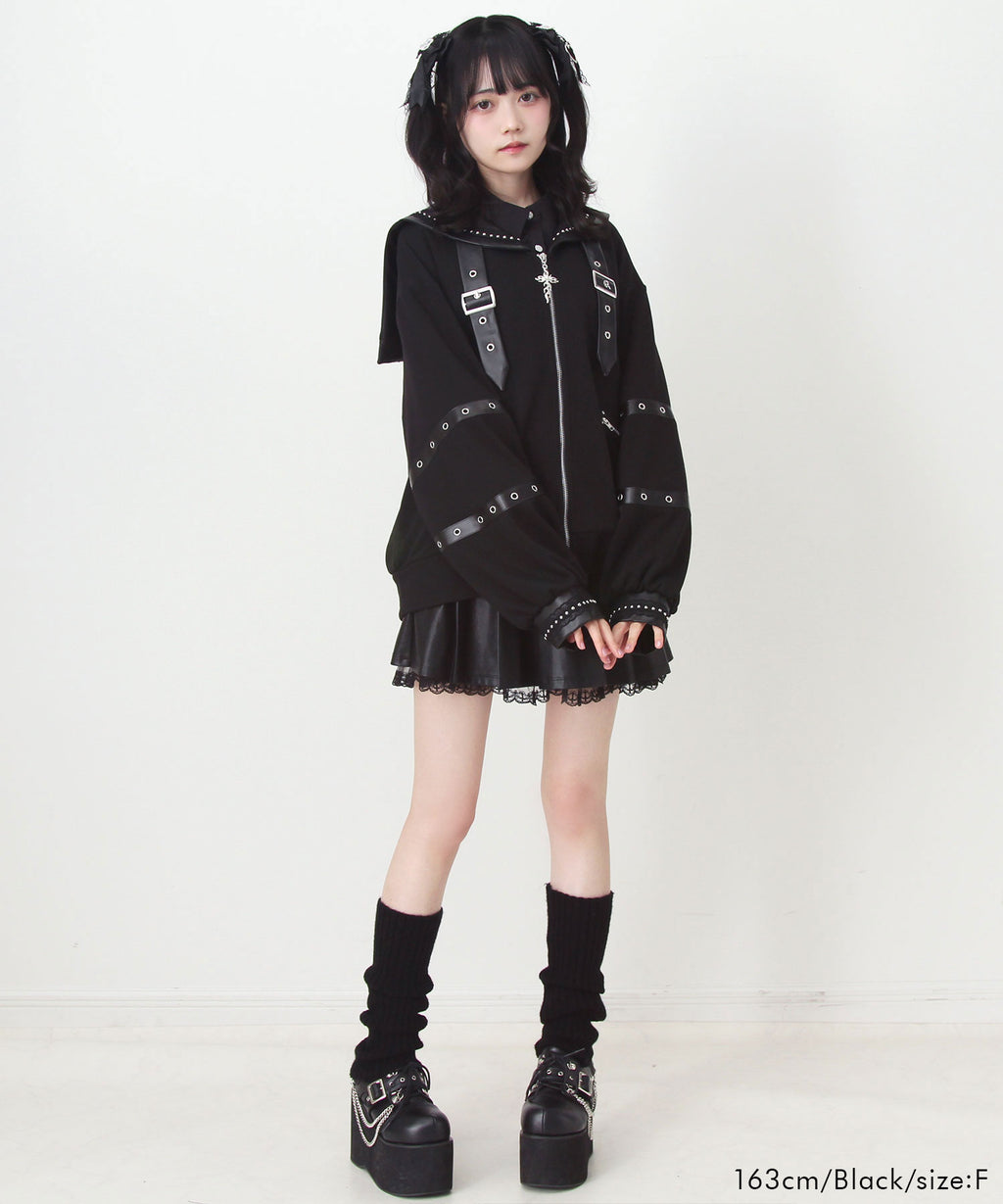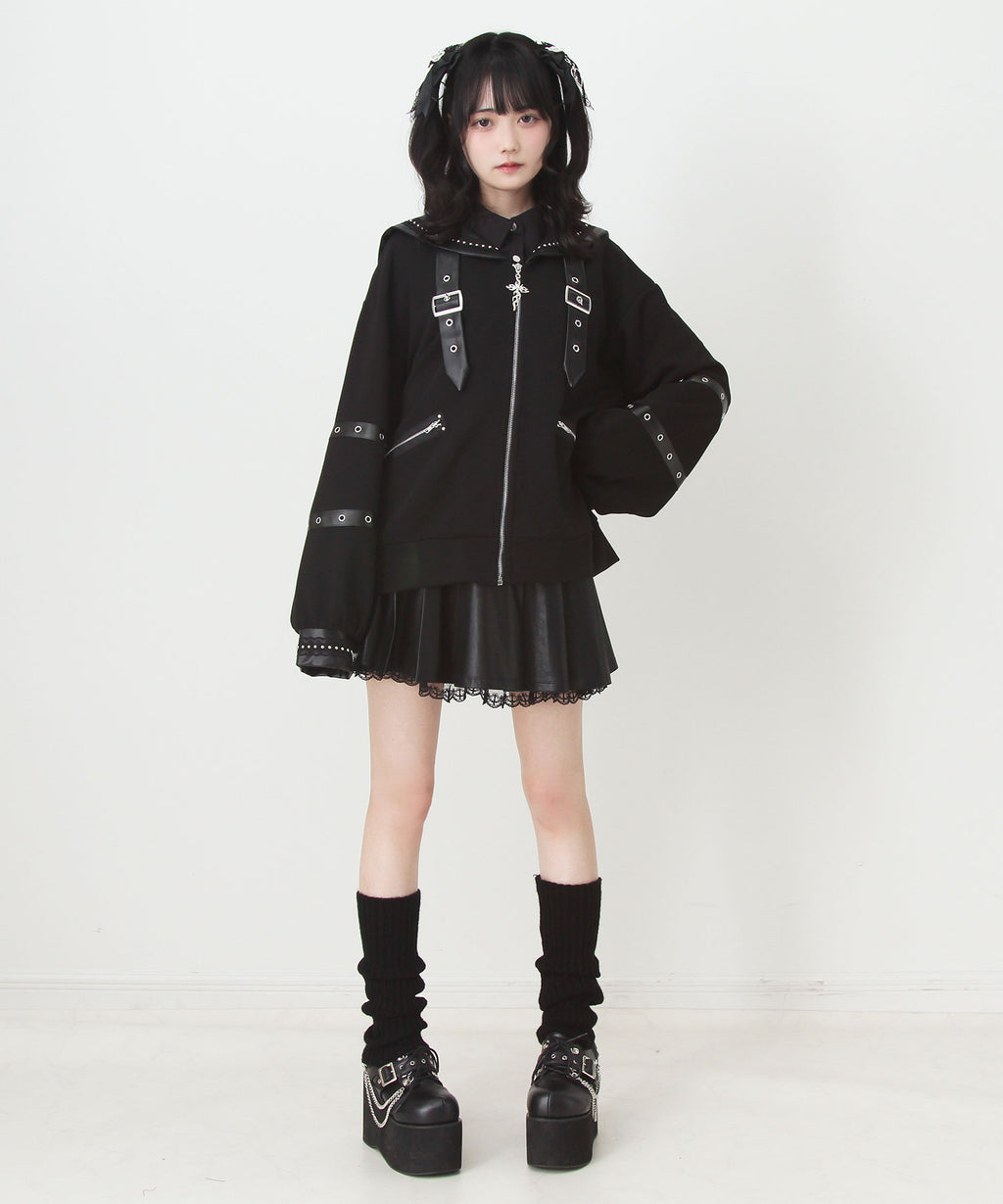 フロントはクロスチャーム付きファスナーで、細部までゴシックムードを演出。
