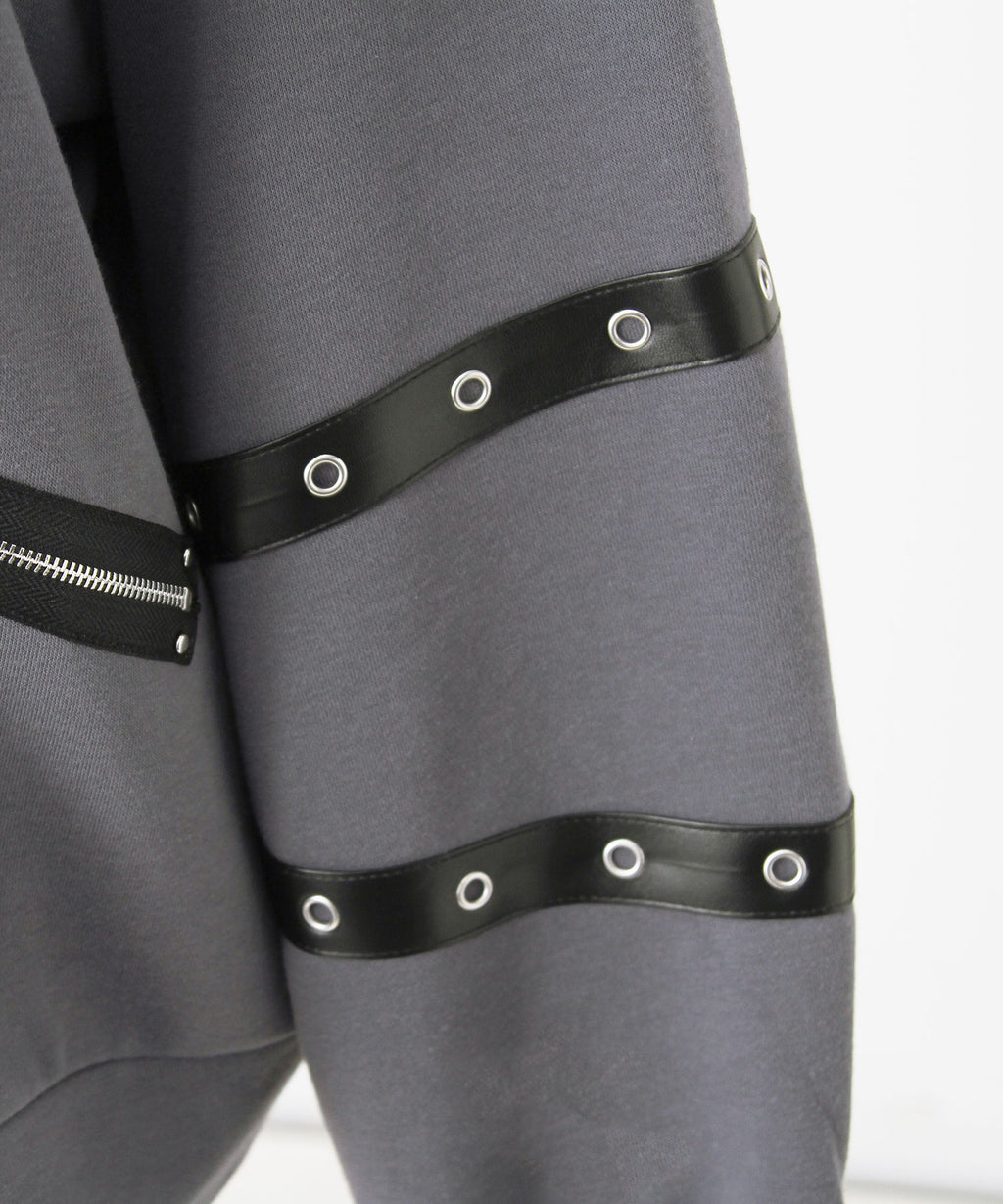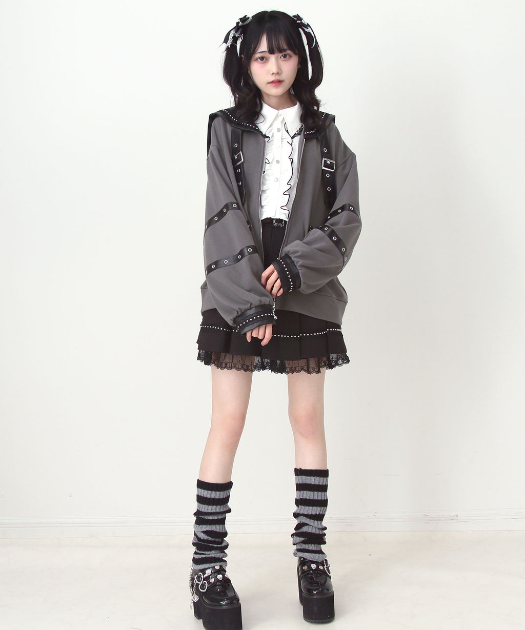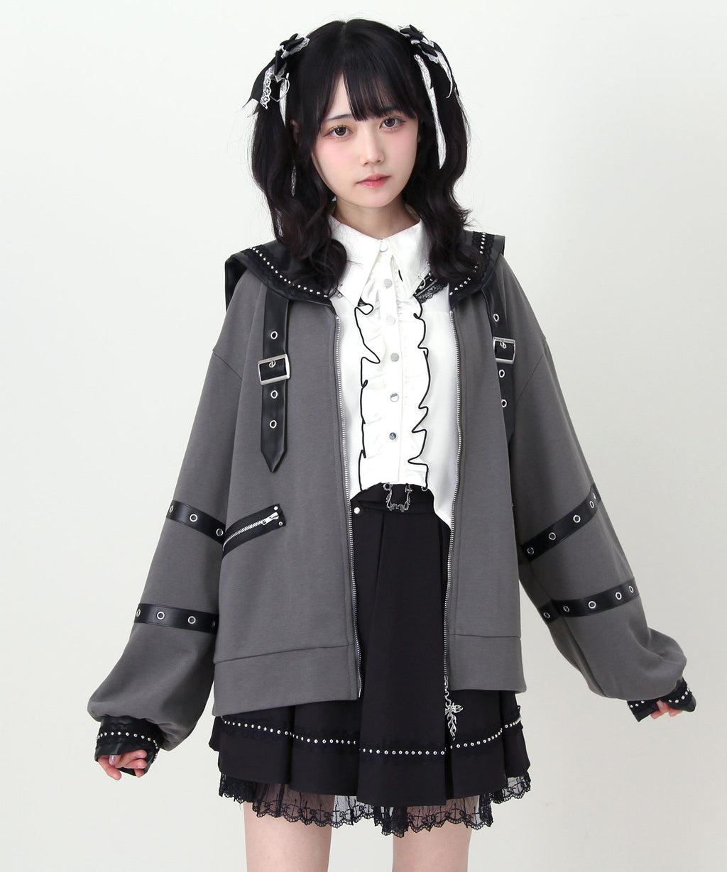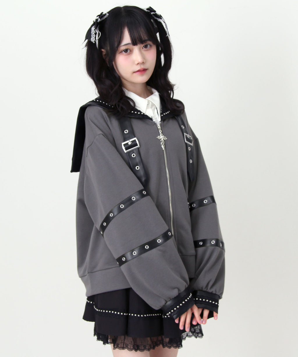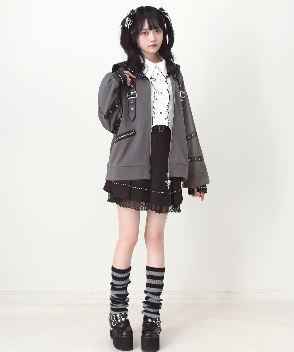 フロントはクロスチャーム付きファスナーで、細部までゴシックムードを演出。