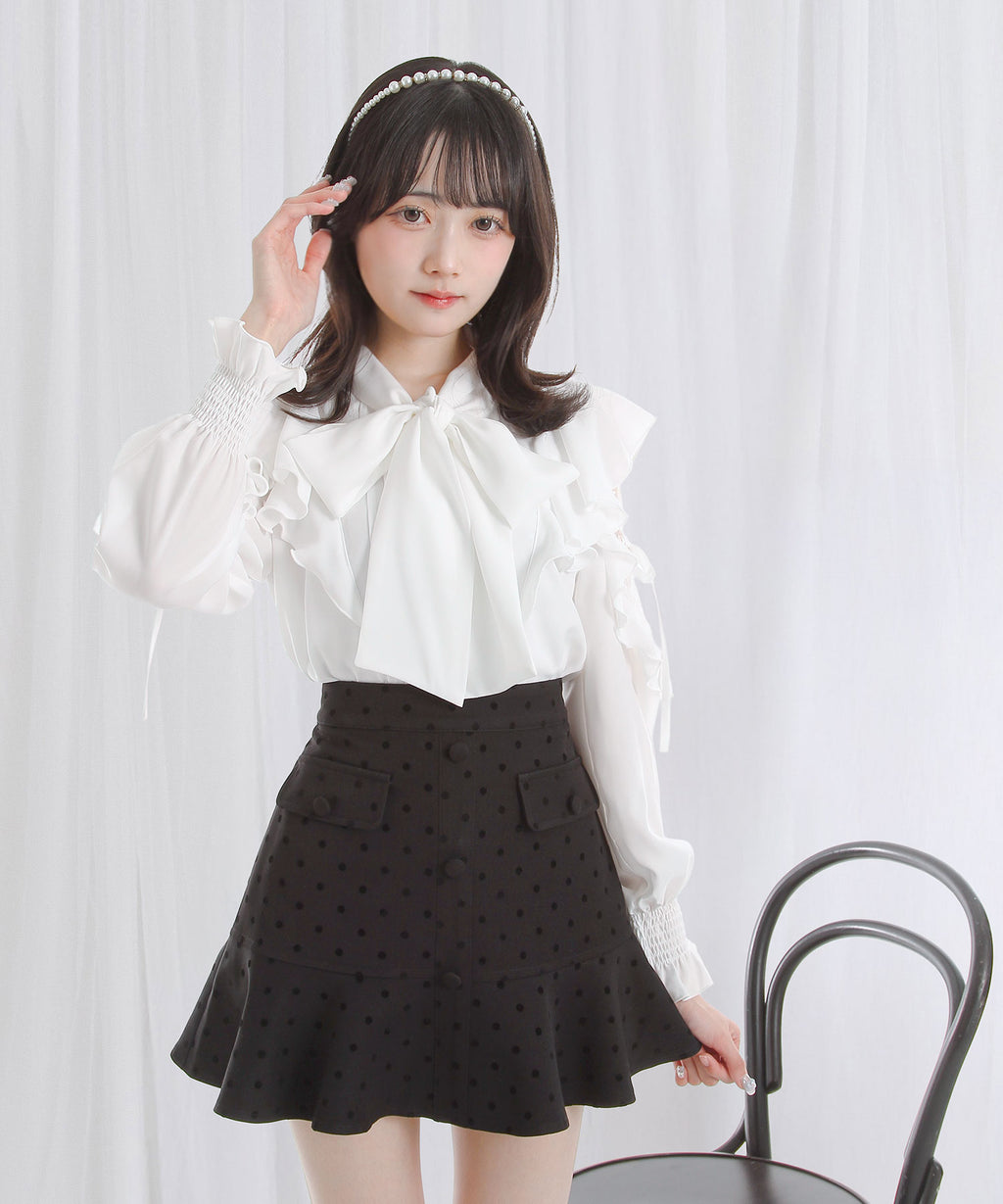 スカートは裾にフレアを施した切り替えデザイン。脚のラインを綺麗に見せつつ、大人ガーリーな動きをプラス◎
