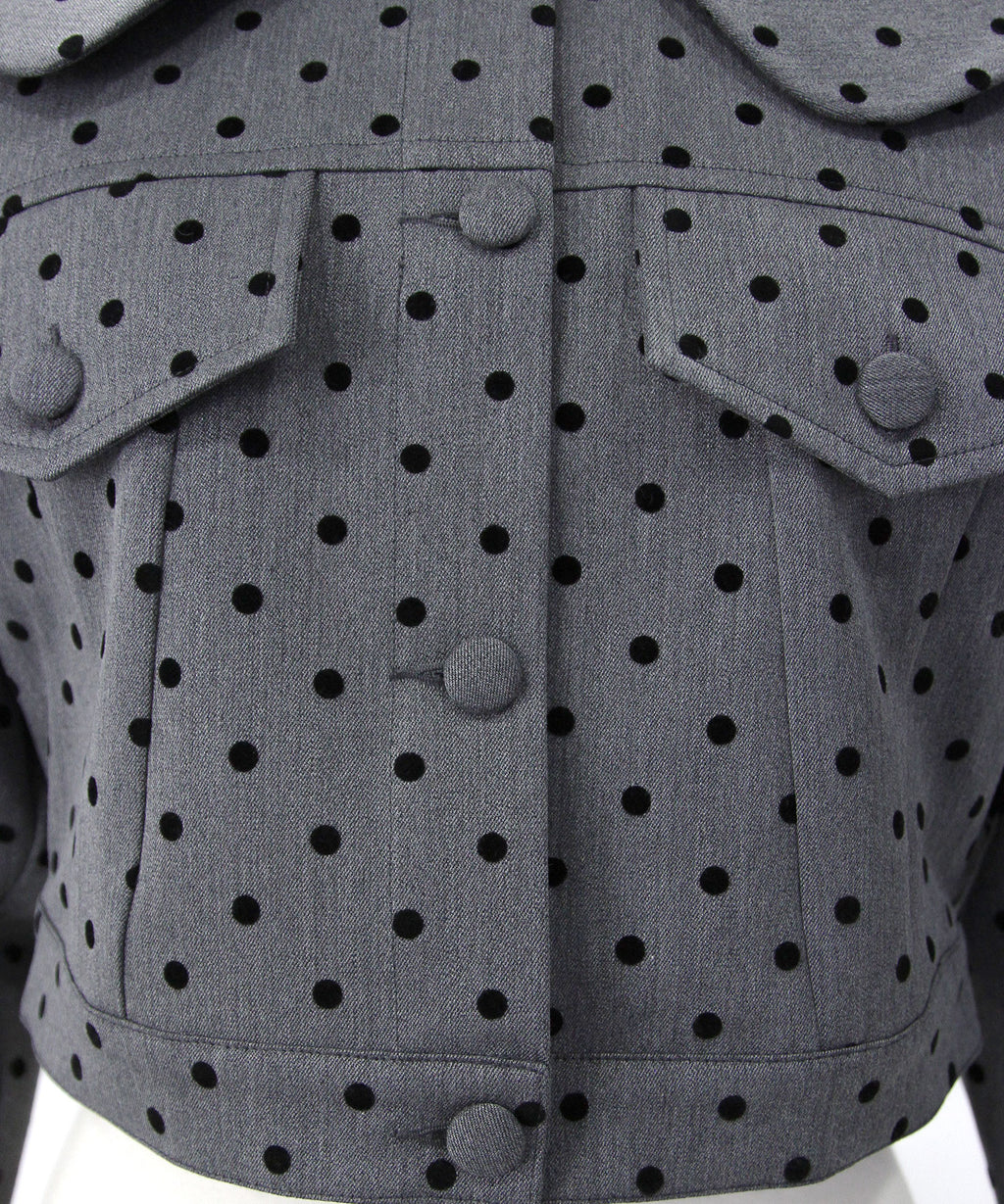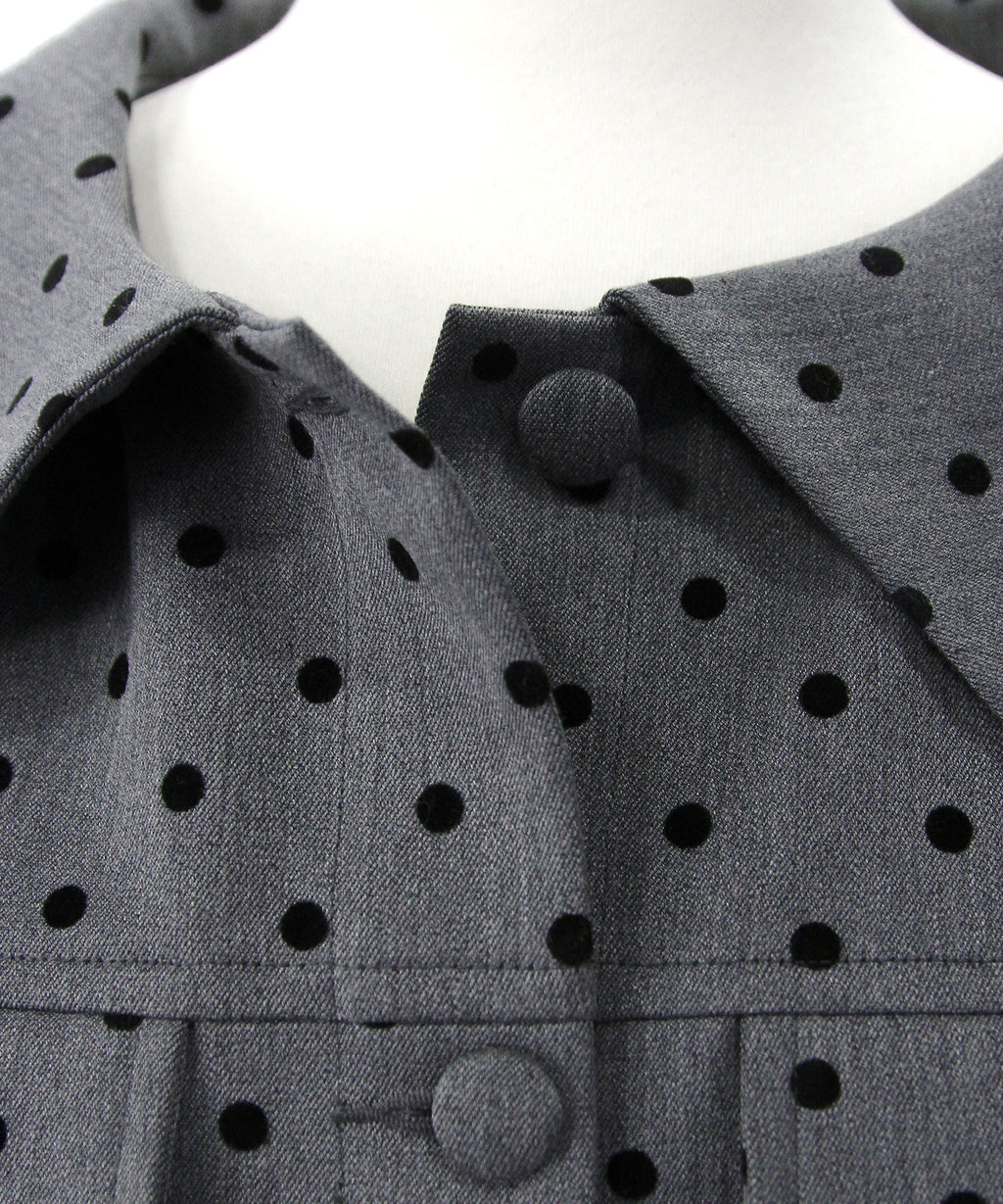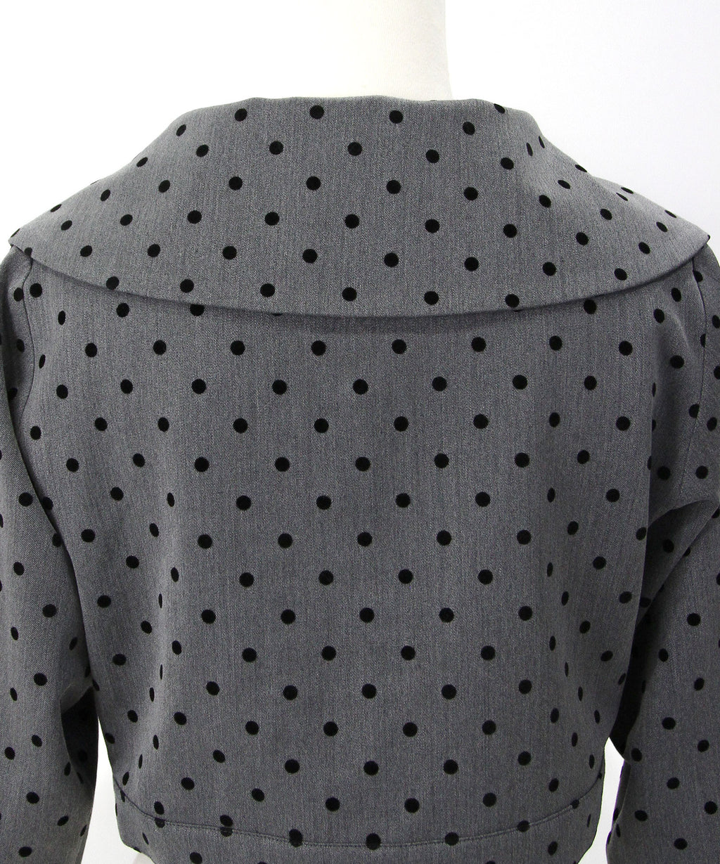 クラシカルなドット柄が目を惹く、ショートジャケットとミニスカートのセットアップ。