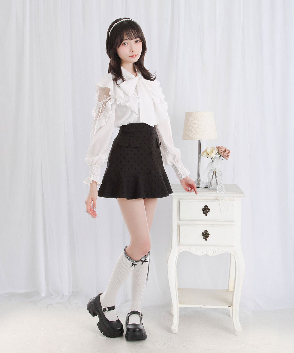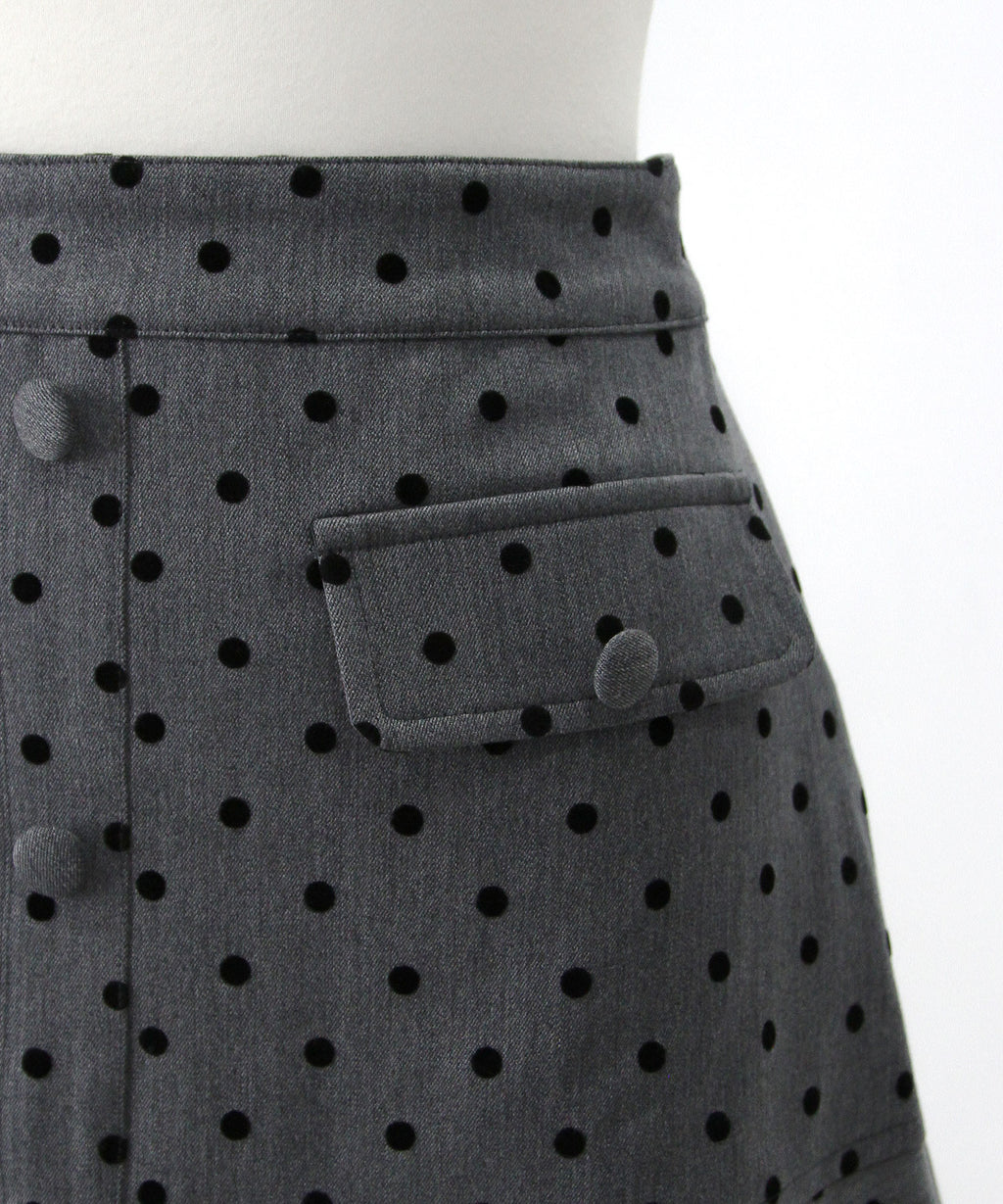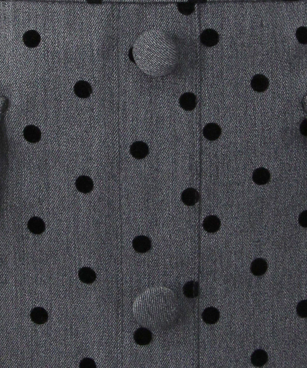 クラシカルなドット柄が目を惹く、ショートジャケットとミニスカートのセットアップ。