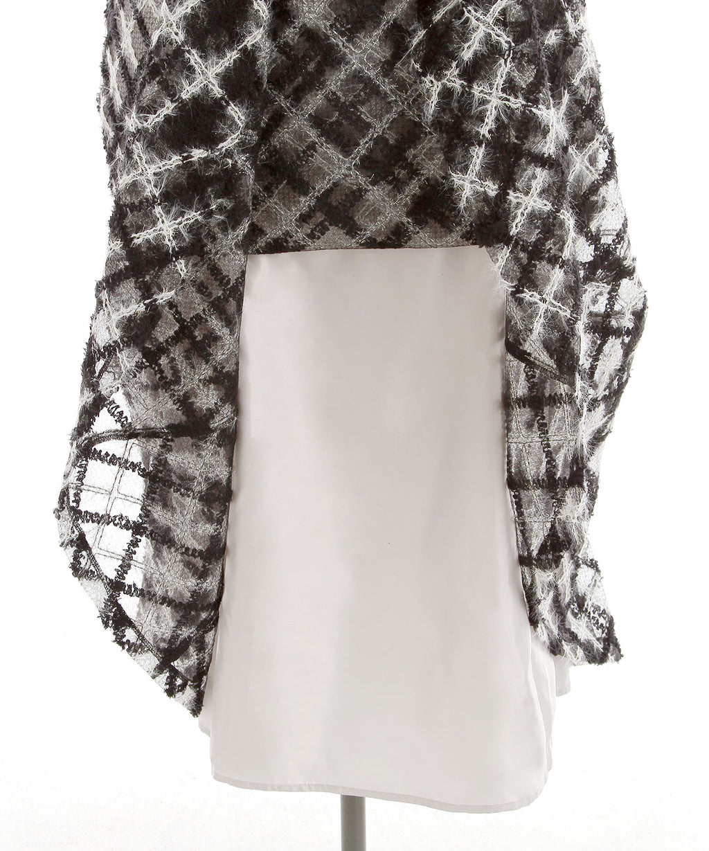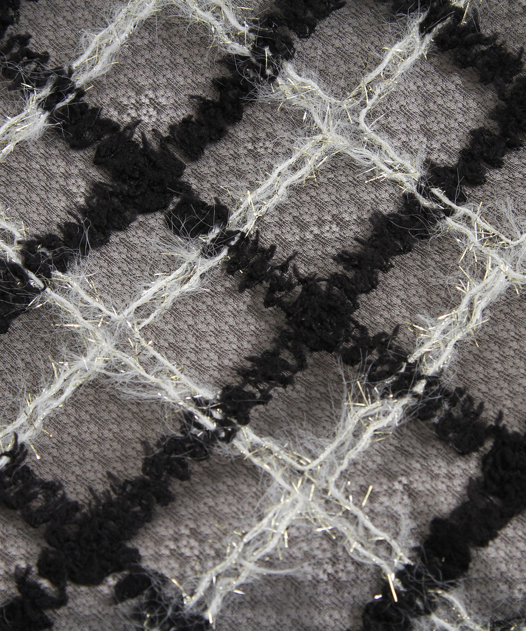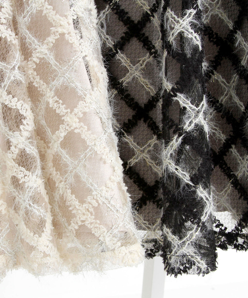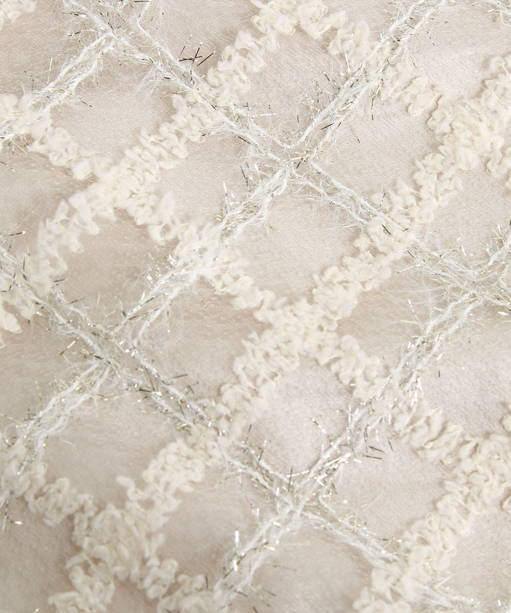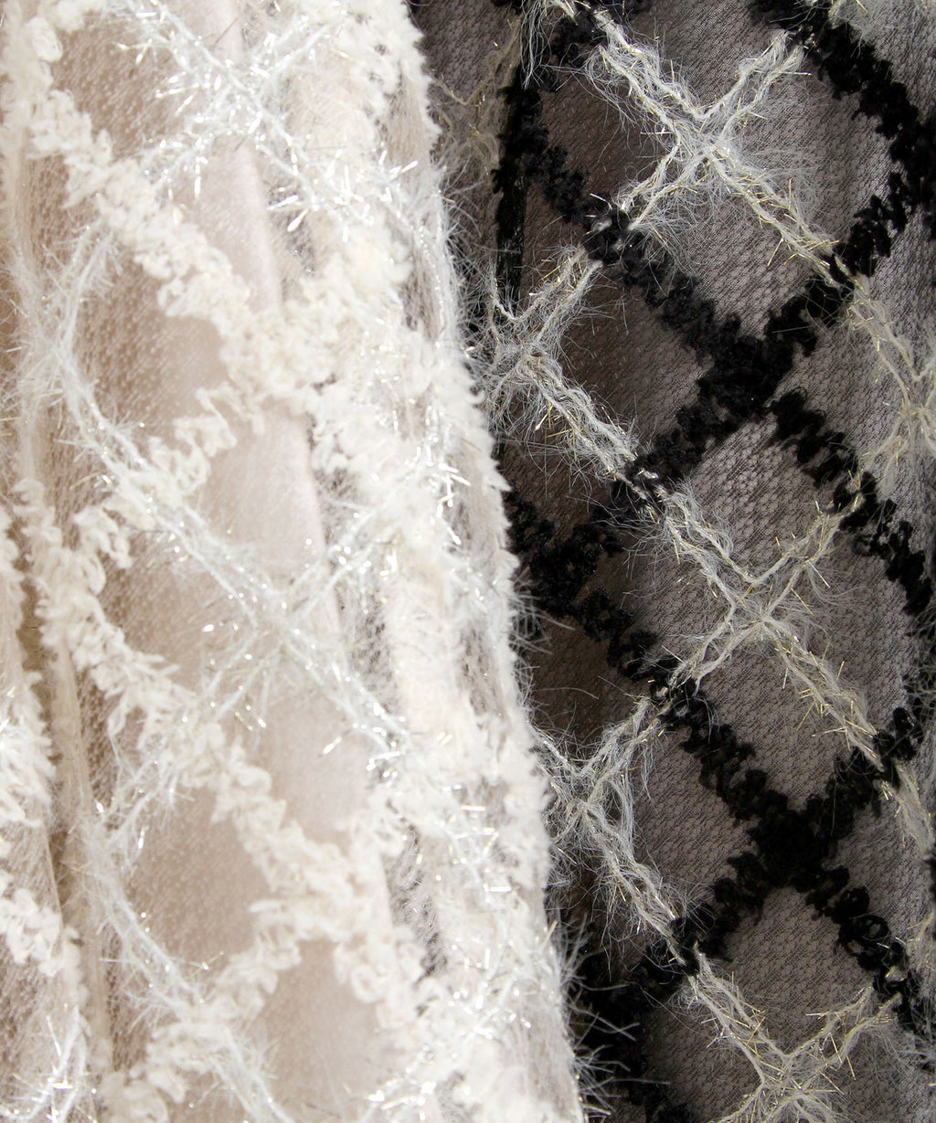きらきらのラメ糸とフェザー糸がMIXされた、立体感のあるツイード生地が魅力的なデザイン。