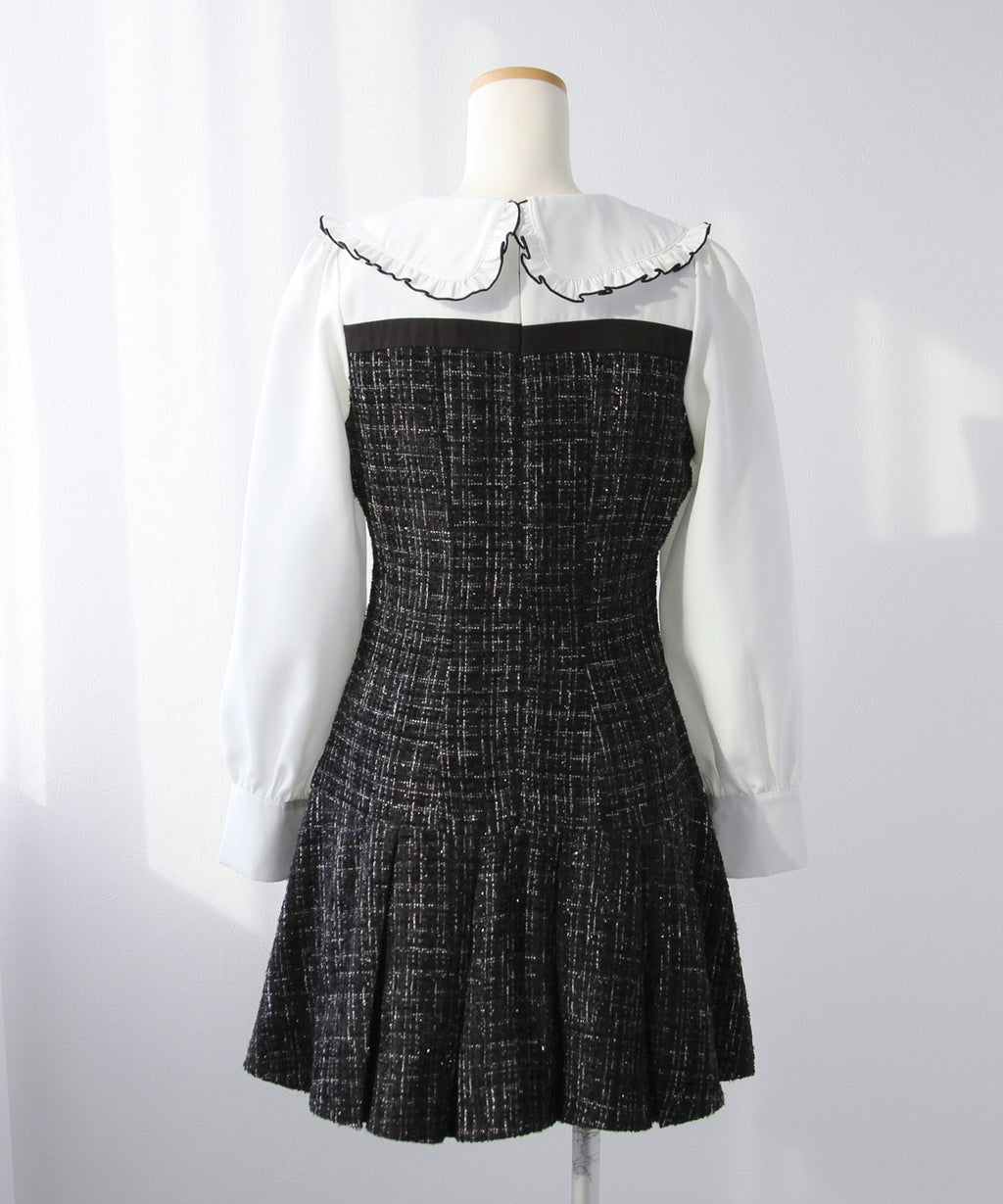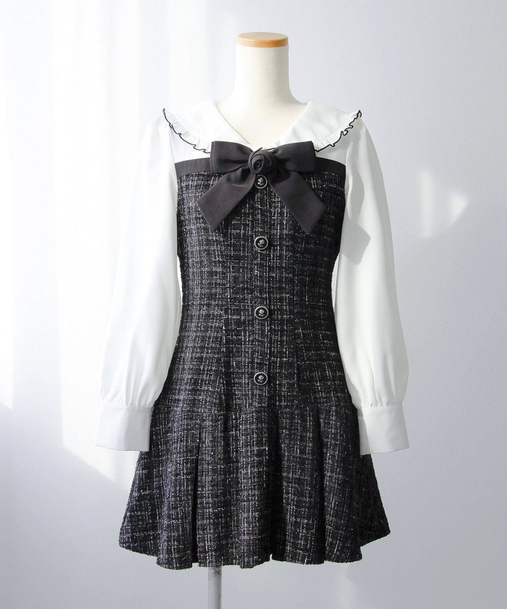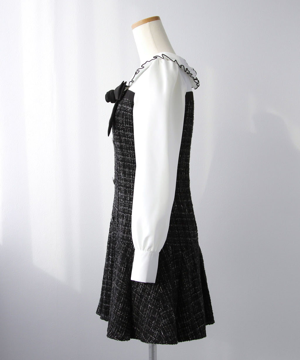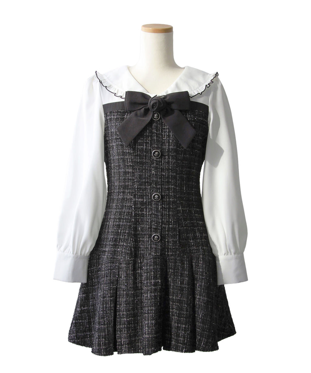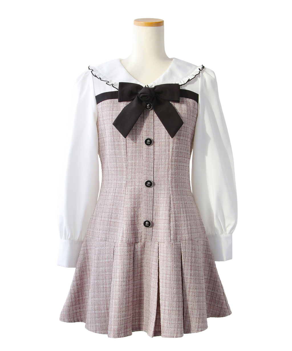 上品なツイード素材とブラウスを重ね着したような、ドッキングデザインのミニワンピース。