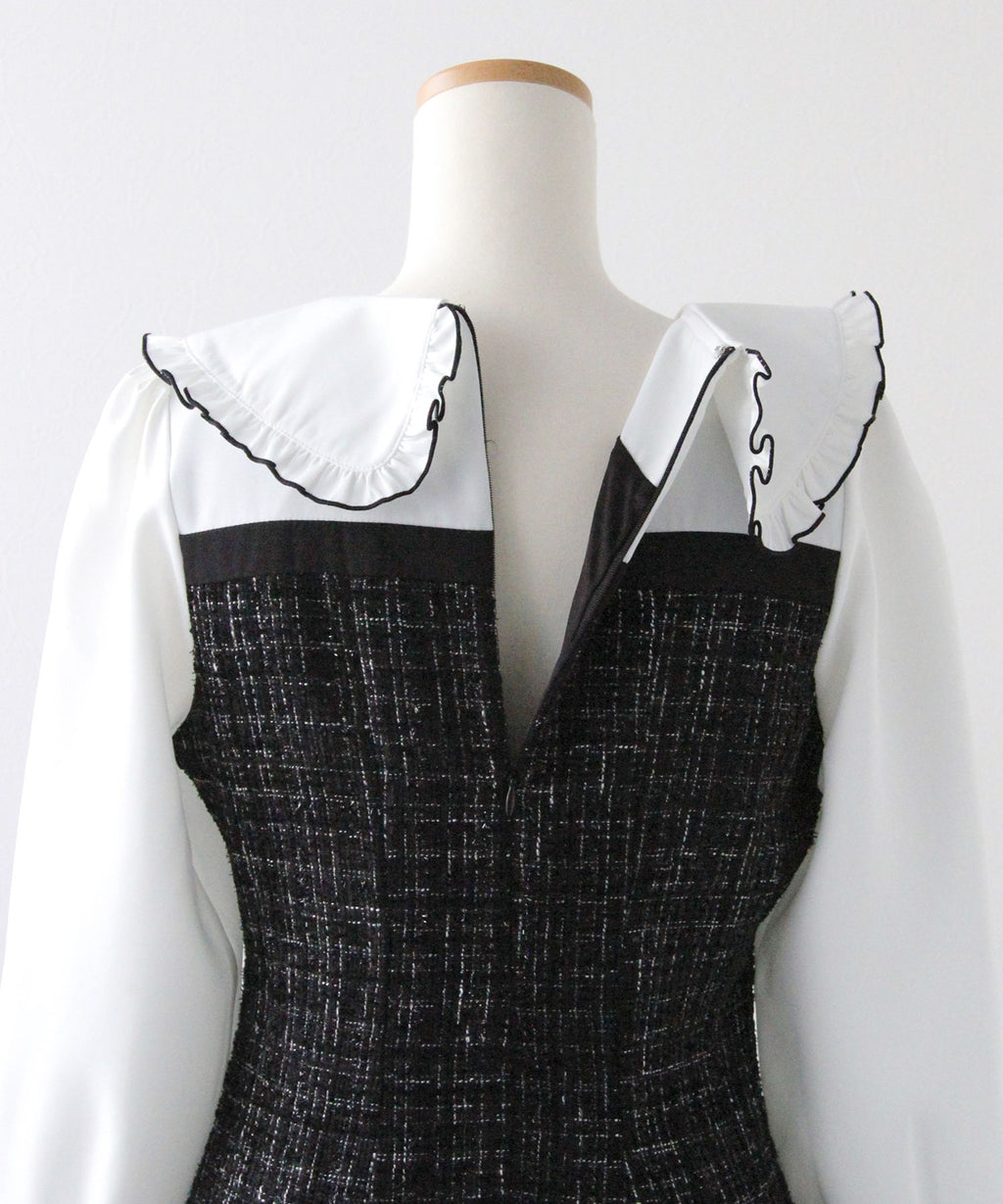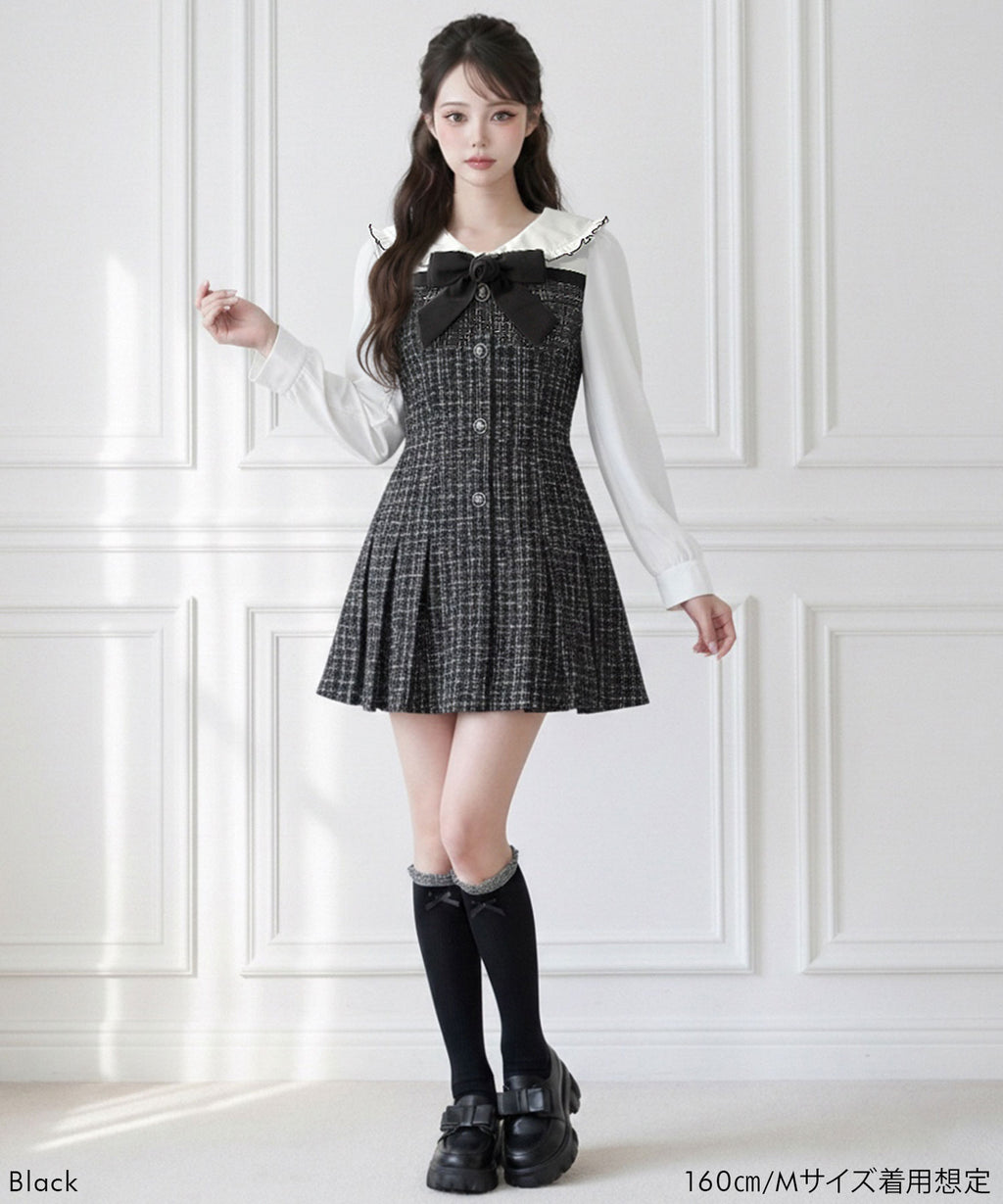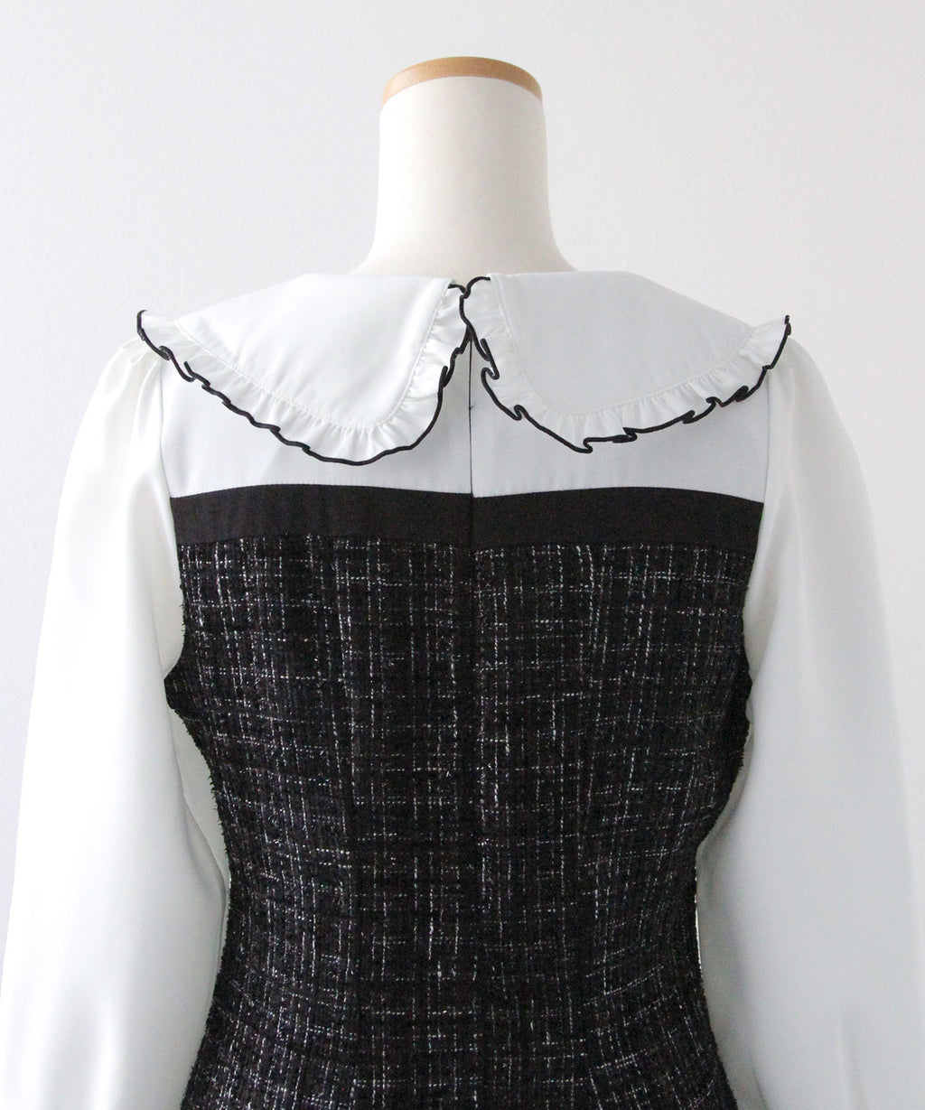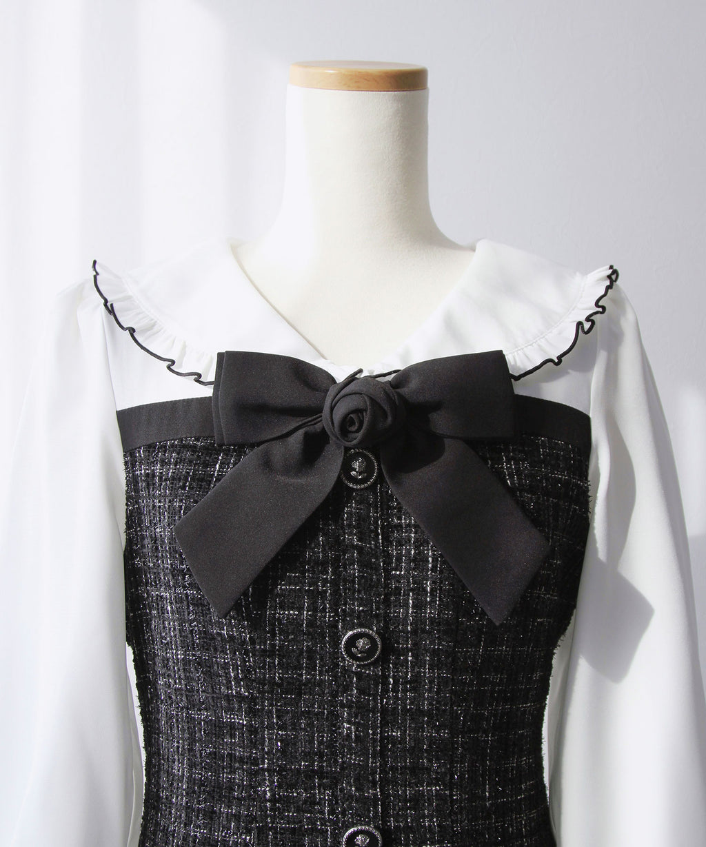 上品なツイード素材とブラウスを重ね着したような、ドッキングデザインのミニワンピース。