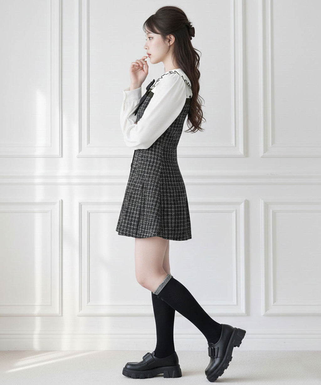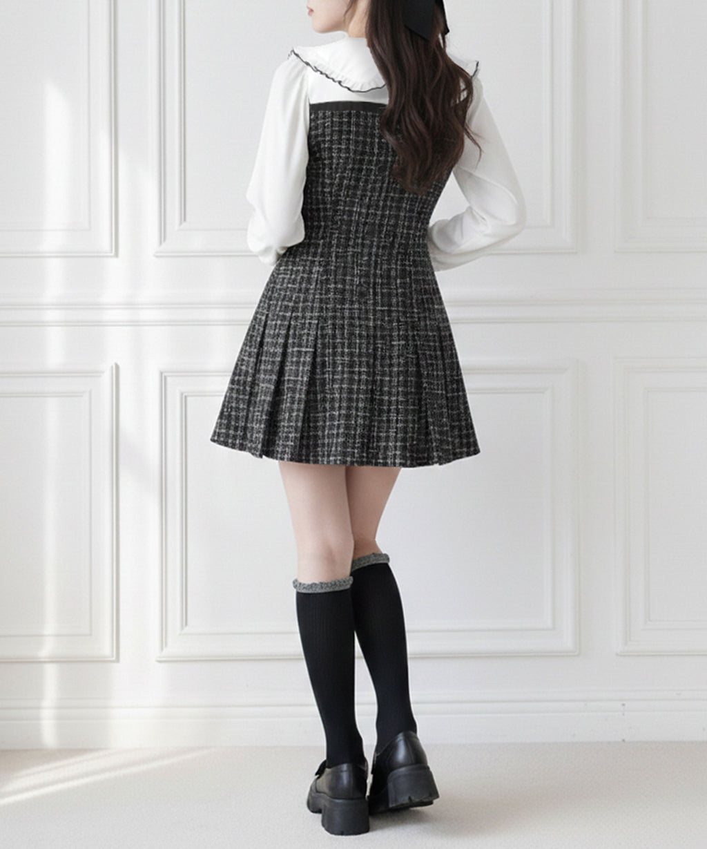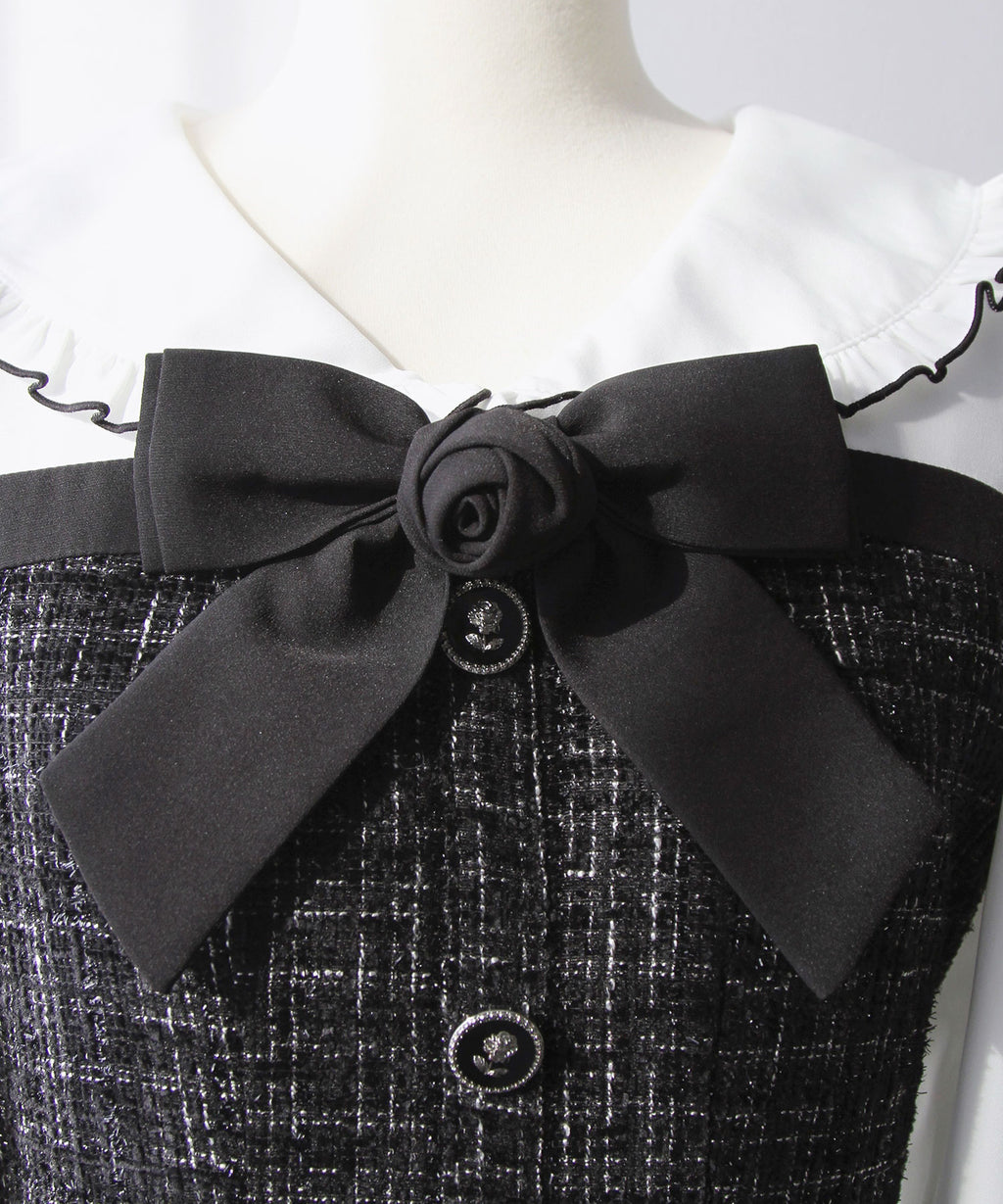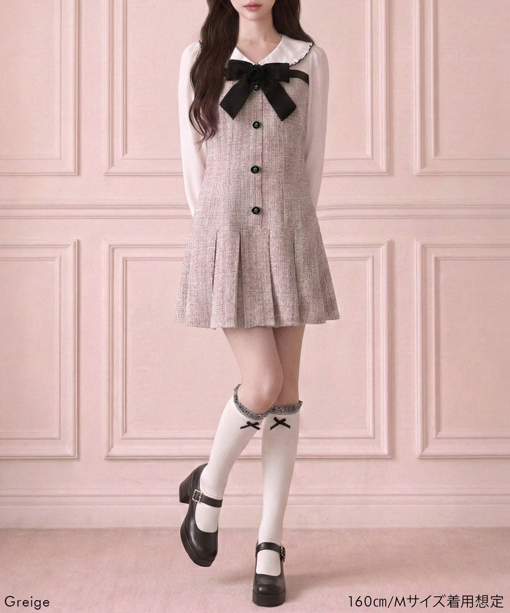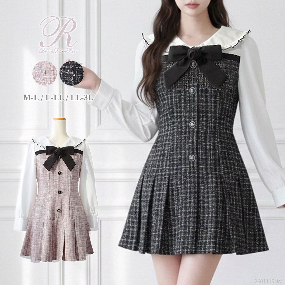 上品なツイード素材とブラウスを重ね着したような、ドッキングデザインのミニワンピース。