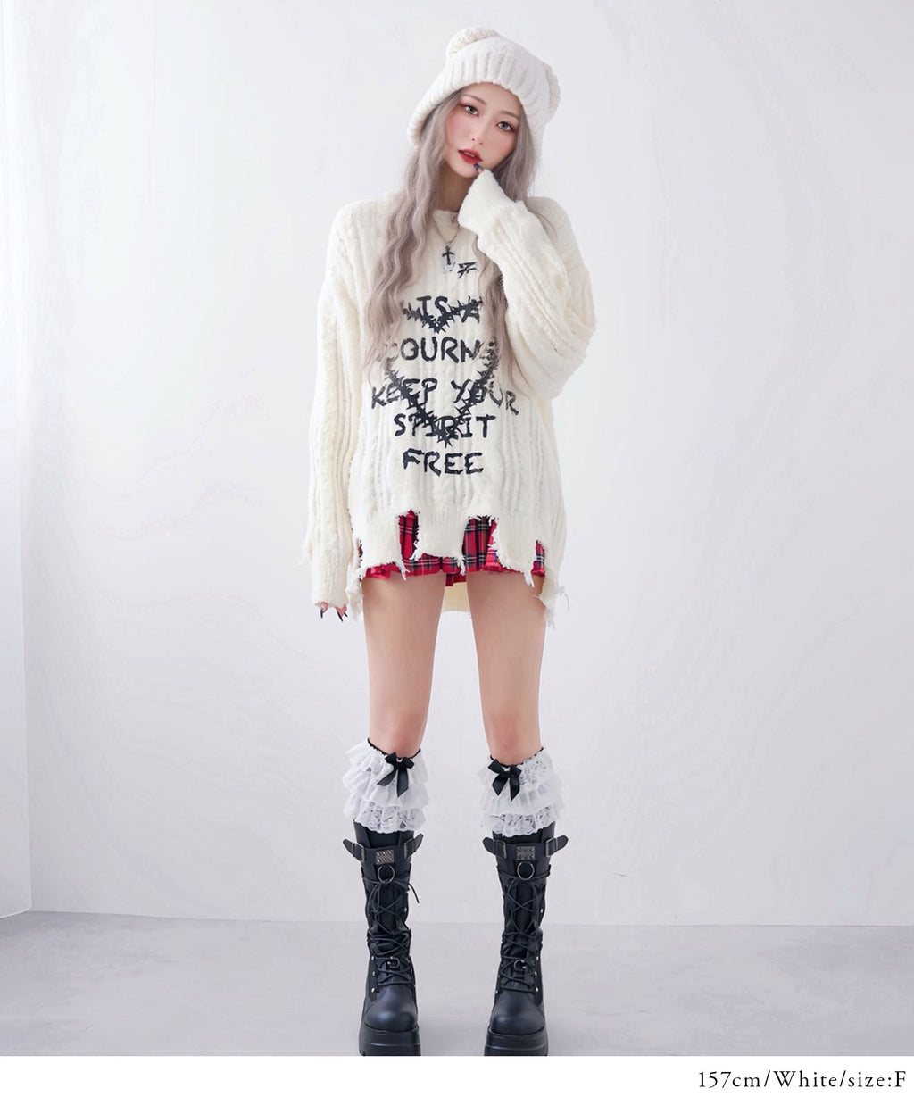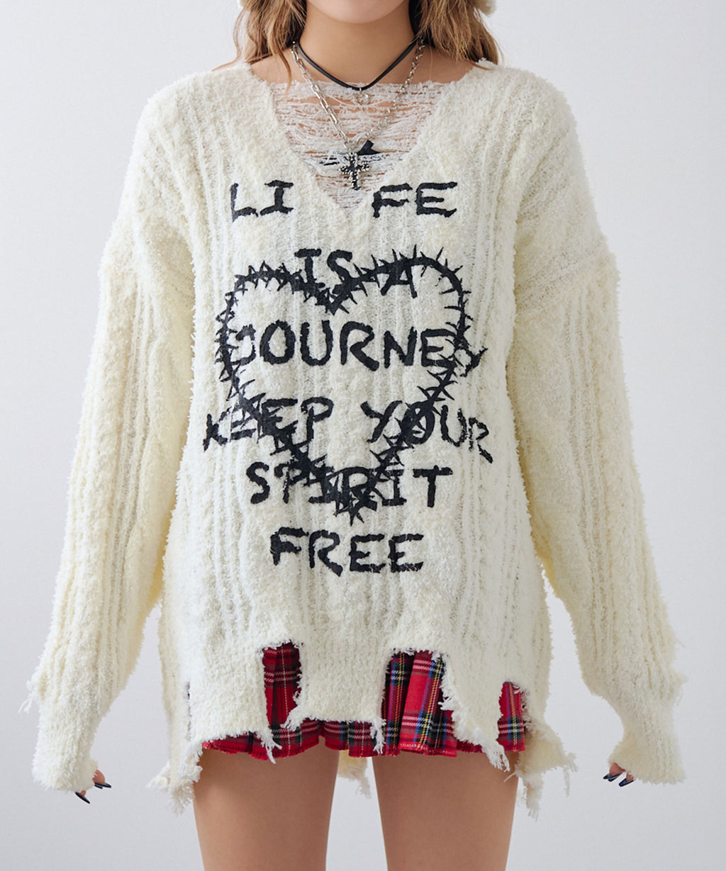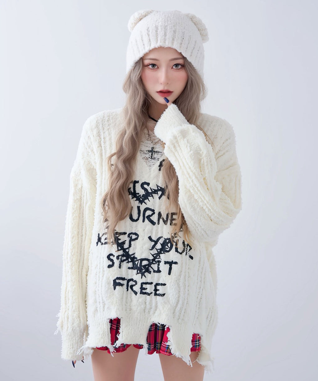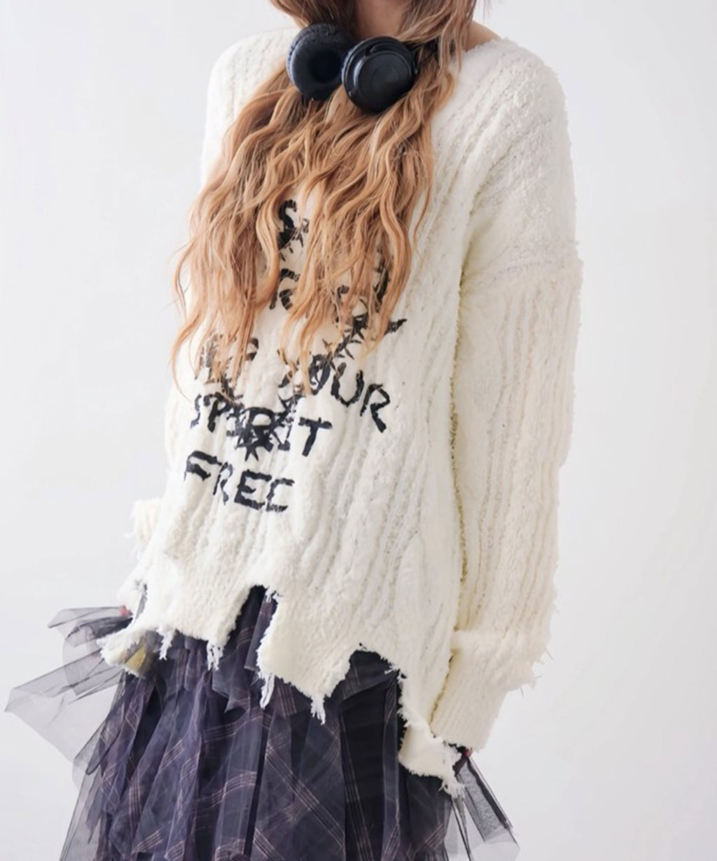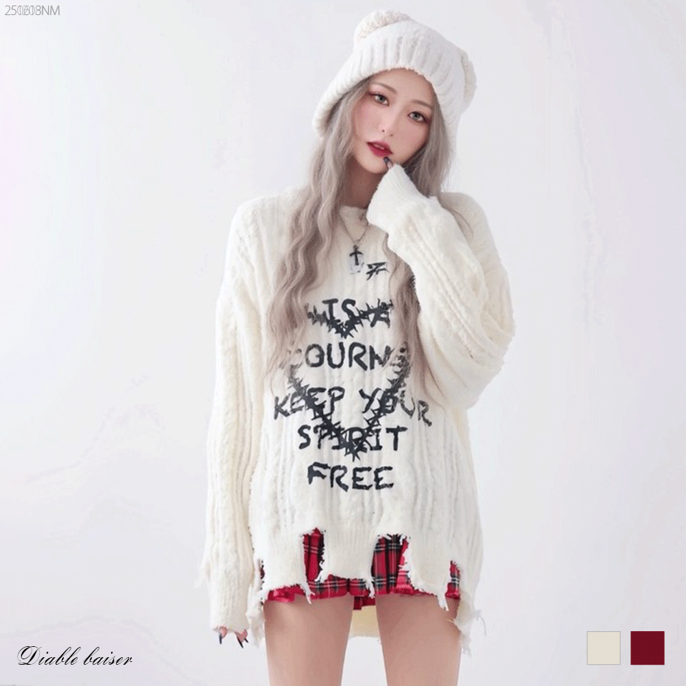 ゆるっと華奢見えするシルエットに、かすれ英字ロゴとダメージ風ディテールを組み合わせた、地雷系ムードたっぷりの長袖ニットトップス。