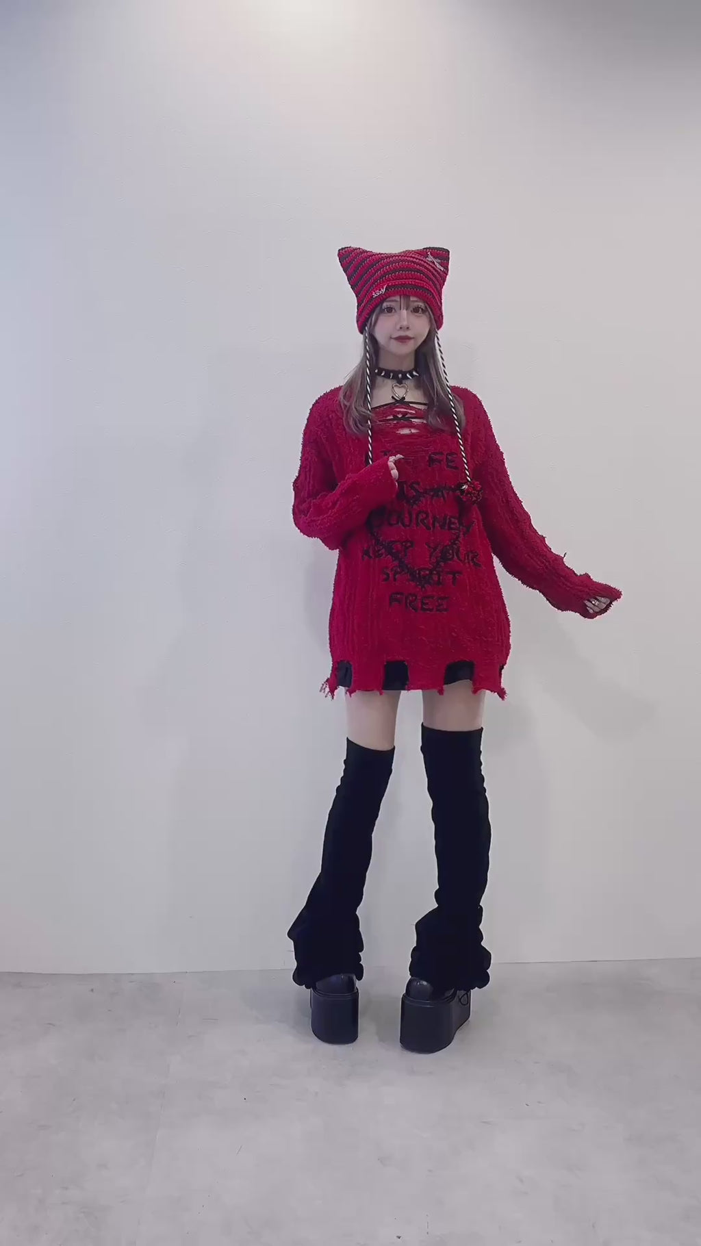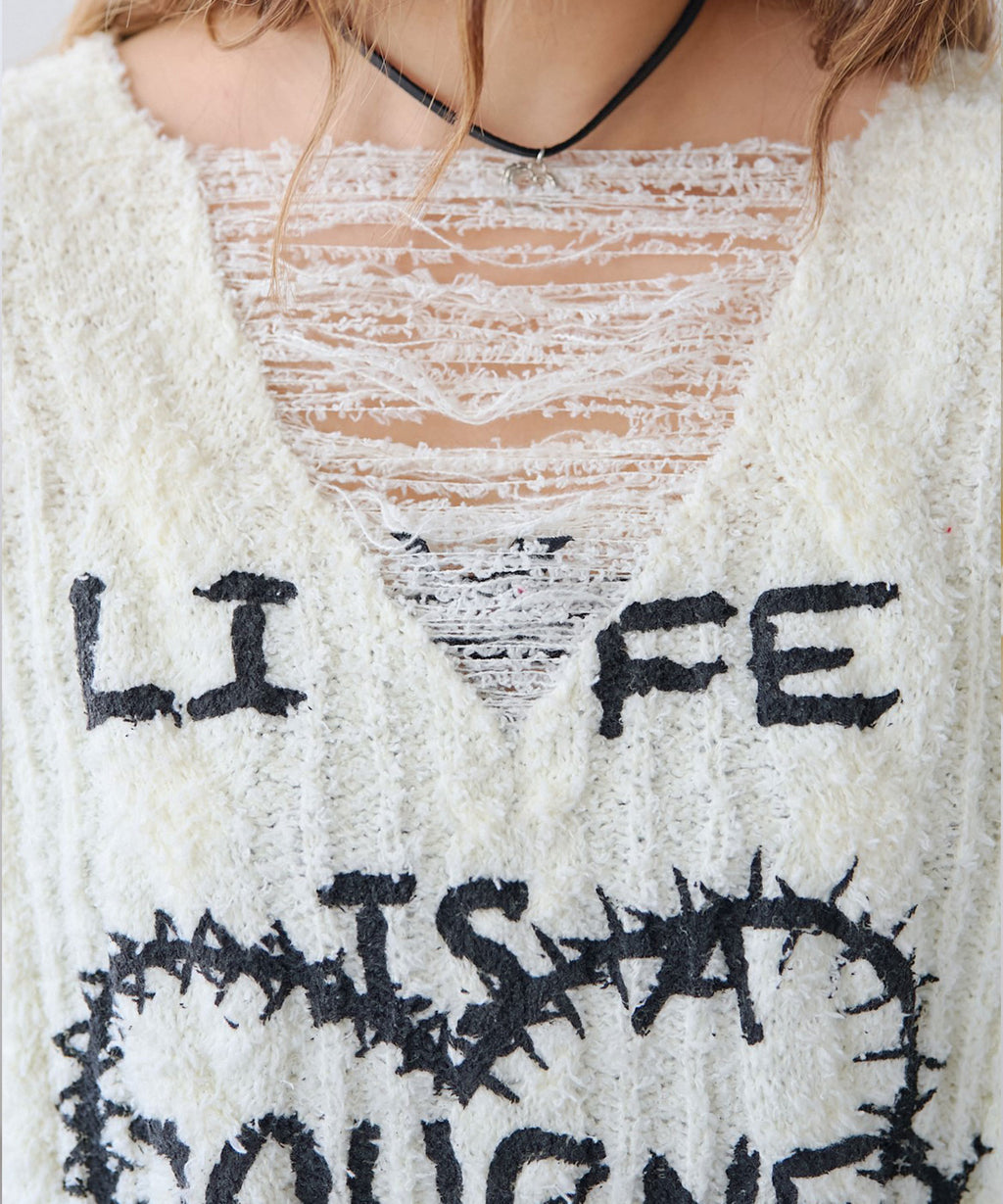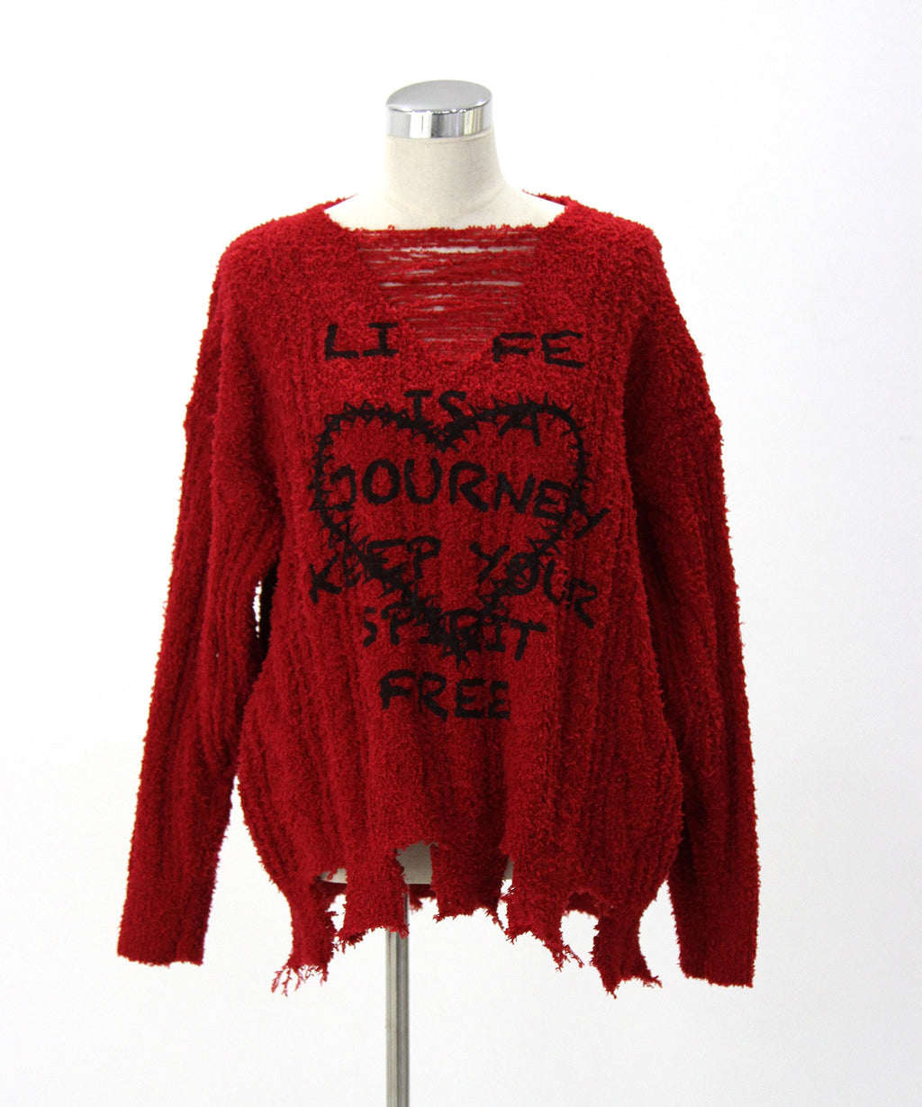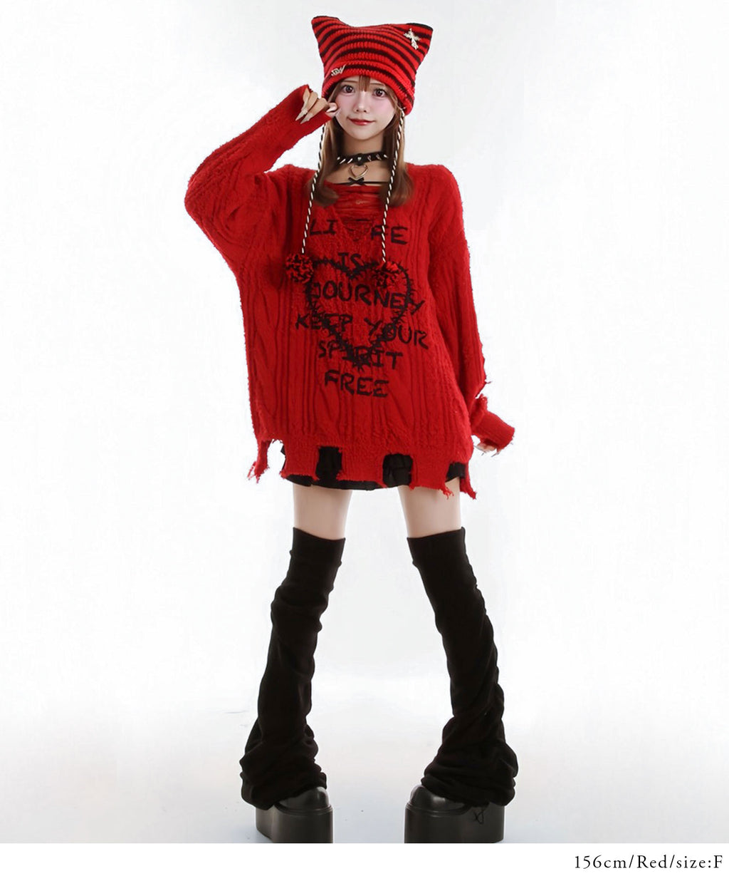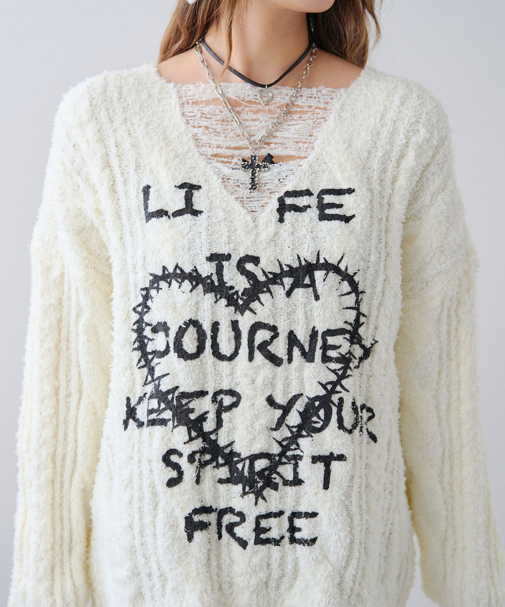 ゆるっと華奢見えするシルエットに、かすれ英字ロゴとダメージ風ディテールを組み合わせた、地雷系ムードたっぷりの長袖ニットトップス。