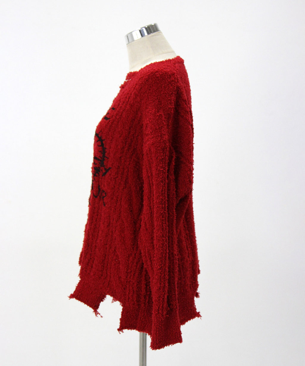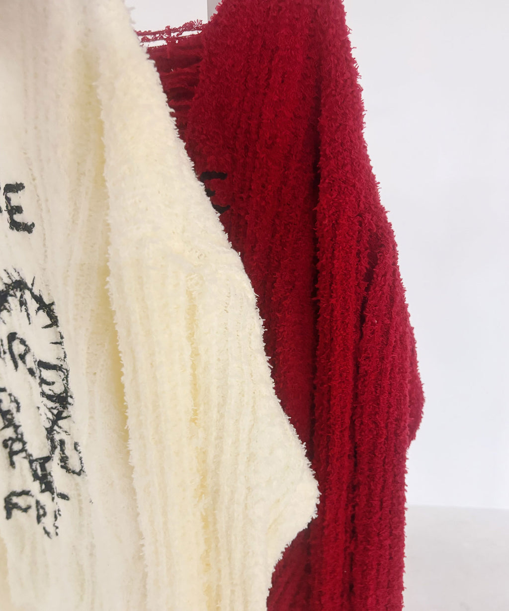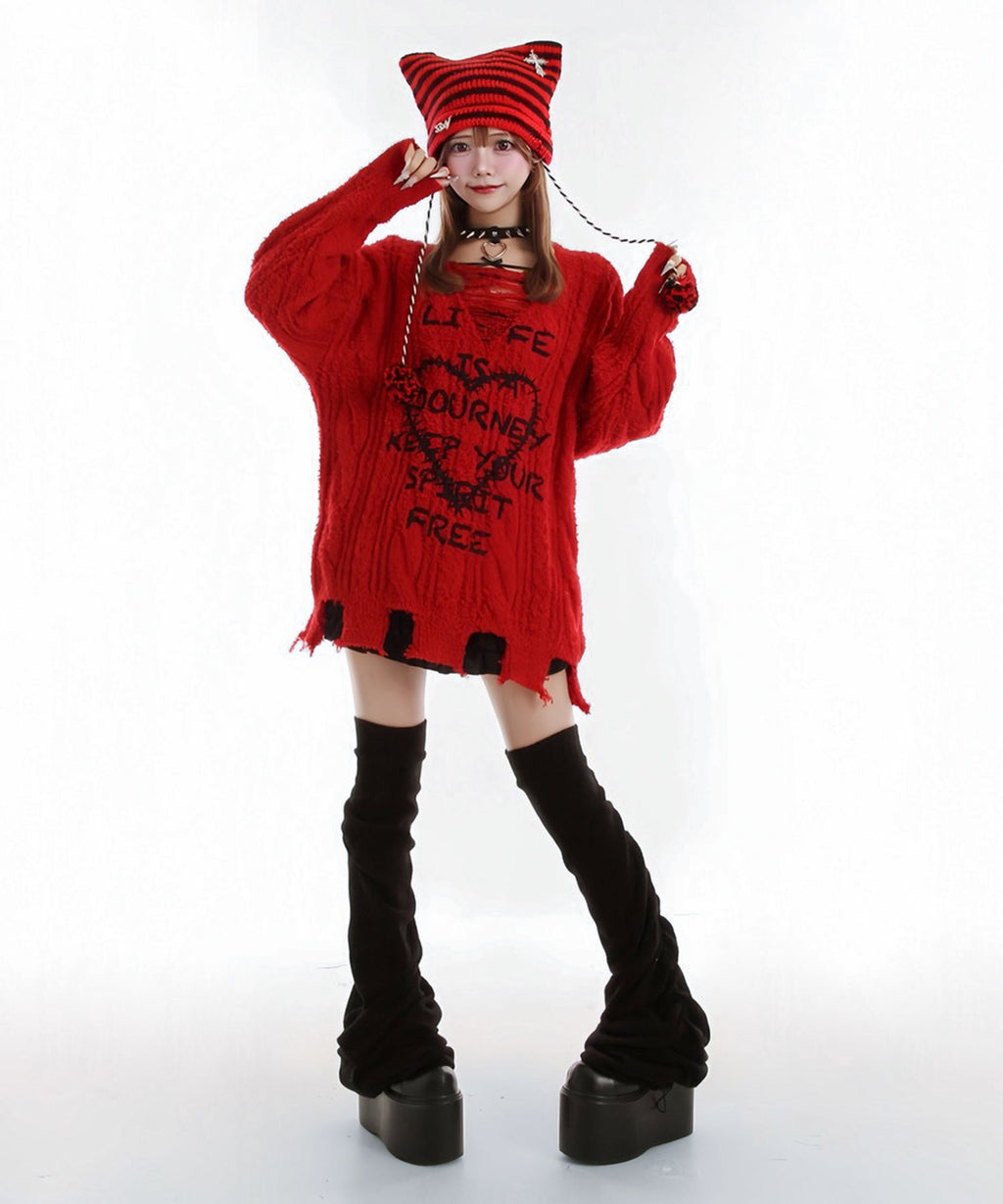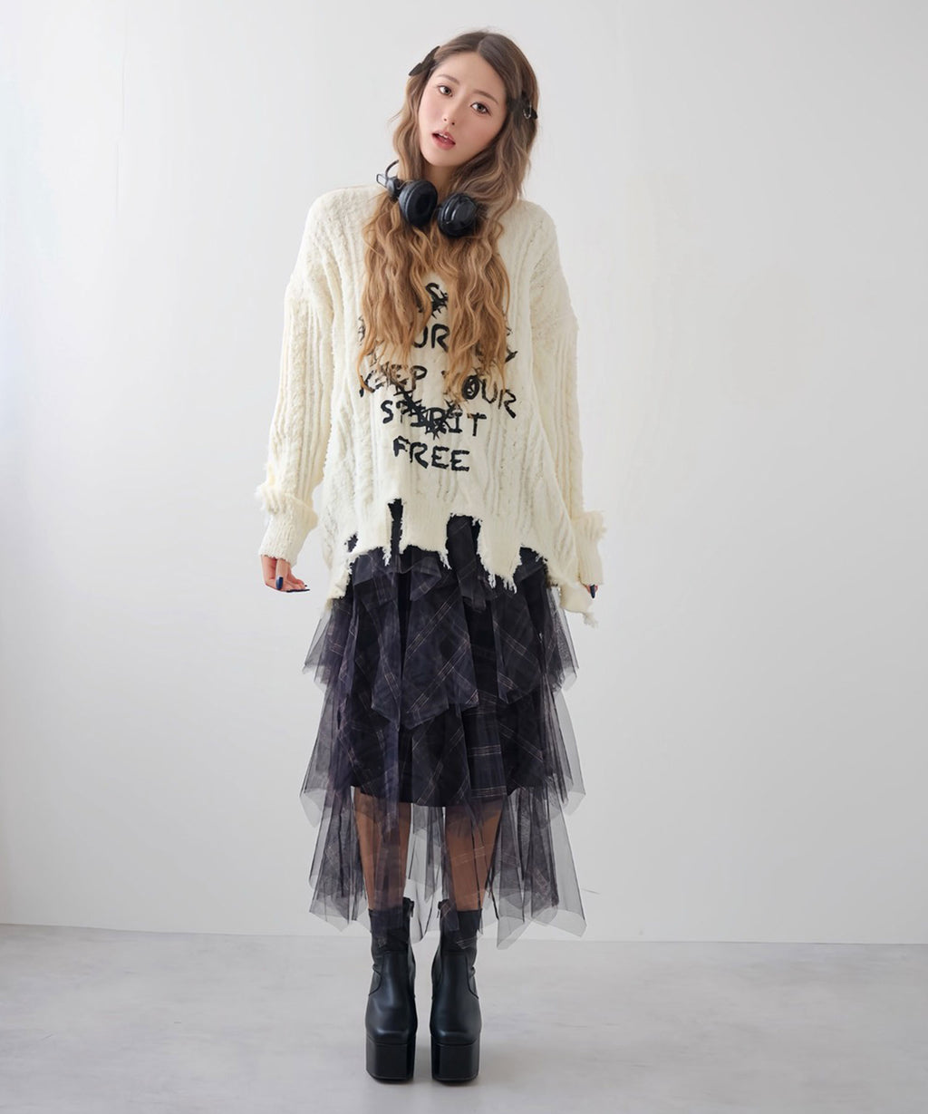 ゆるっと華奢見えするシルエットに、かすれ英字ロゴとダメージ風ディテールを組み合わせた、地雷系ムードたっぷりの長袖ニットトップス。