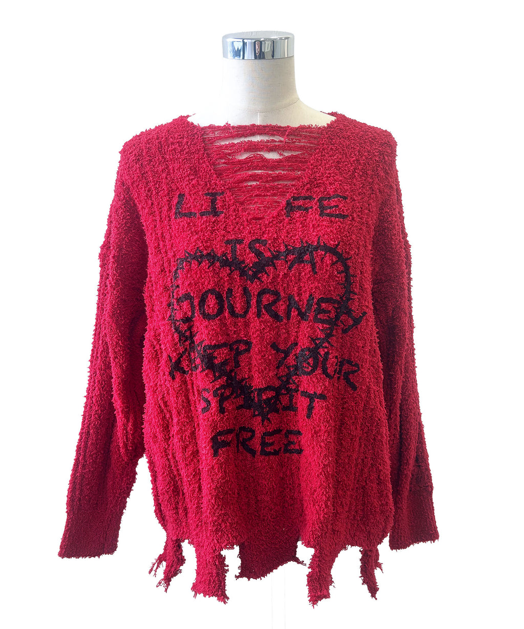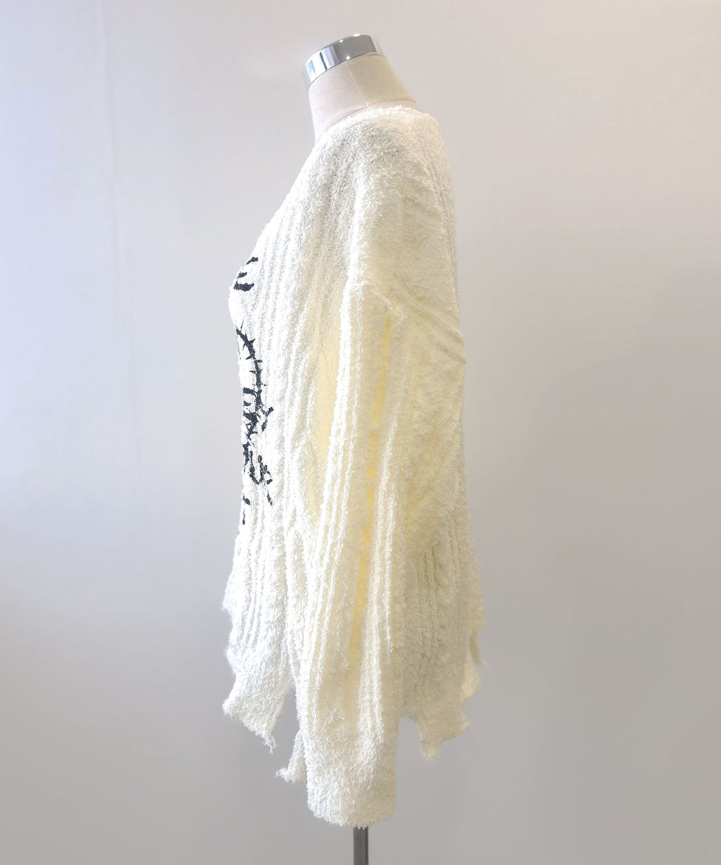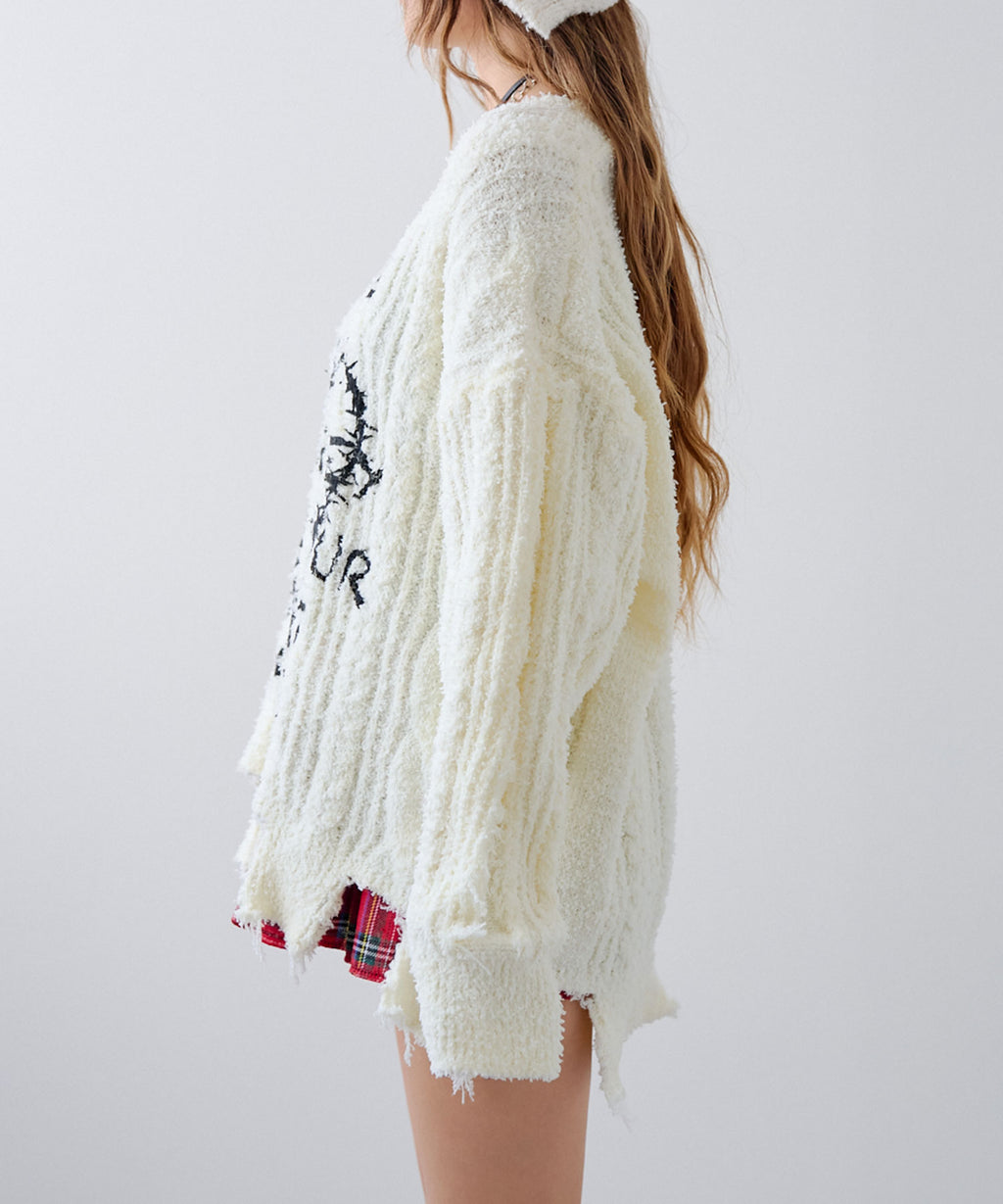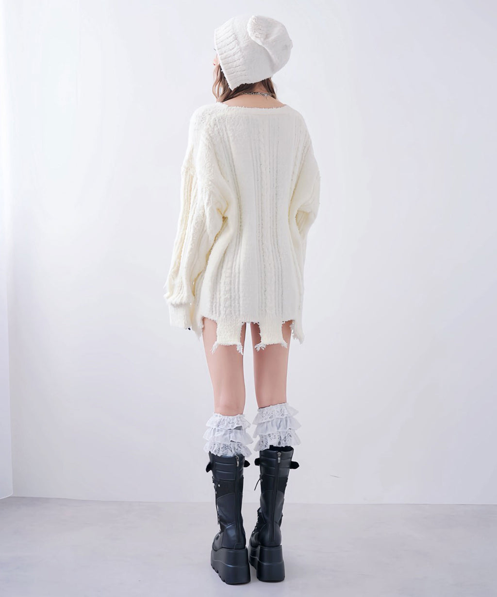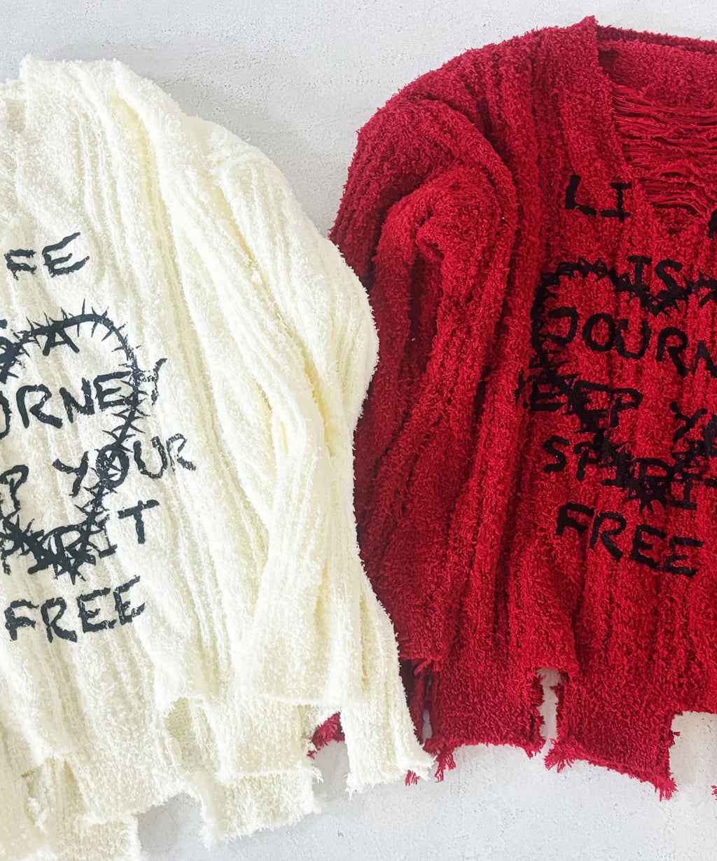 ゆるっと華奢見えするシルエットに、かすれ英字ロゴとダメージ風ディテールを組み合わせた、地雷系ムードたっぷりの長袖ニットトップス。