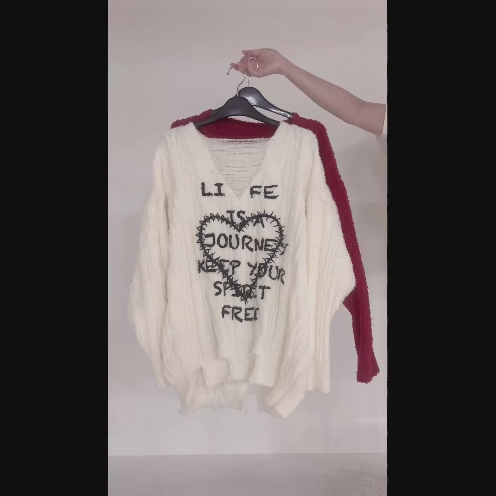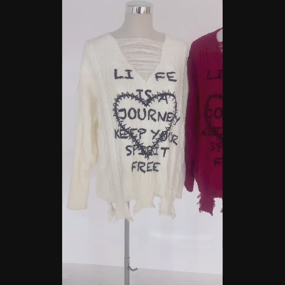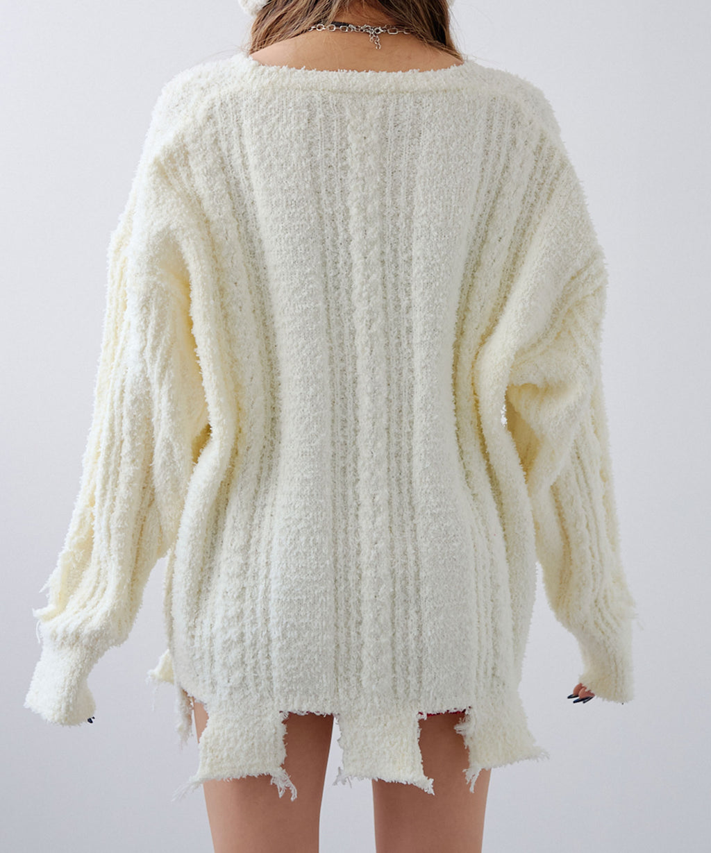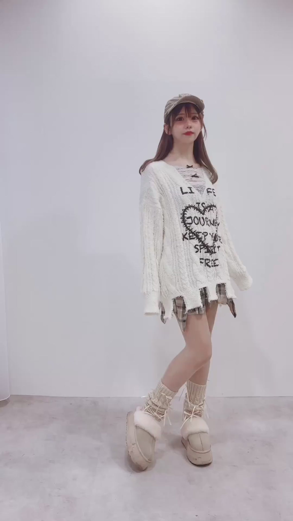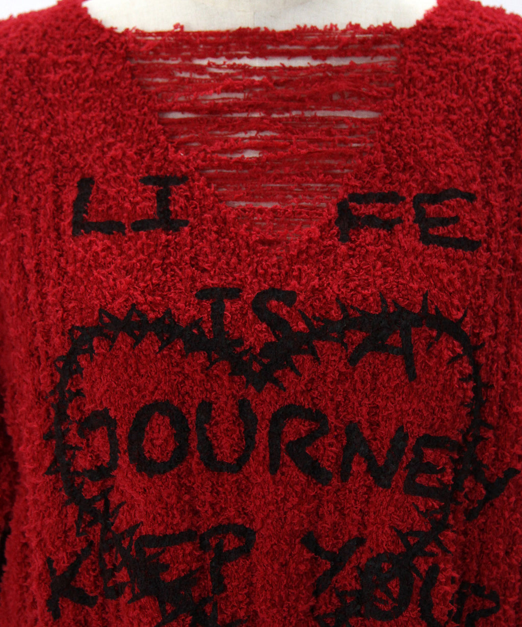 ゆるっと華奢見えするシルエットに、かすれ英字ロゴとダメージ風ディテールを組み合わせた、地雷系ムードたっぷりの長袖ニットトップス。