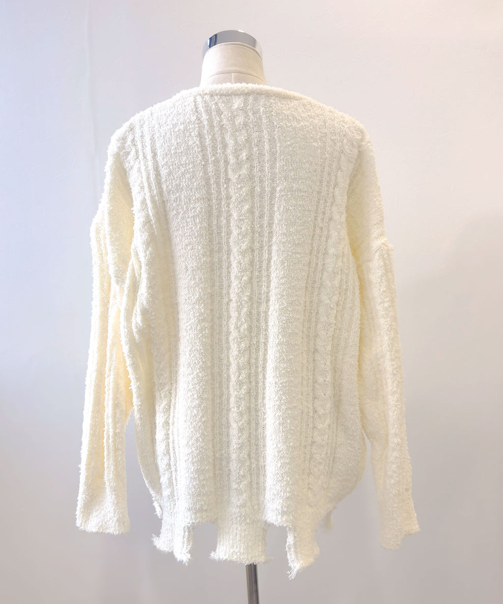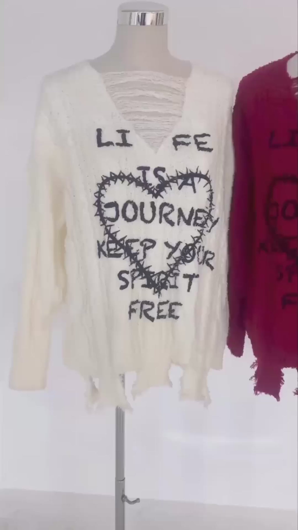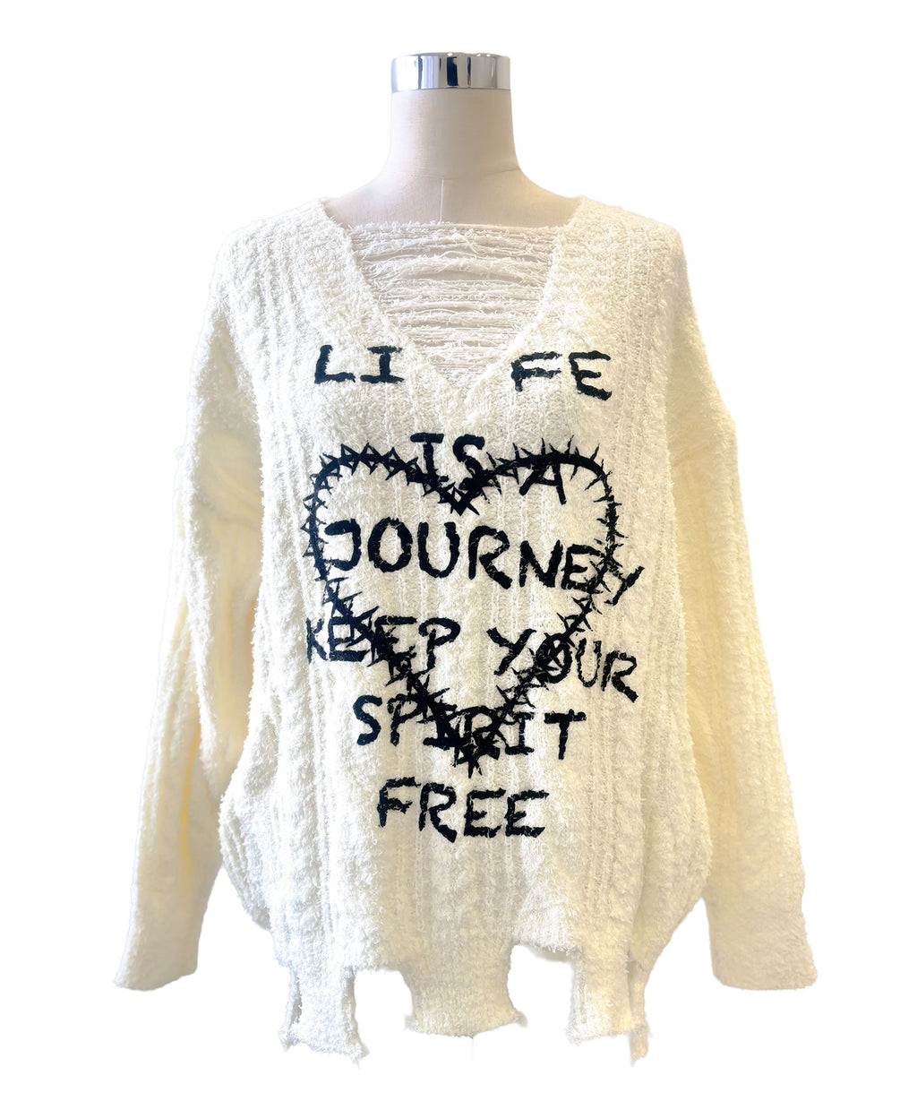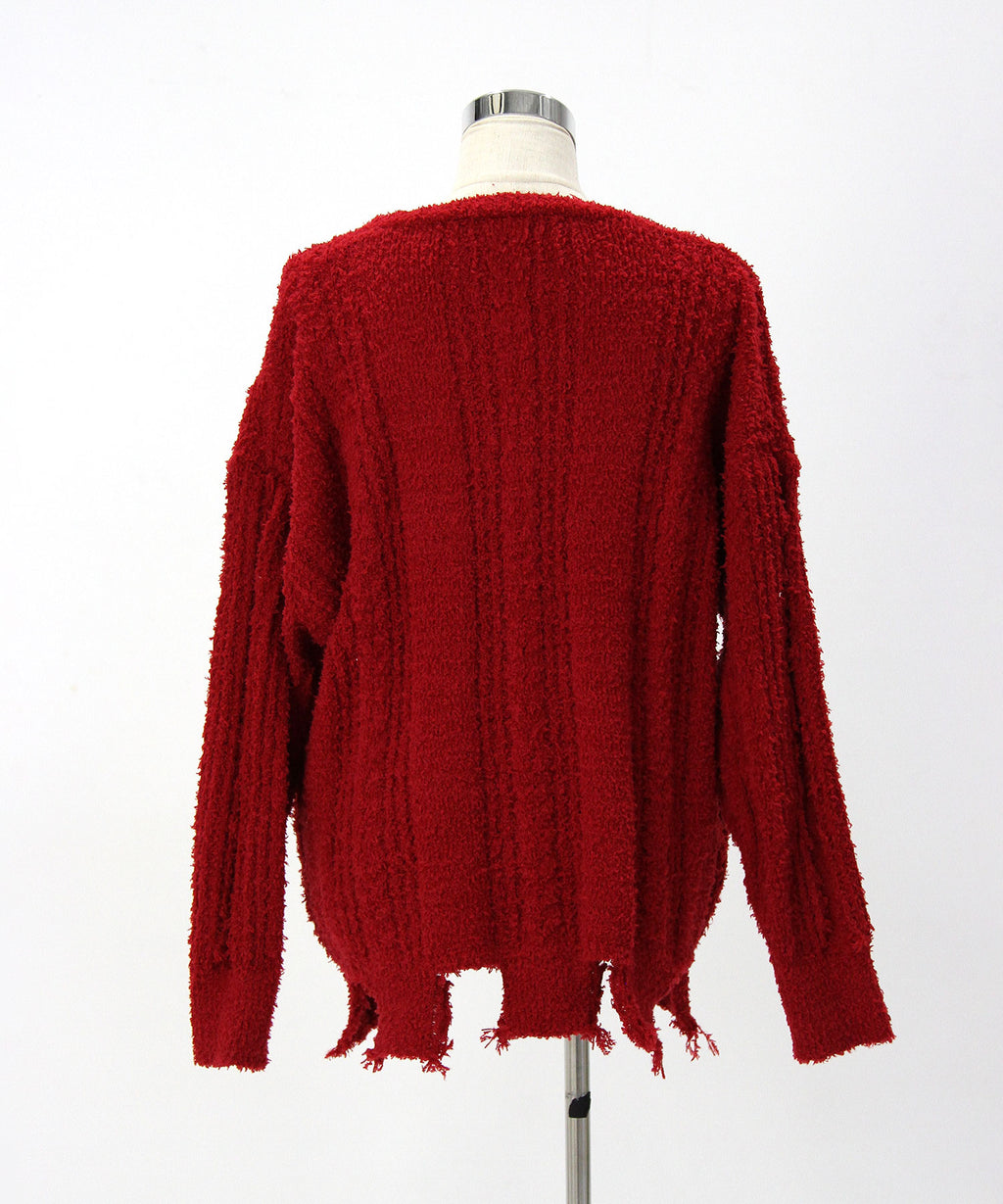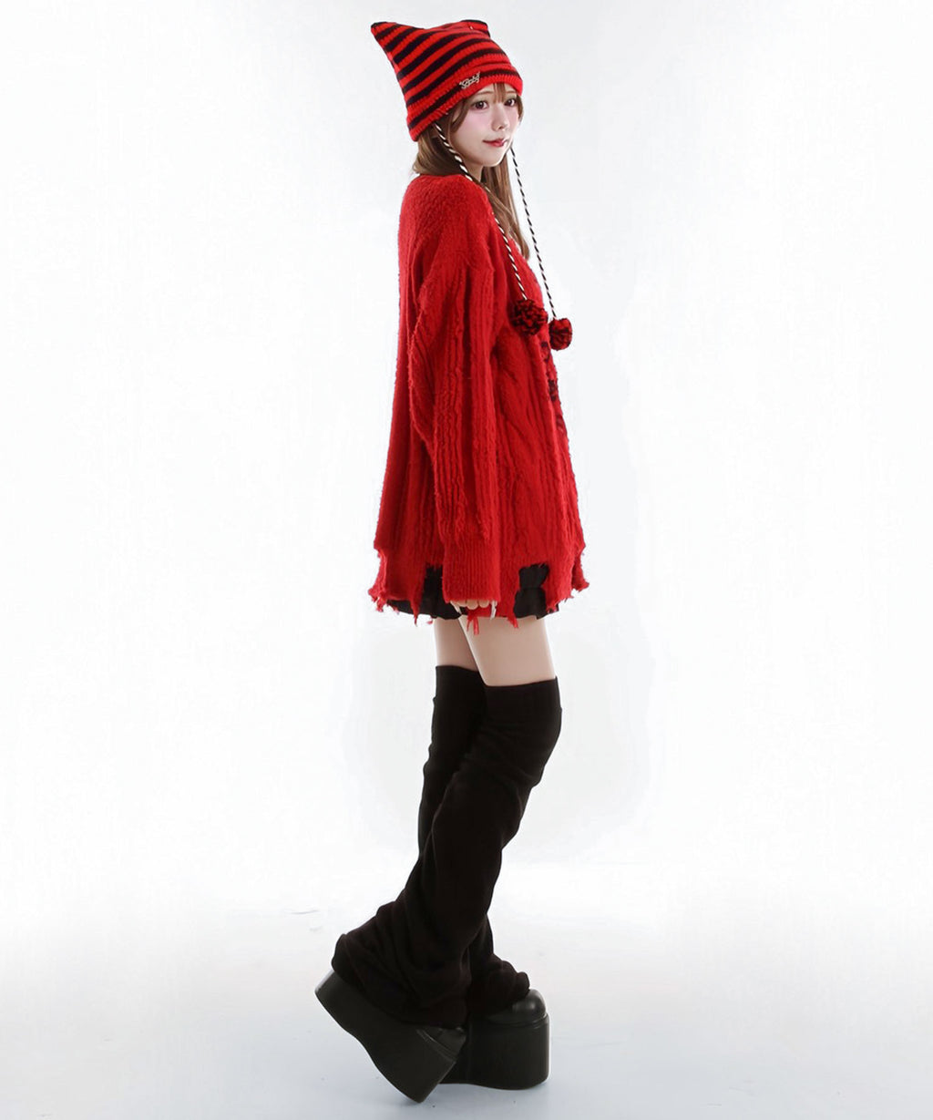 ゆるっと華奢見えするシルエットに、かすれ英字ロゴとダメージ風ディテールを組み合わせた、地雷系ムードたっぷりの長袖ニットトップス。