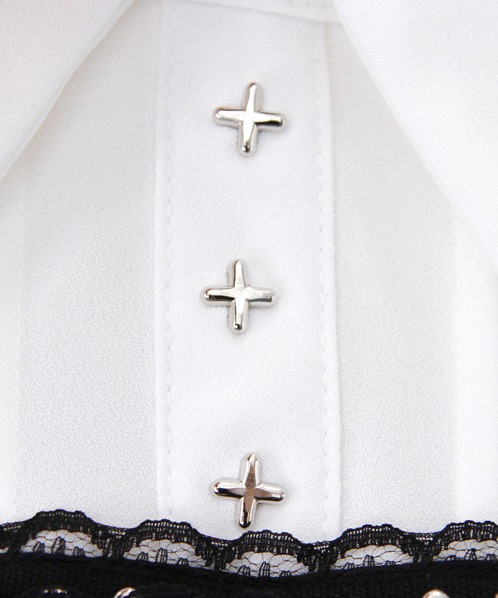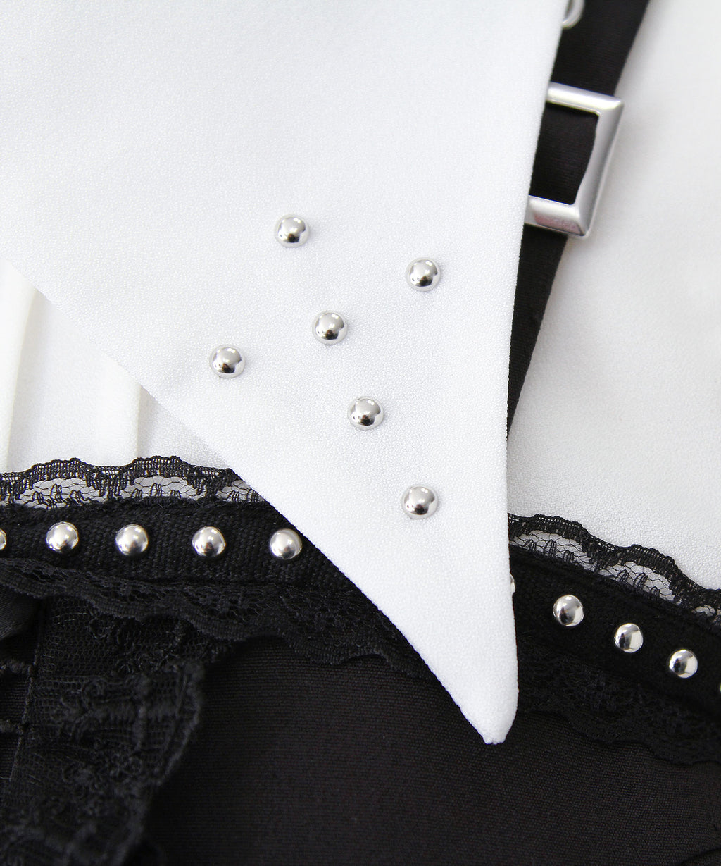 シャープな印象のスタッズ付き角襟が顔周りをすっきりと演出。