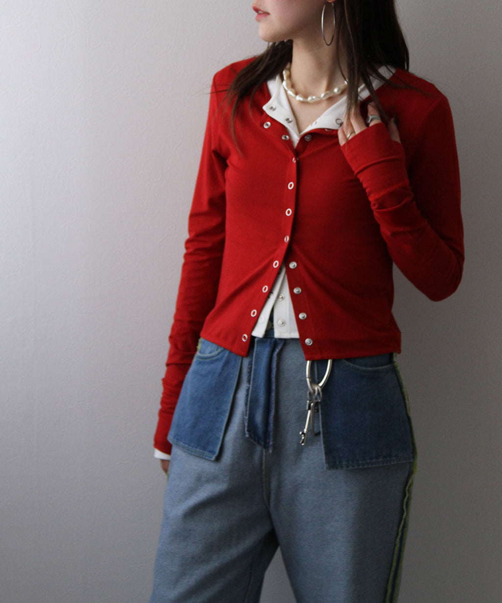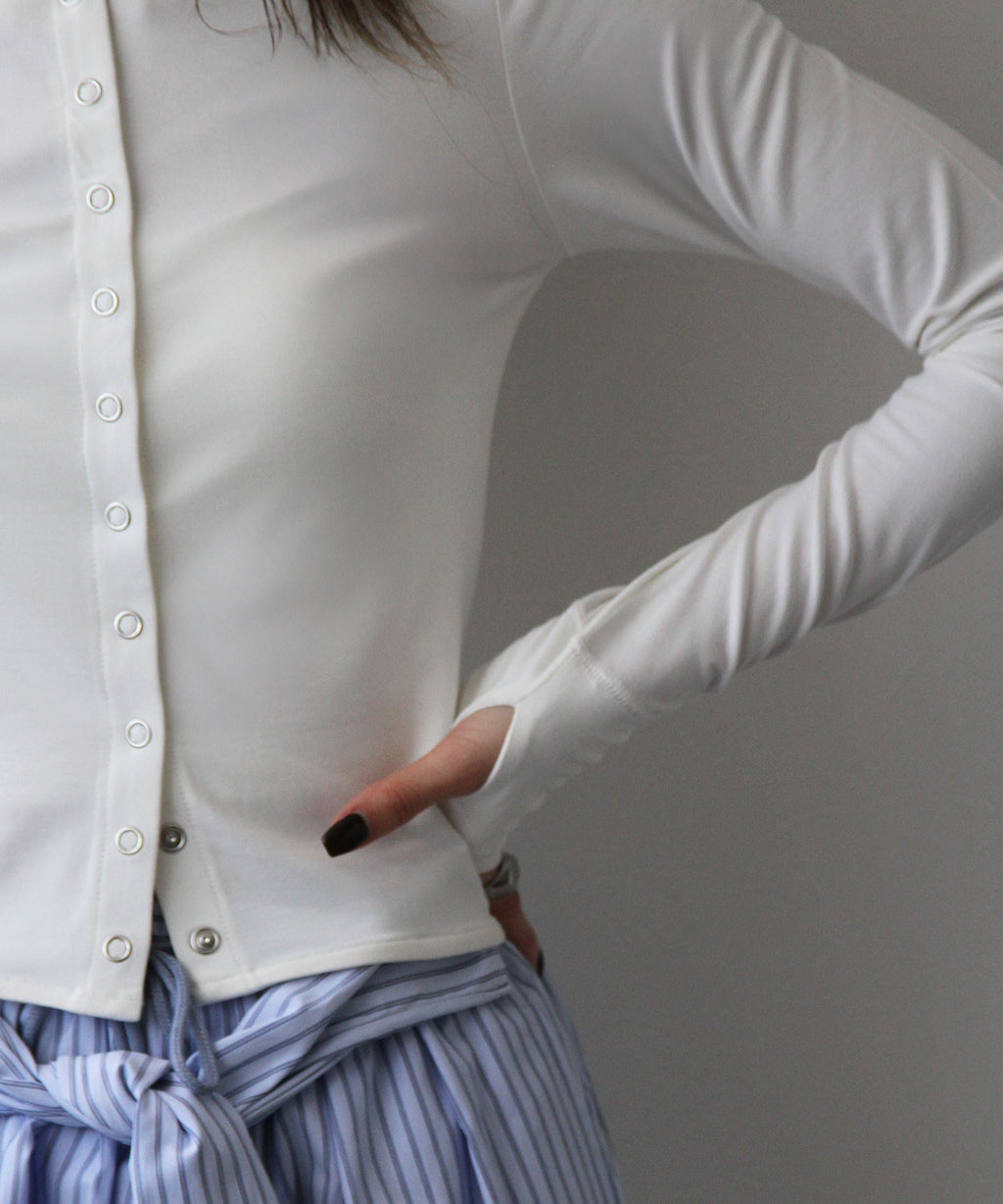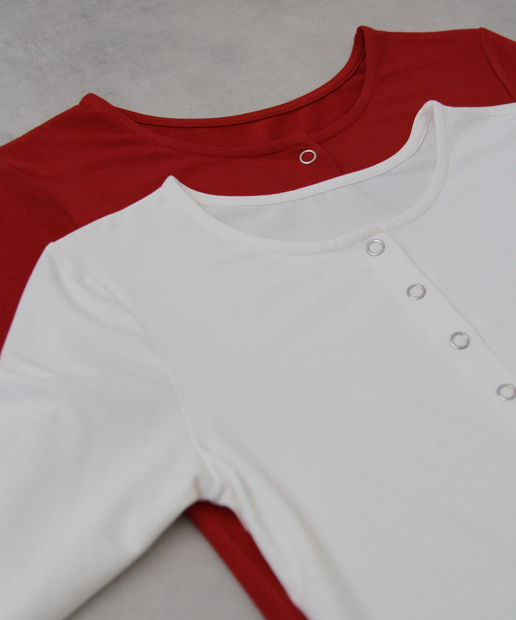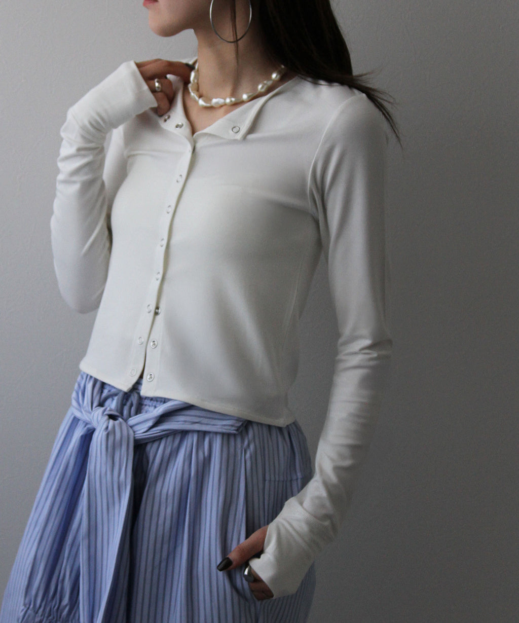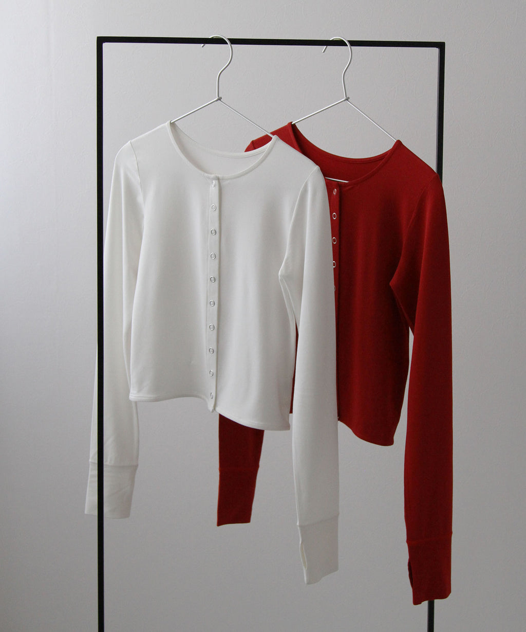 シンプルなクルーネック×スナップボタンで、