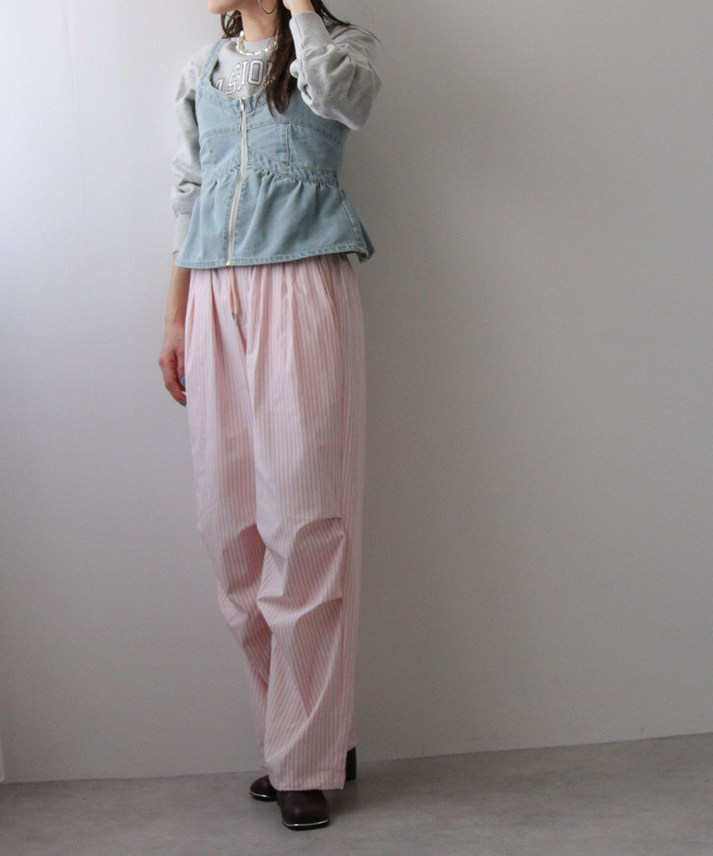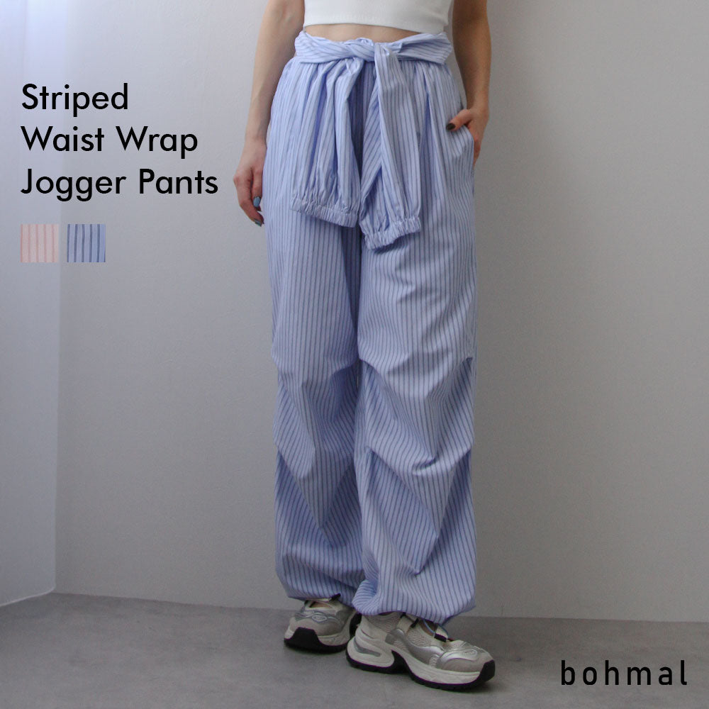 ストライプ柄が縦ラインを強調し、脚をすっきり見せるジョガーパンツ。
