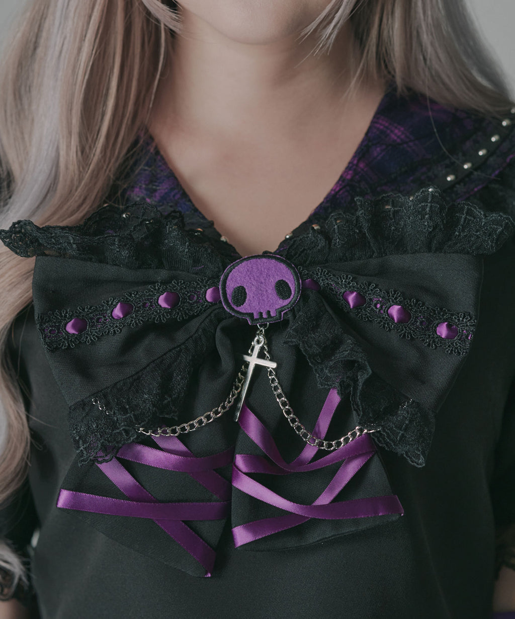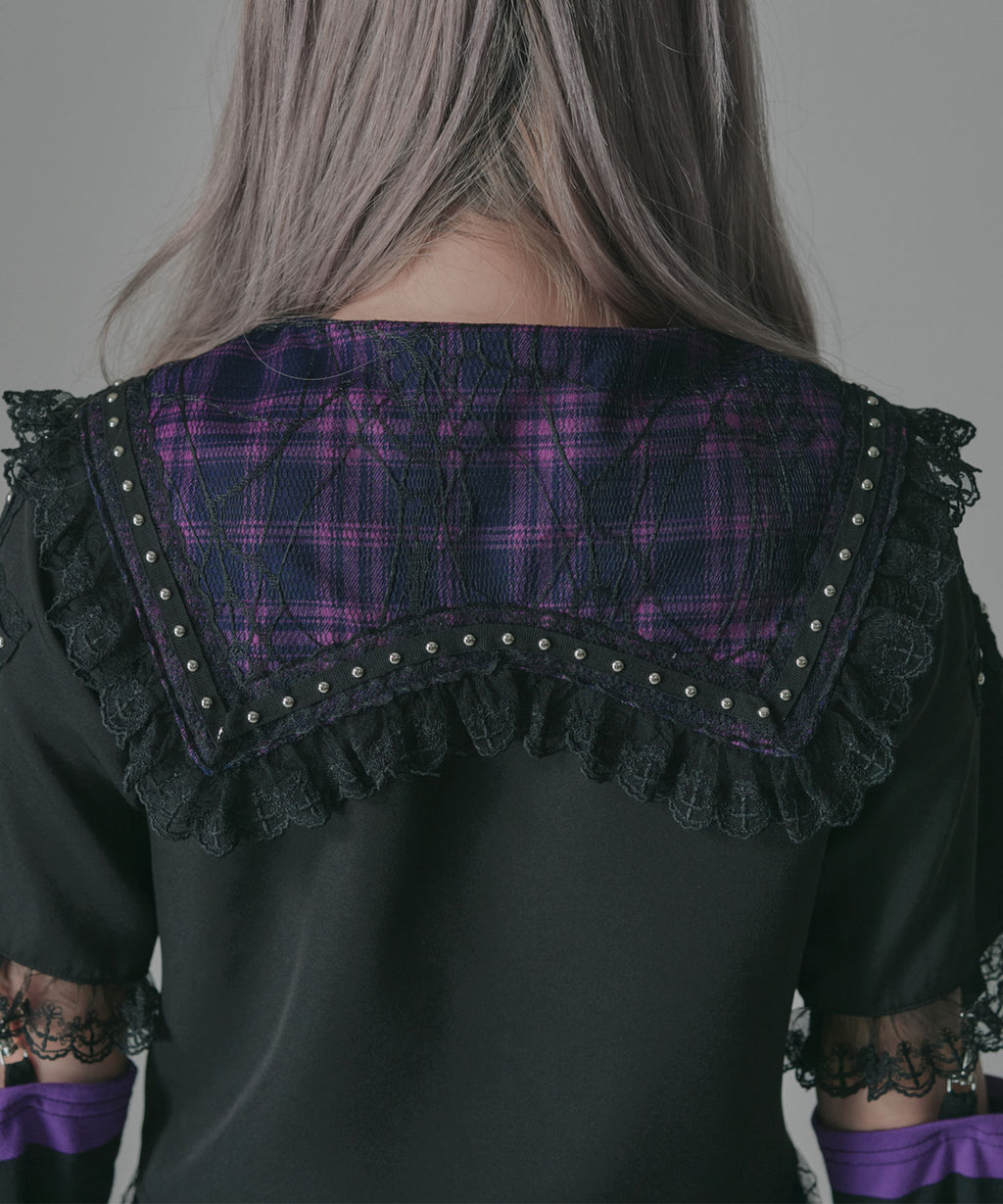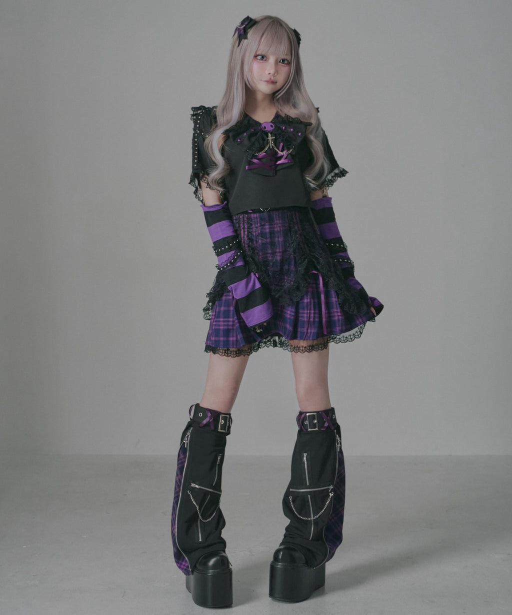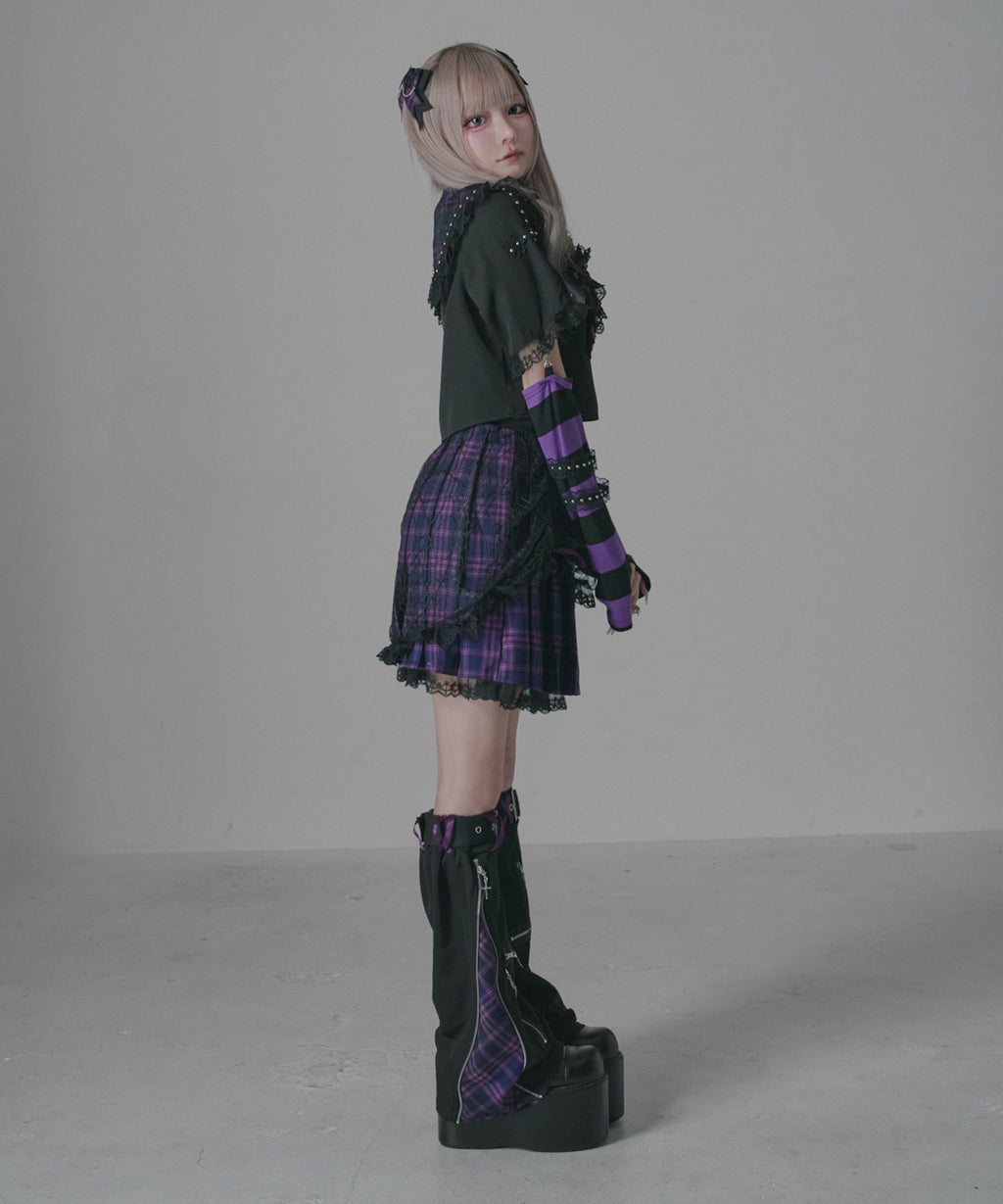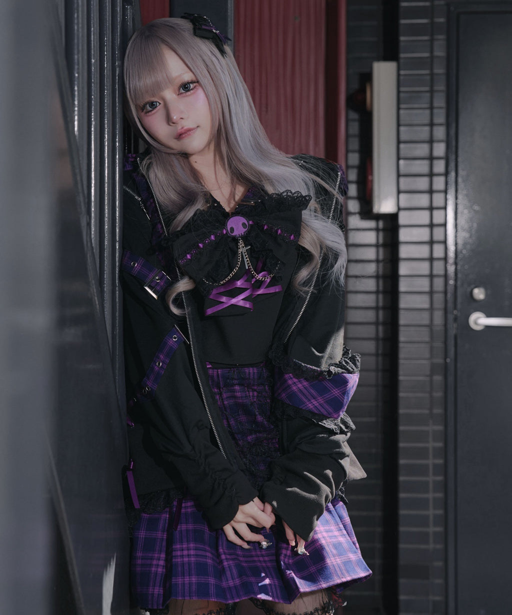 クモの巣柄レースとパープルチェックを合わせた唯一無二のデザイン。