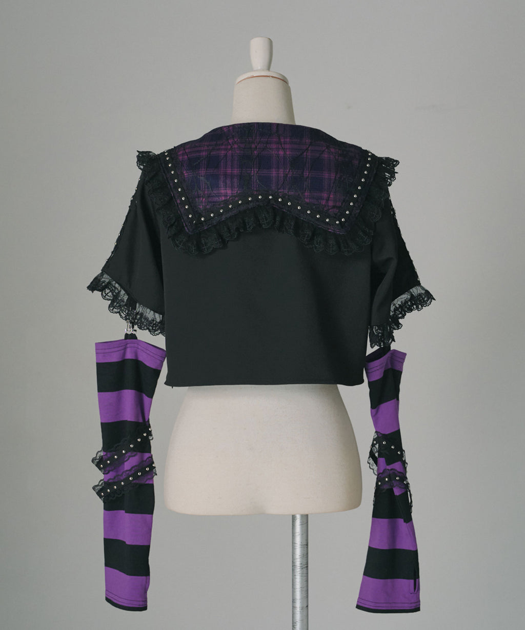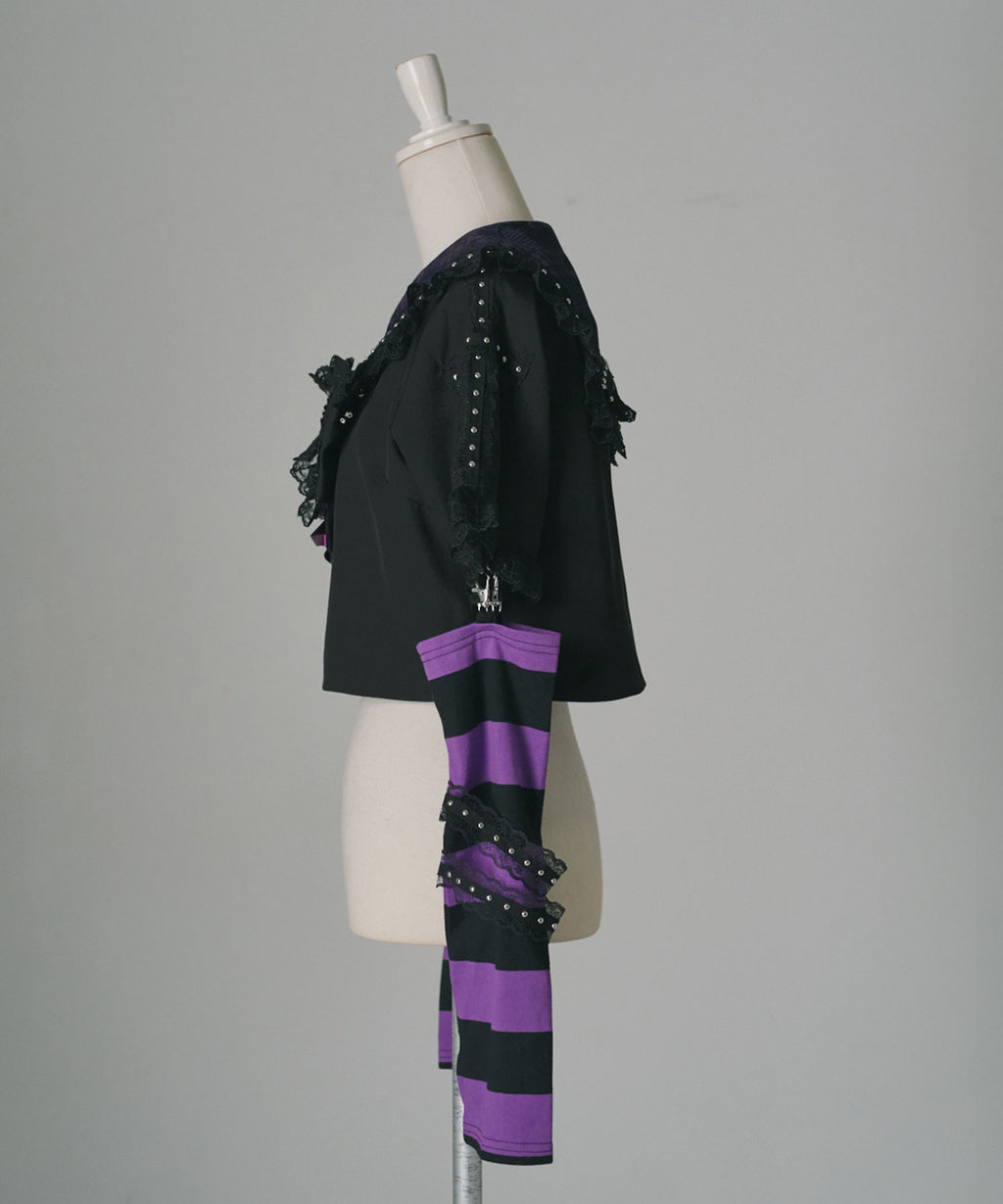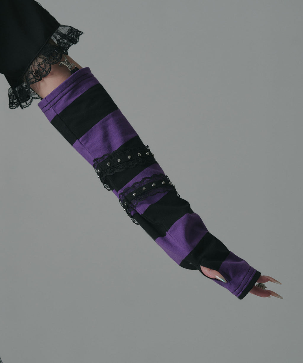 付属のアームカバーはパンキッシュなボーダー柄を採用。レースとの異素材ミックスで存在感も抜群です。