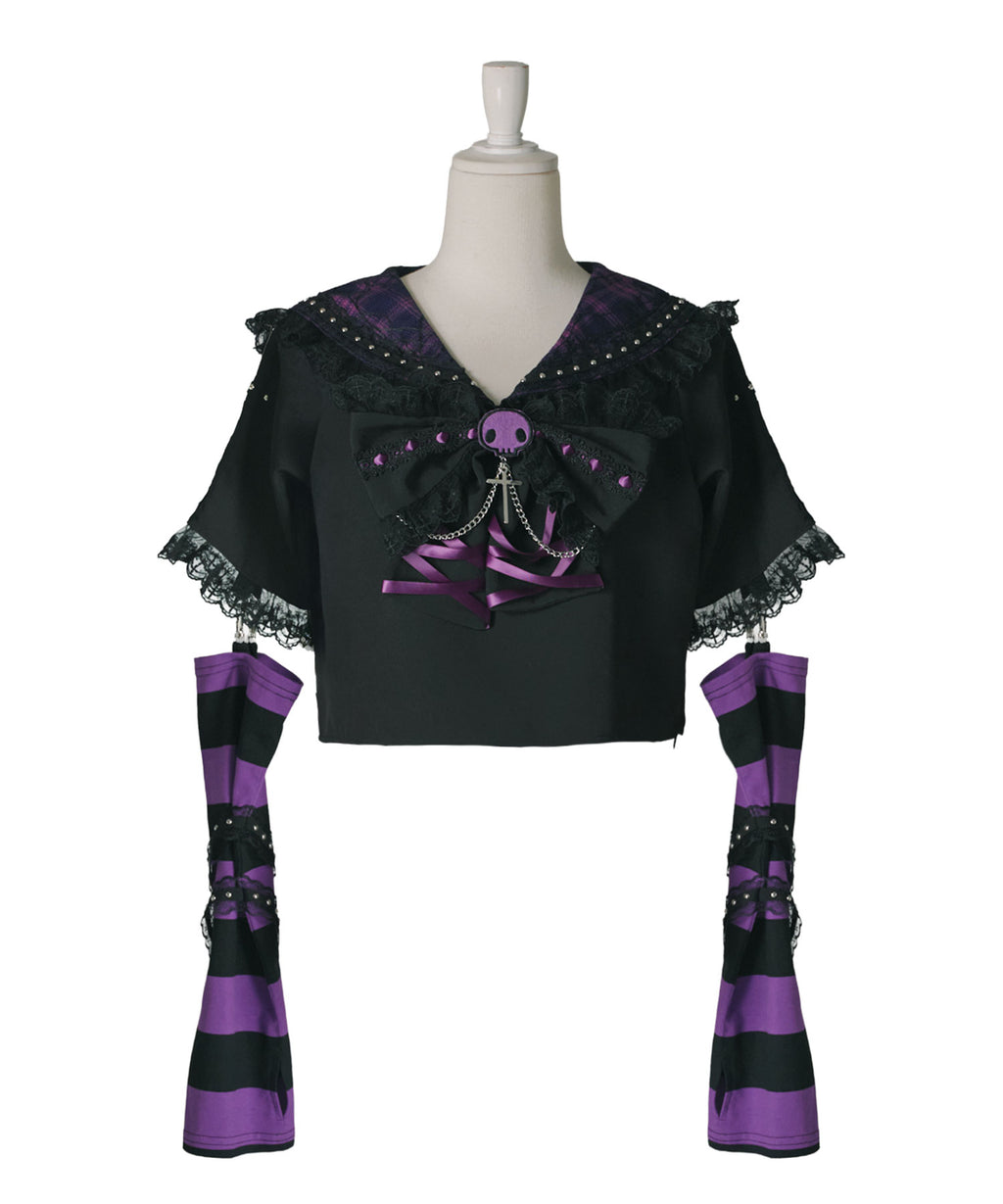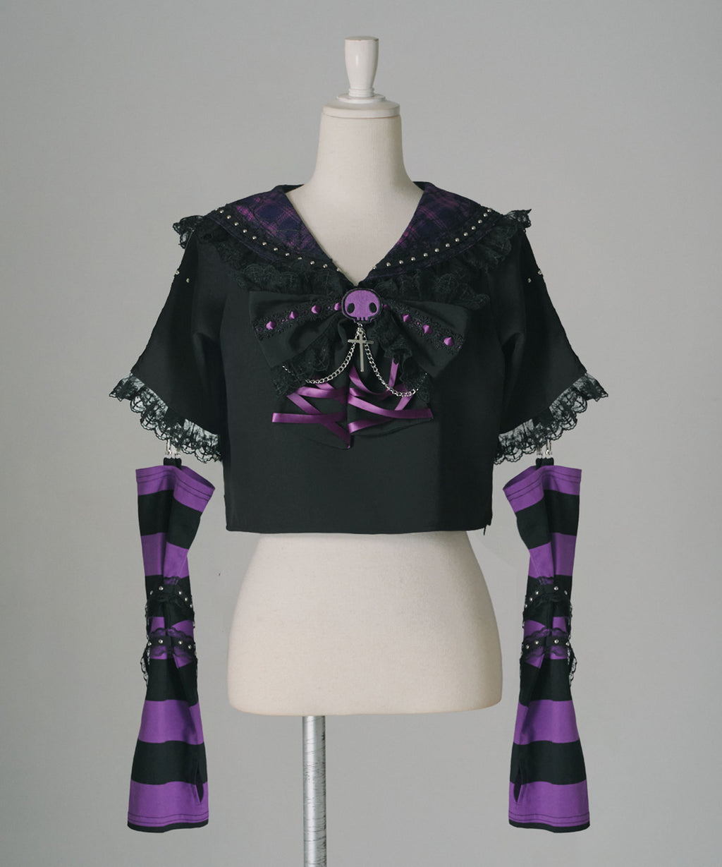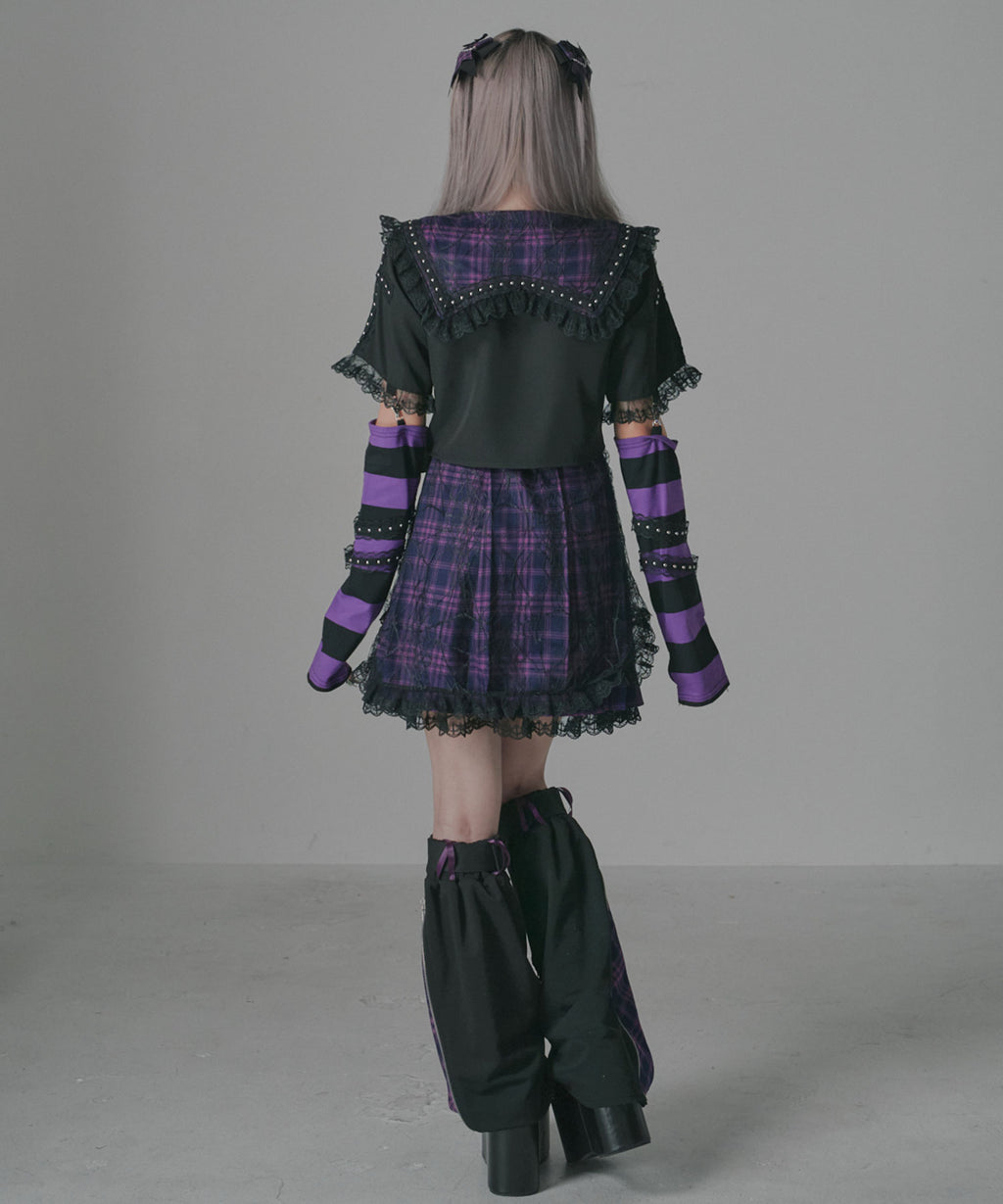 付属のアームカバーはパンキッシュなボーダー柄を採用。レースとの異素材ミックスで存在感も抜群です。