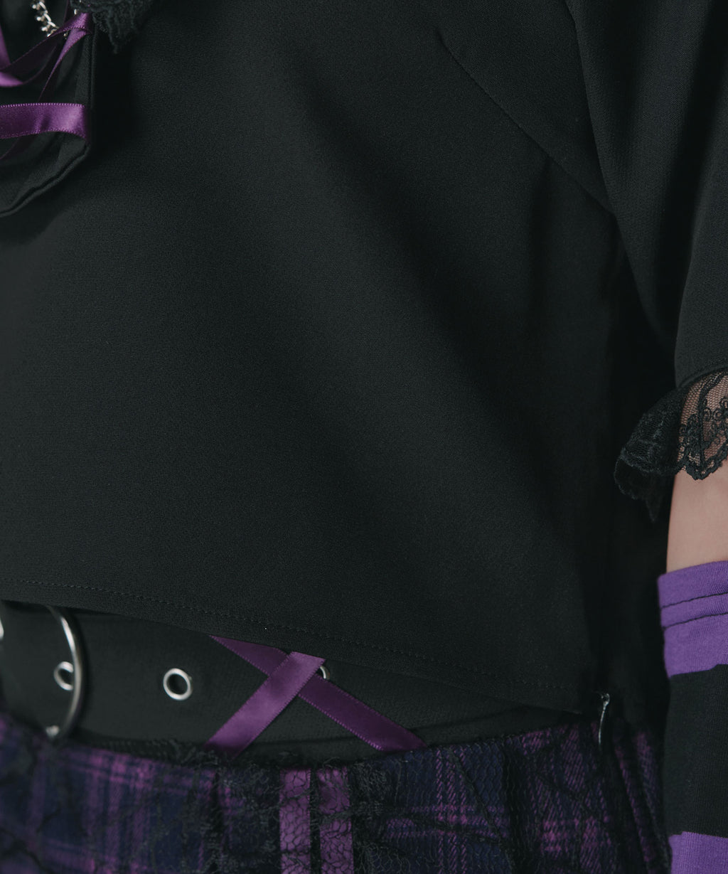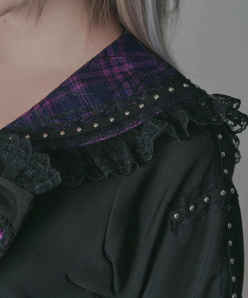 襟周りにはスタッズとレースをあしらい、「強さ」と「可愛さ」を両立させた一着です。