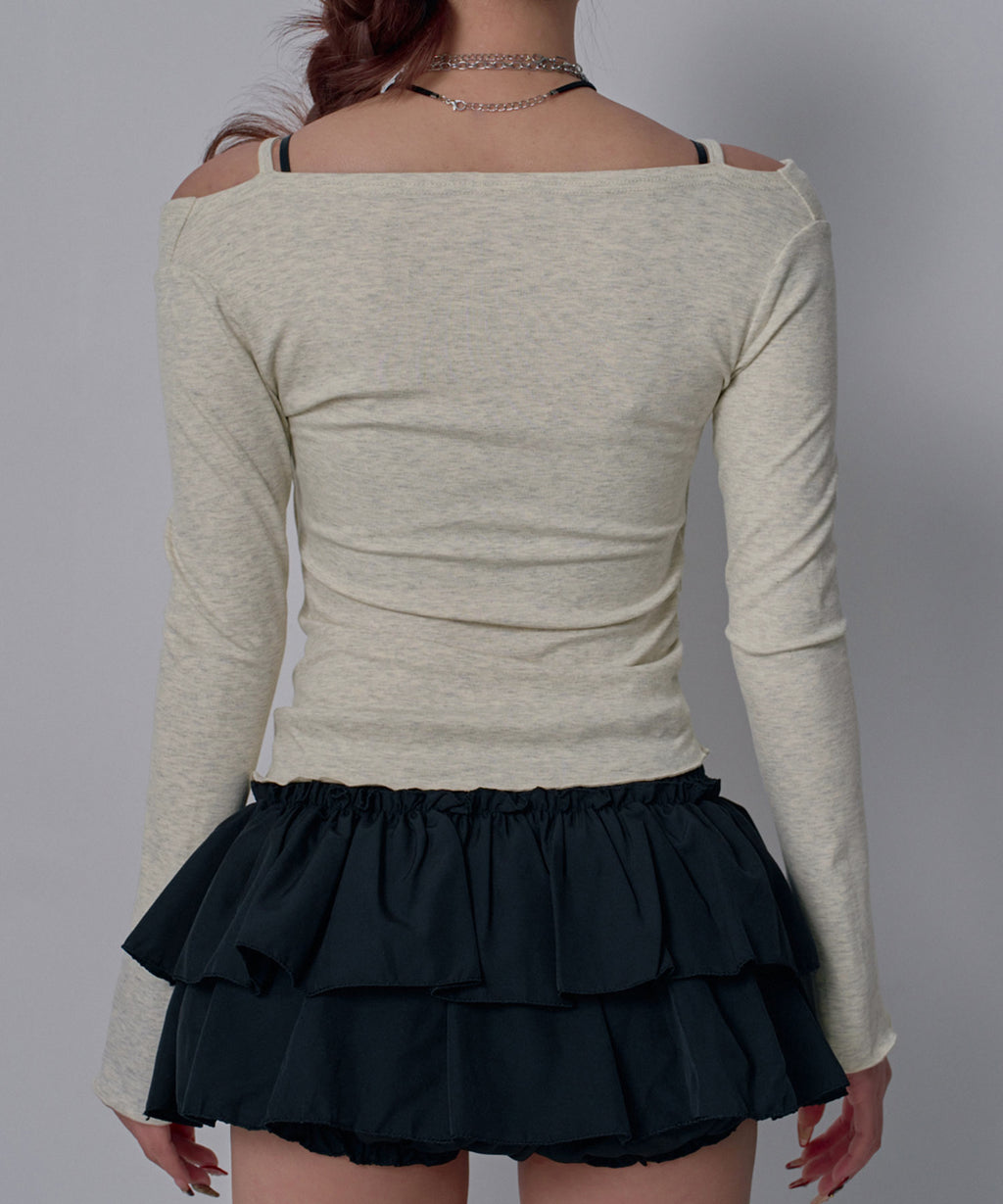 デコルテを美しく見せるオフショルダーに、華奢な肩紐キャミ風を重ねたレイヤードデザインのカットソー。