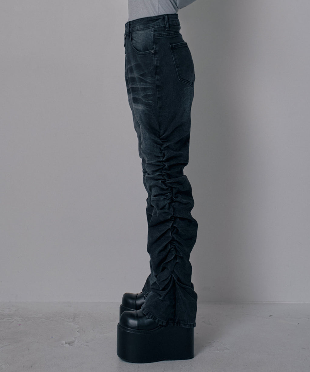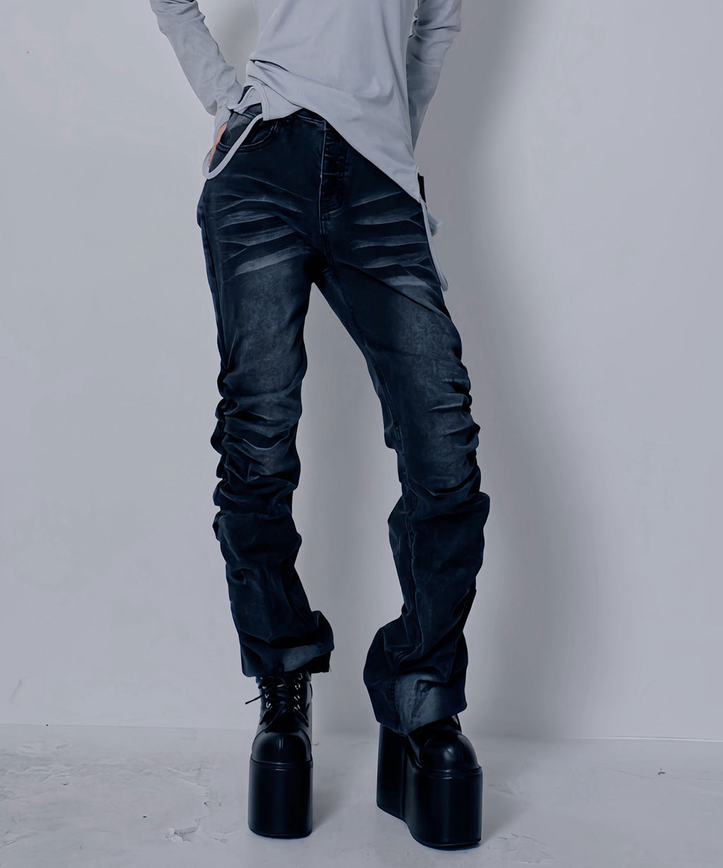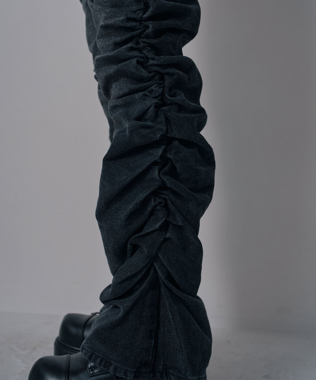 脇に施したシャーリング加工が立体感を生み、動くたびに陰影が浮かび上がるデザインデニムです。