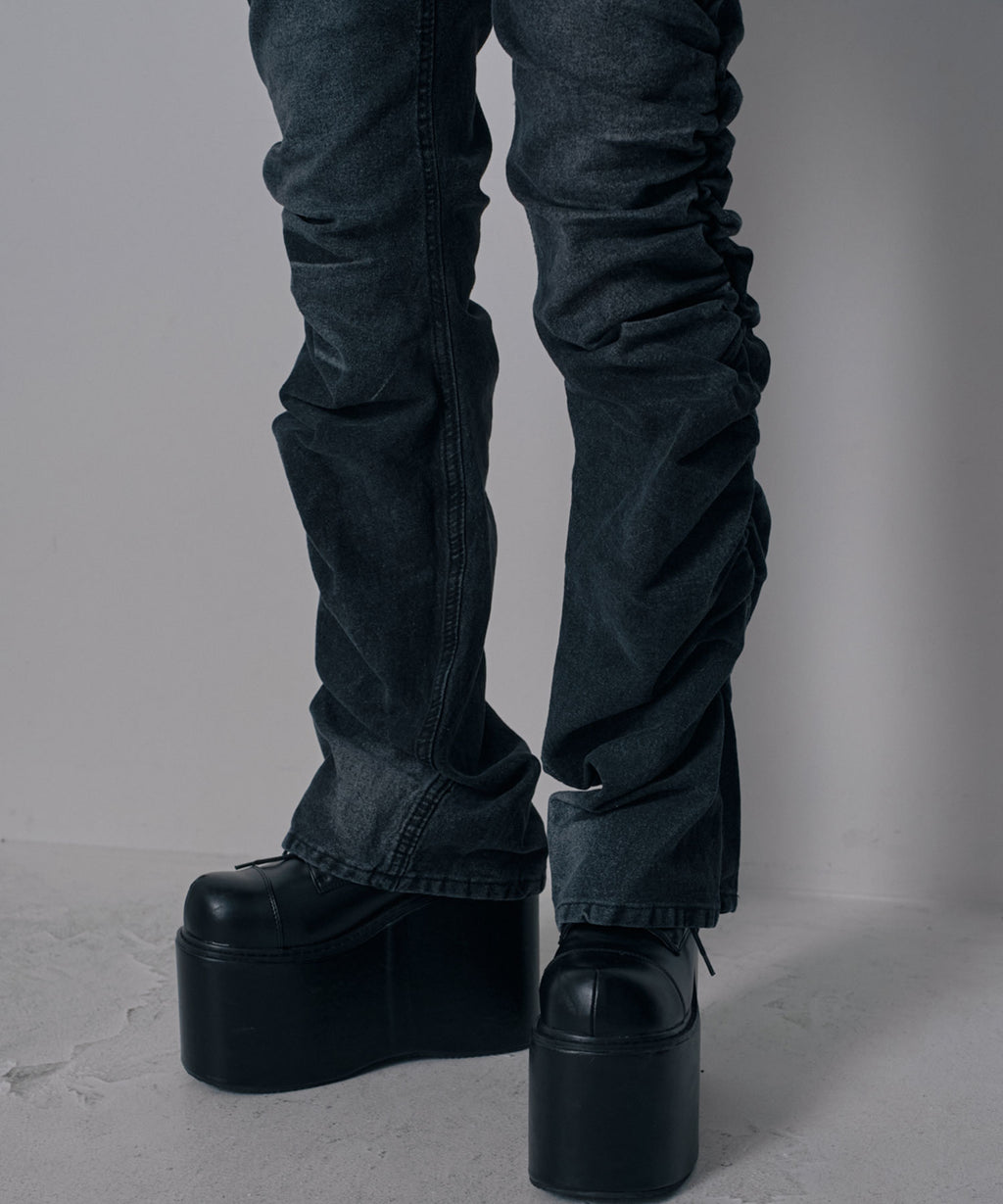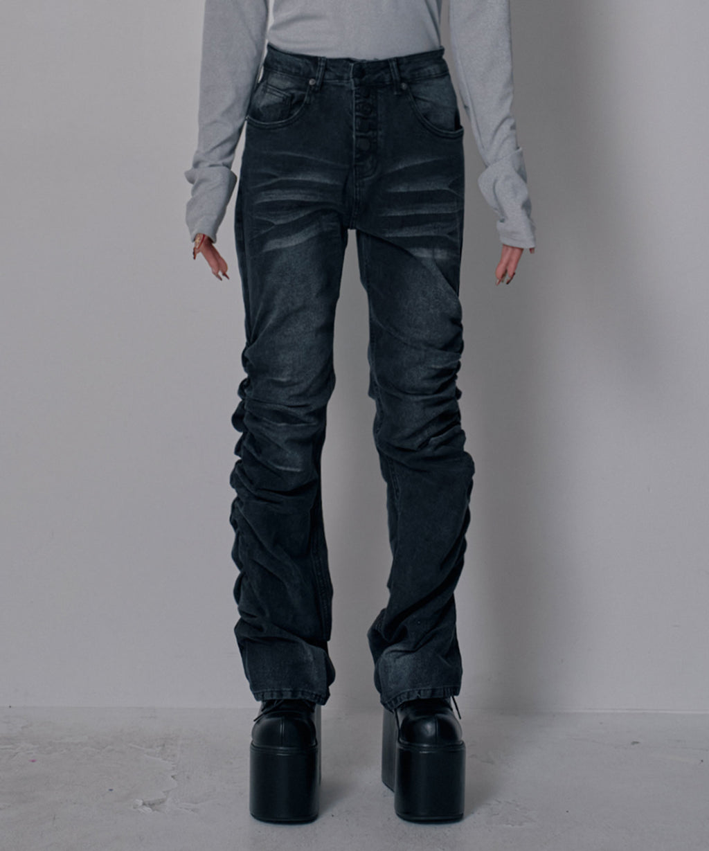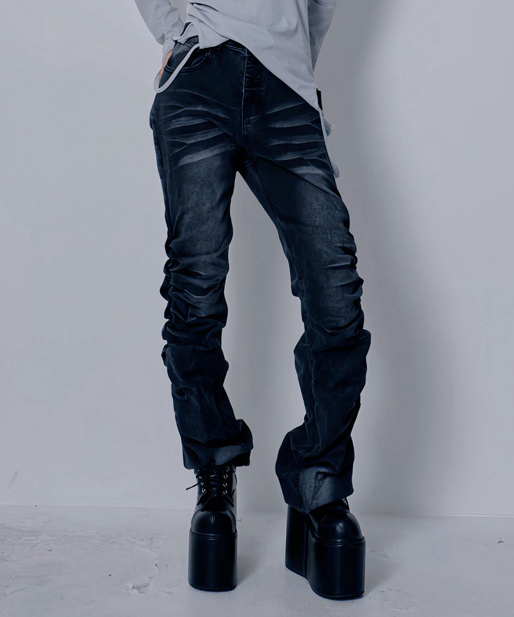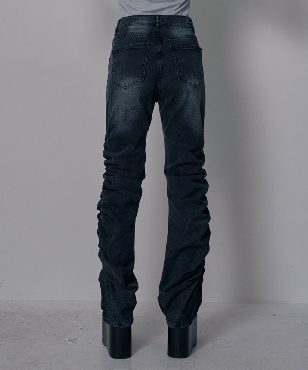 脇に施したシャーリング加工が立体感を生み、動くたびに陰影が浮かび上がるデザインデニムです。
