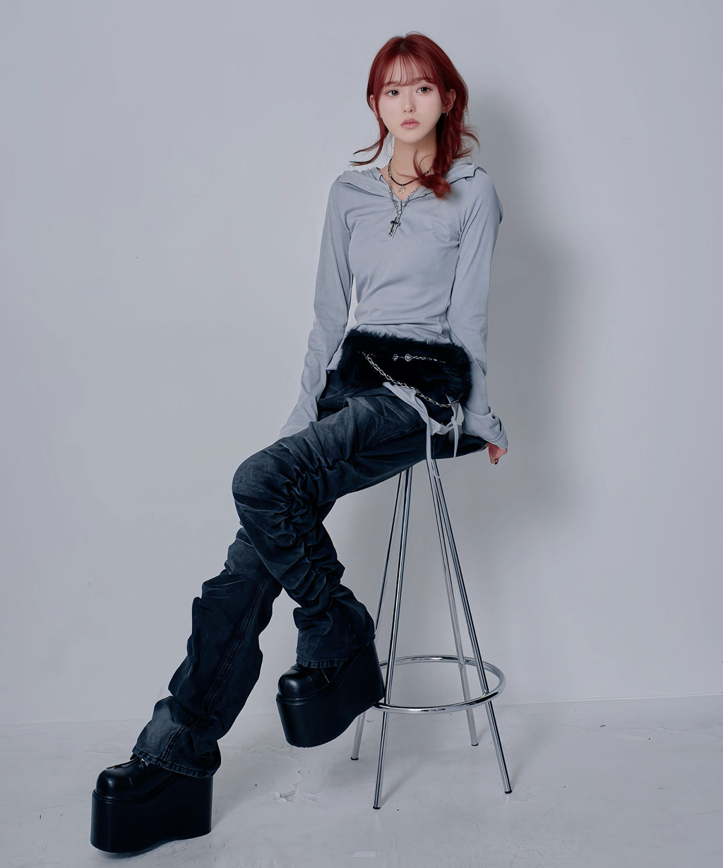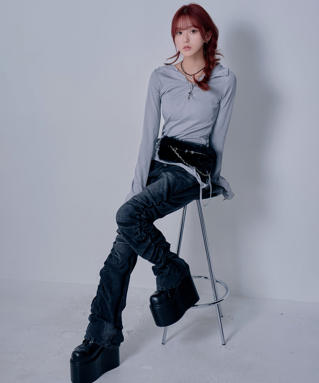 くしゅっと寄せたサイドディテールが、グランジやY2Kムードを高め、エッジの効いたスタイルを完成させます。