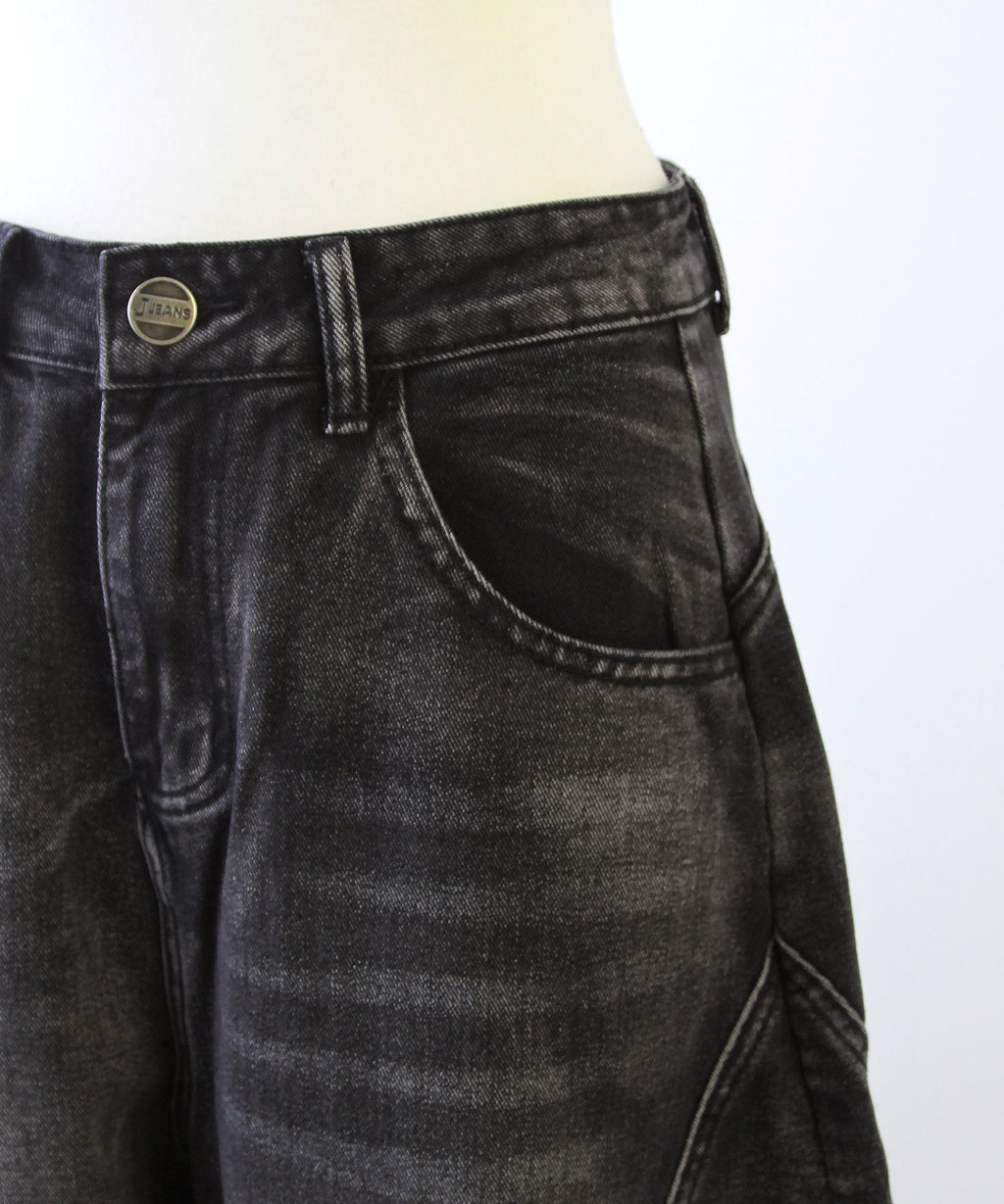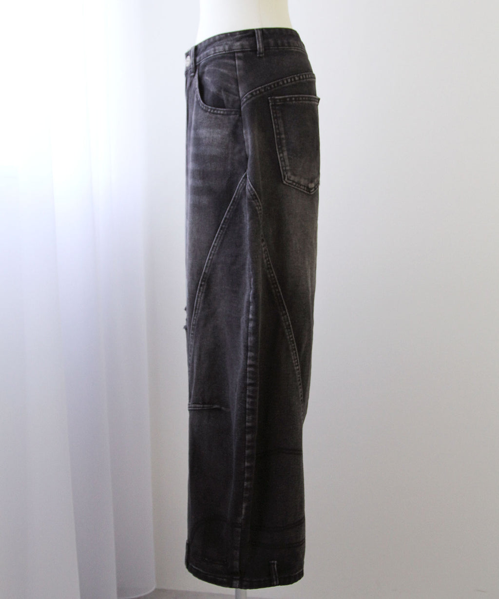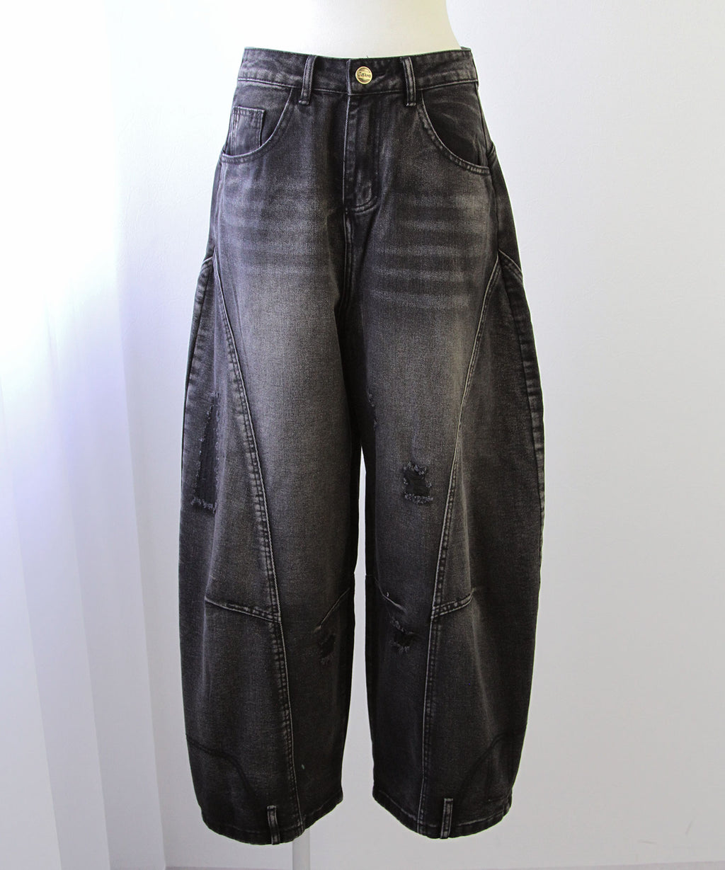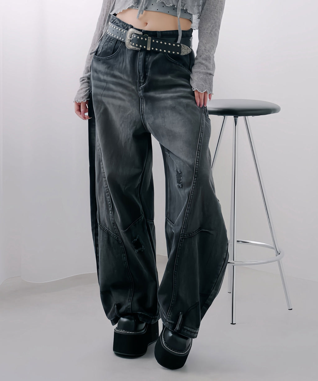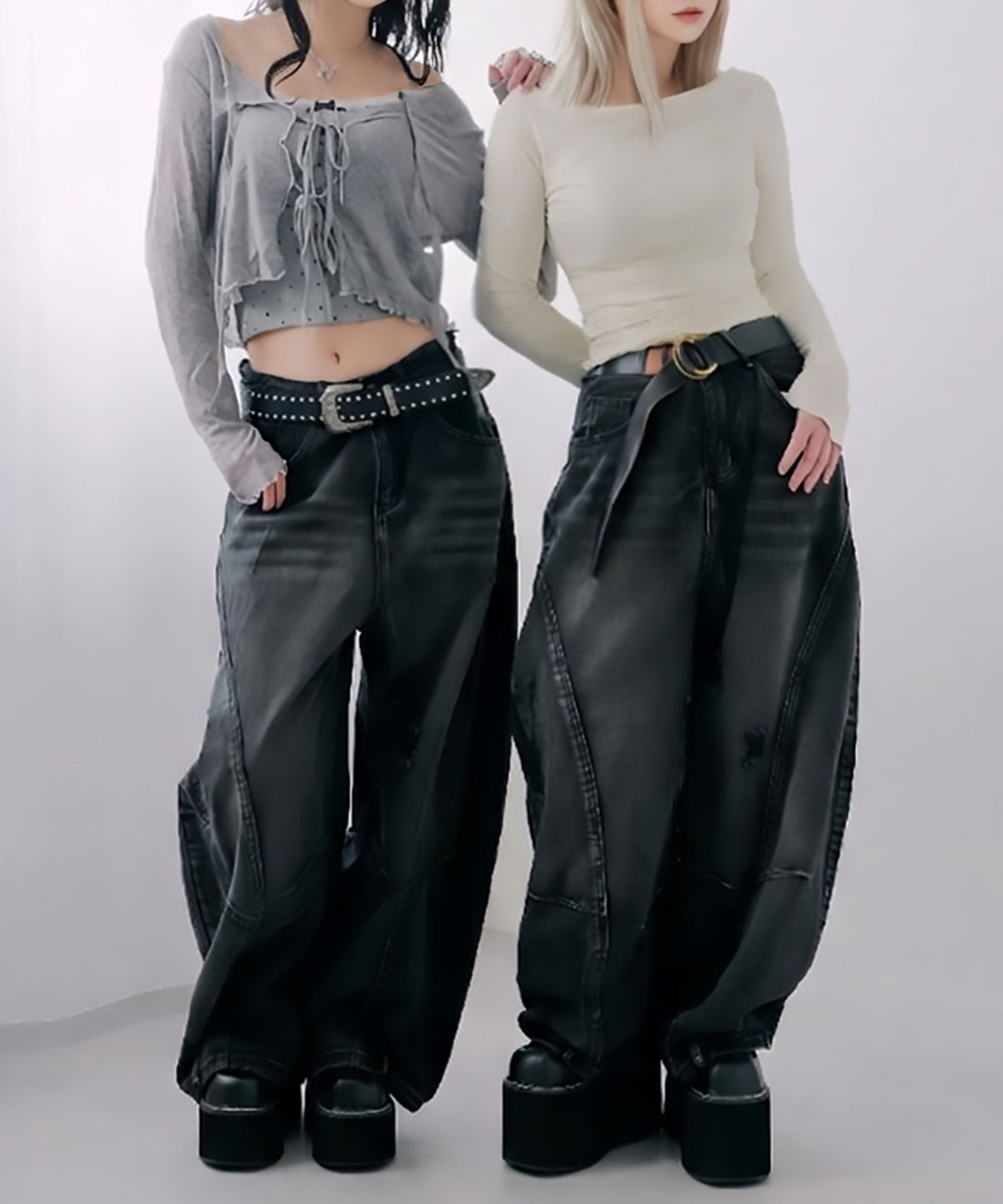 Y2Kファッション グランジ ストリート 韓国ファッション バレルデニム ワイドデニム ルーズパンツ ダメージデニム ヴィンテージ加工 体型カバー 脚長効果 厚底コーデ