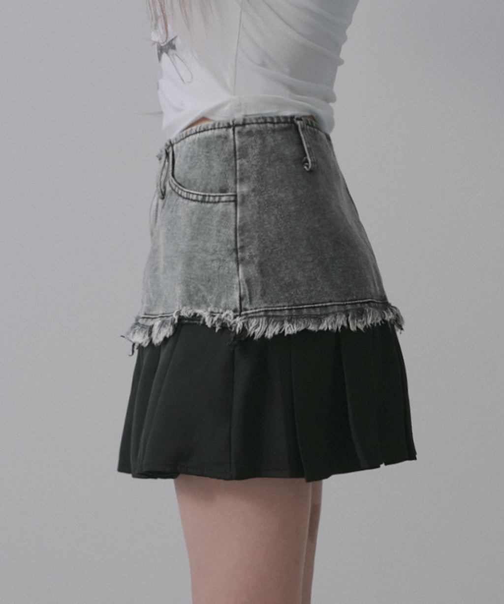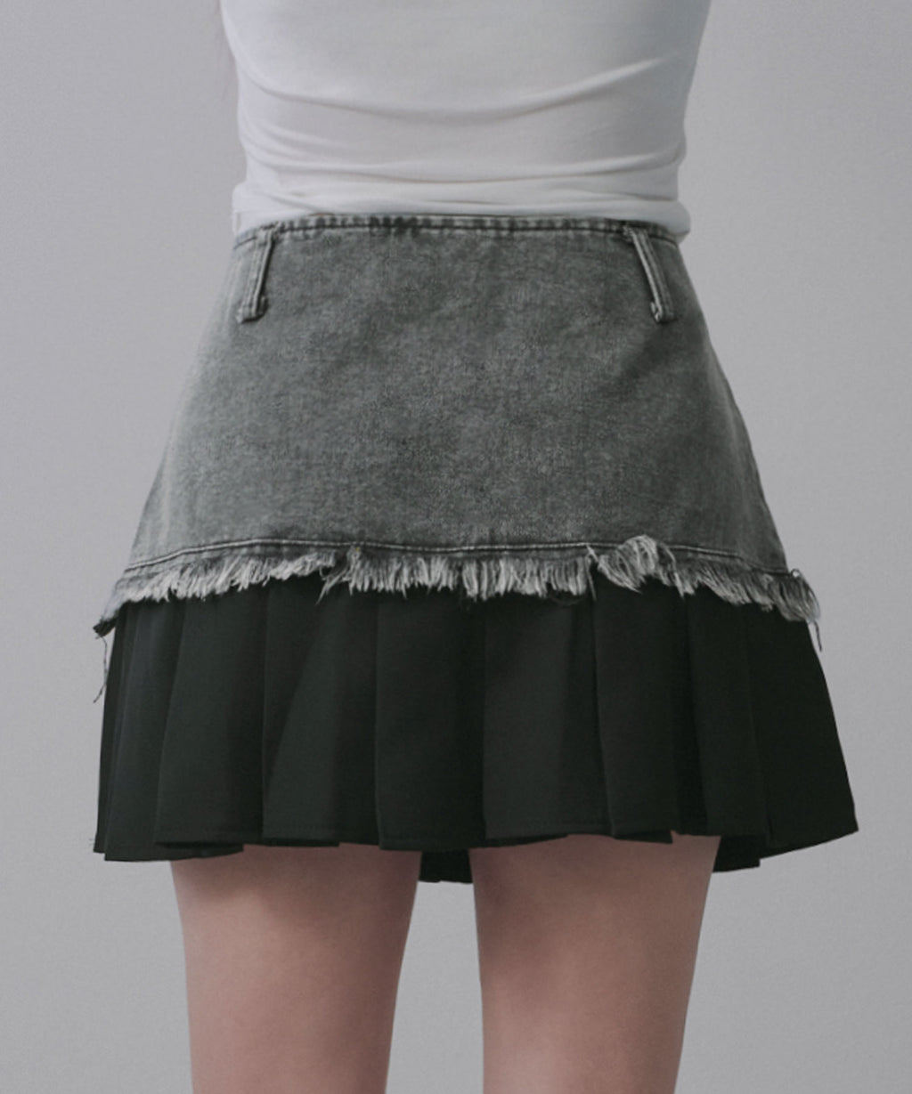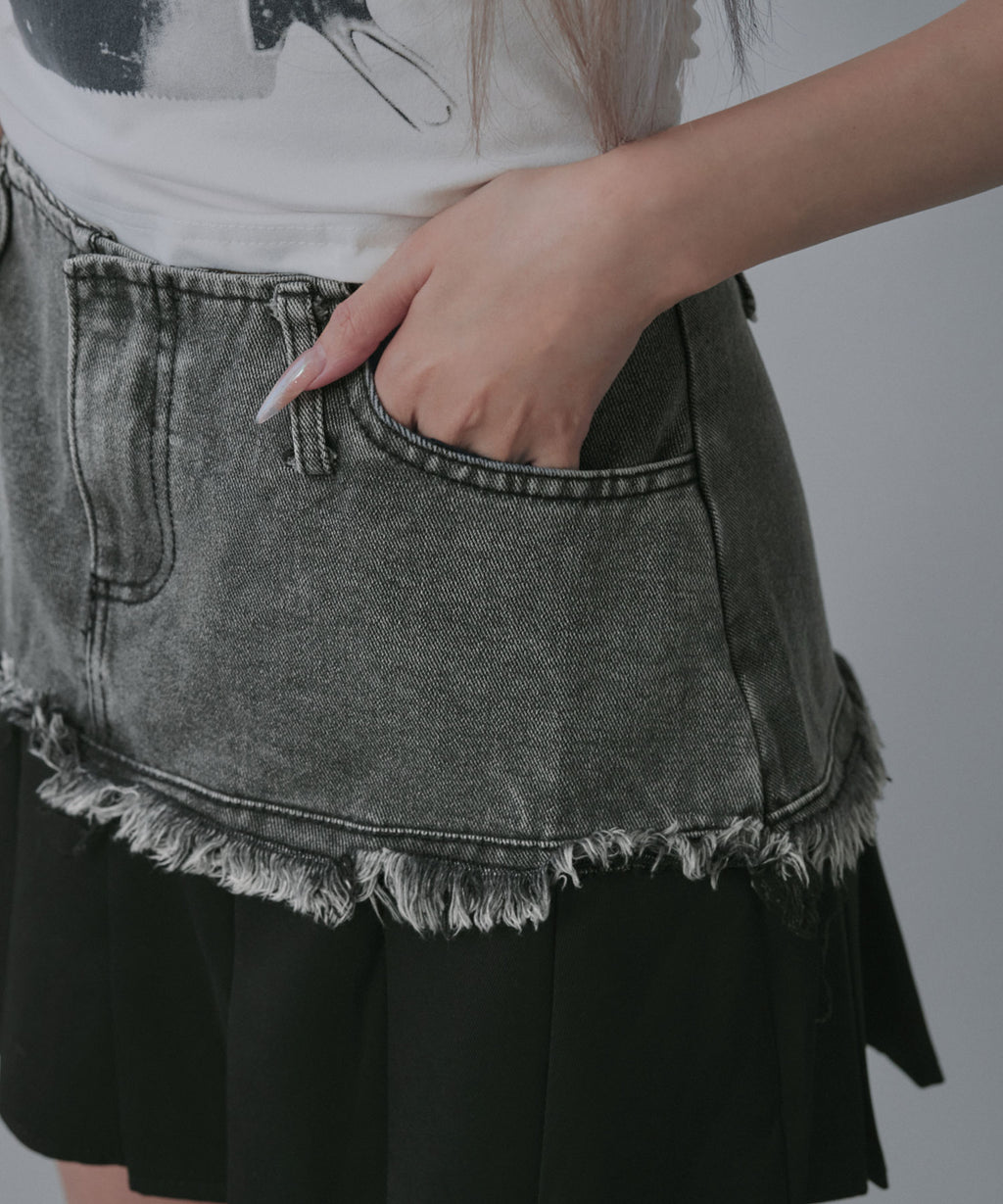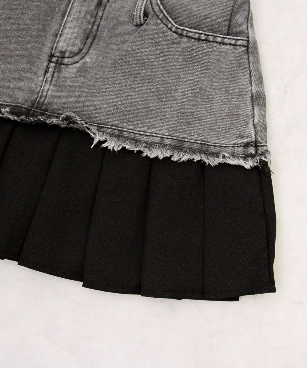 ヴィンテージライクなデニムとプリーツスカートを組み合わせたレイヤード風ミニスカート。