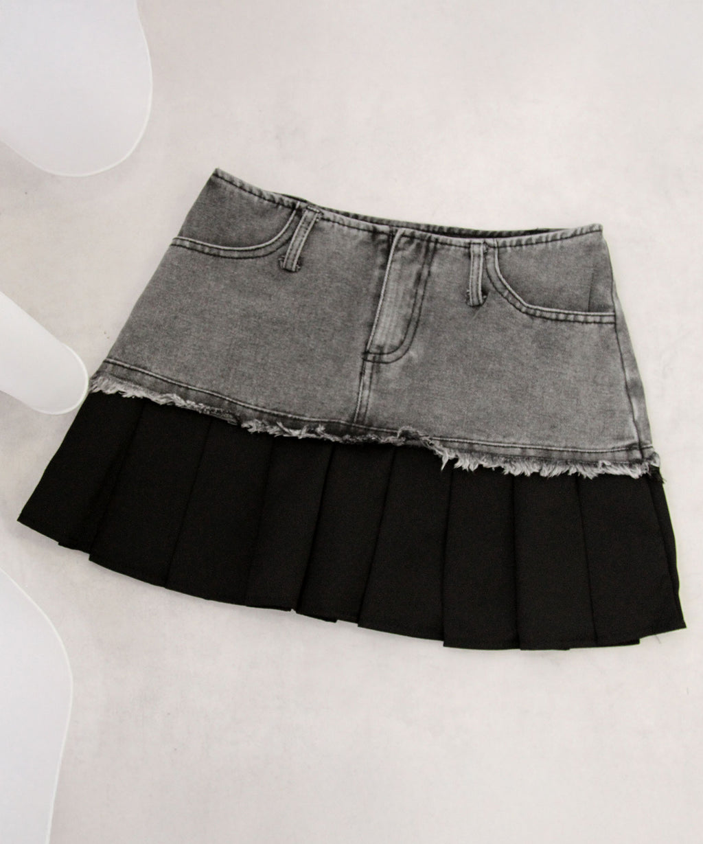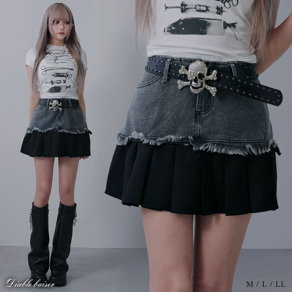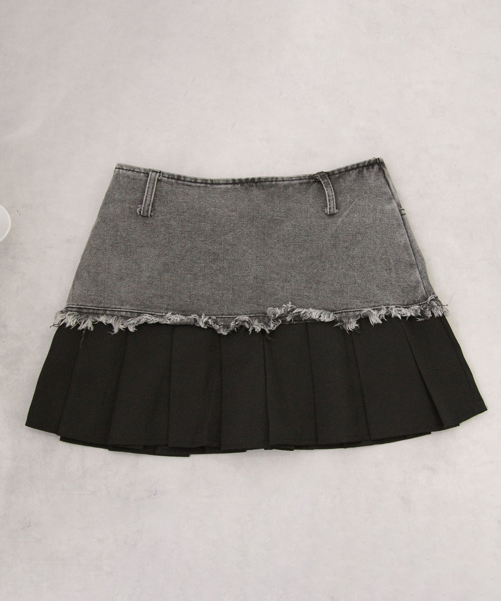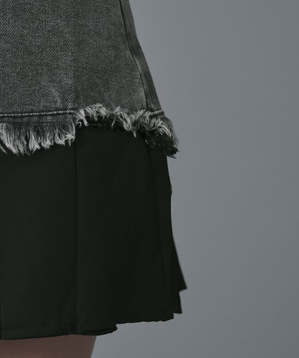 ヴィンテージライクなデニムとプリーツスカートを組み合わせたレイヤード風ミニスカート。