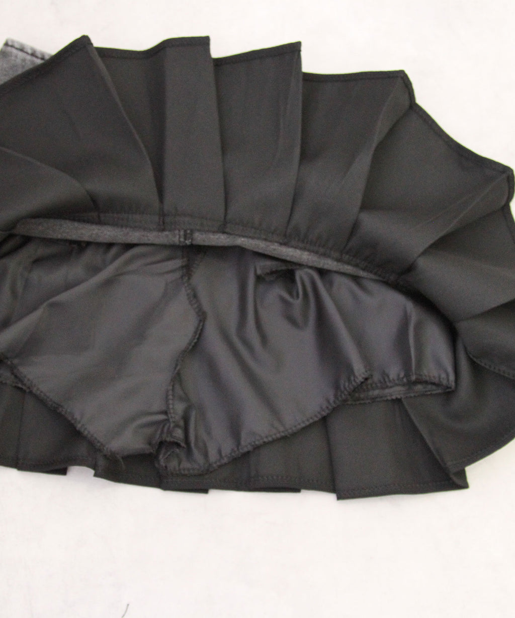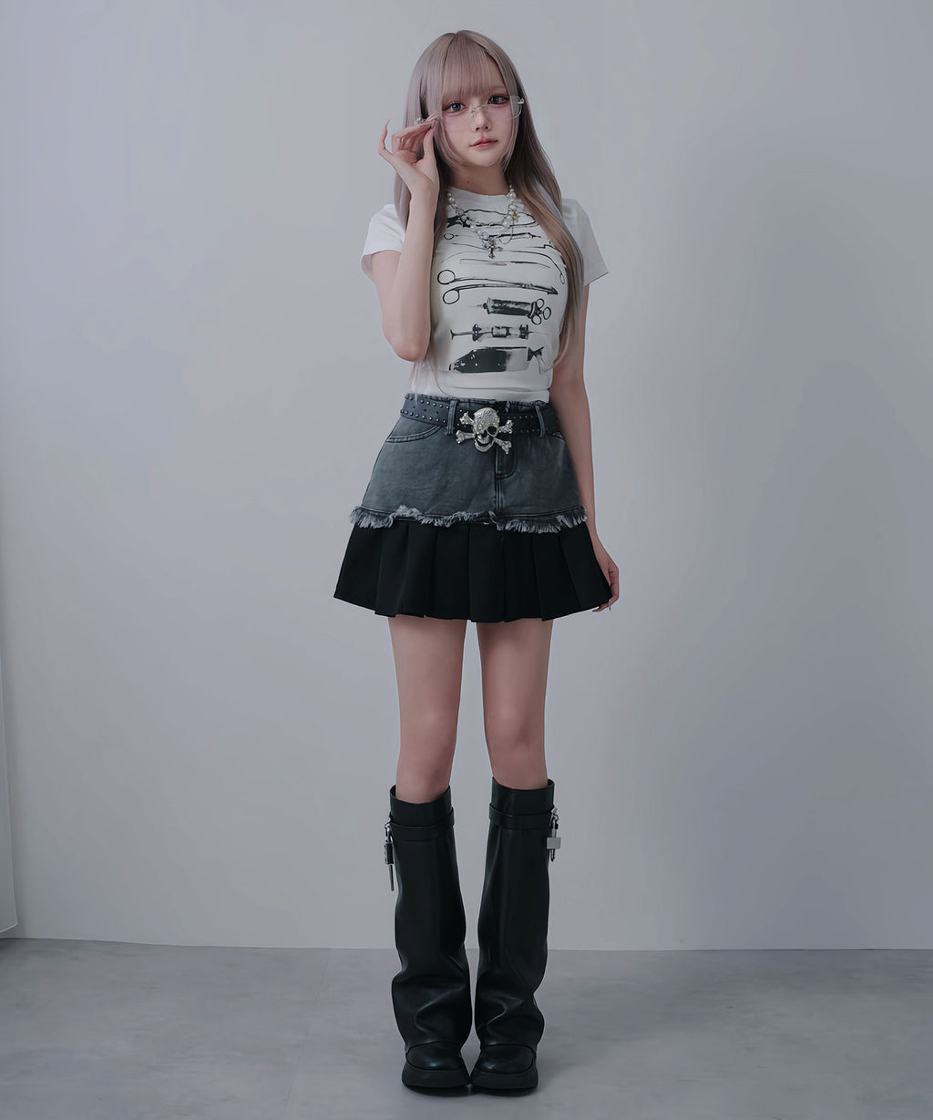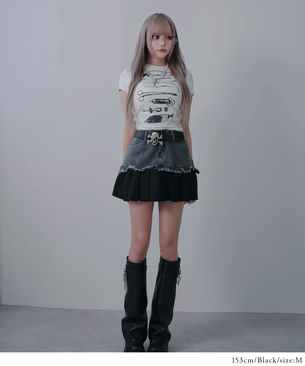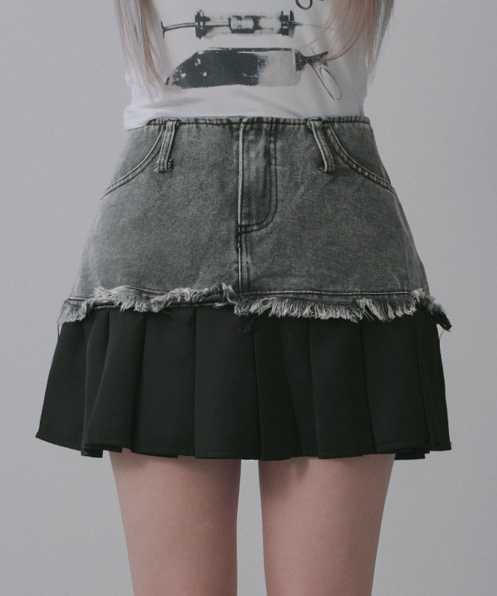 ヴィンテージライクなデニムとプリーツスカートを組み合わせたレイヤード風ミニスカート。