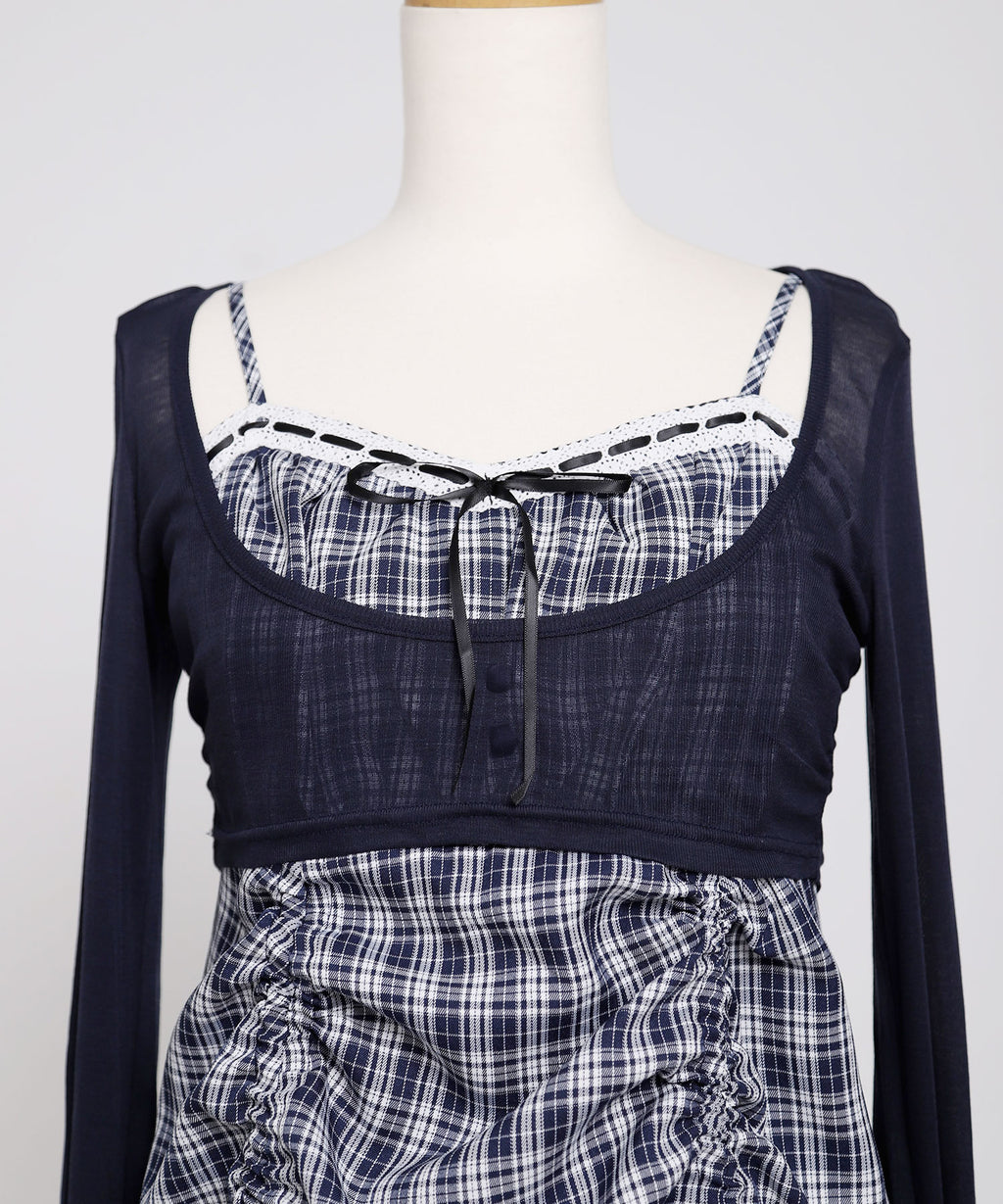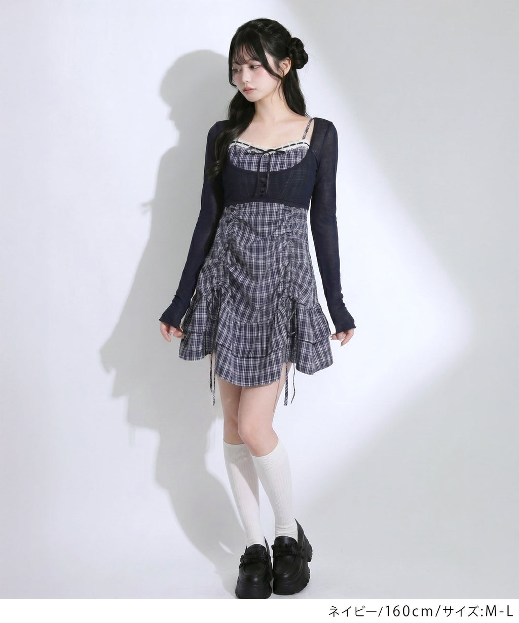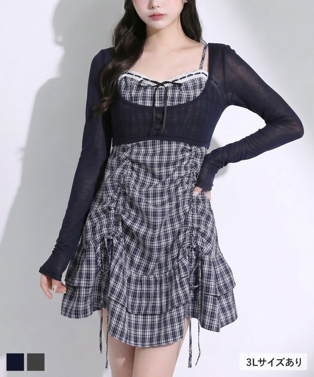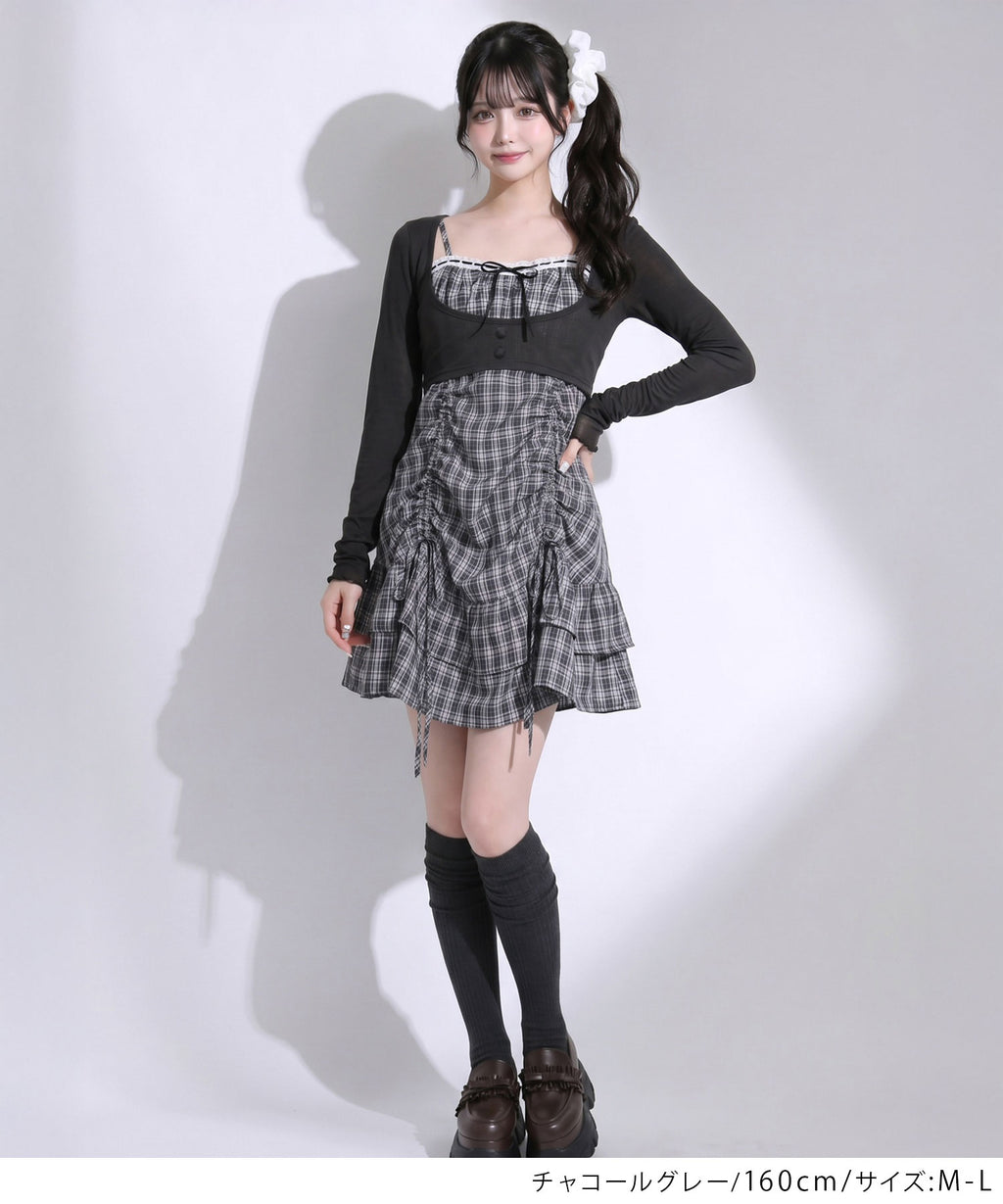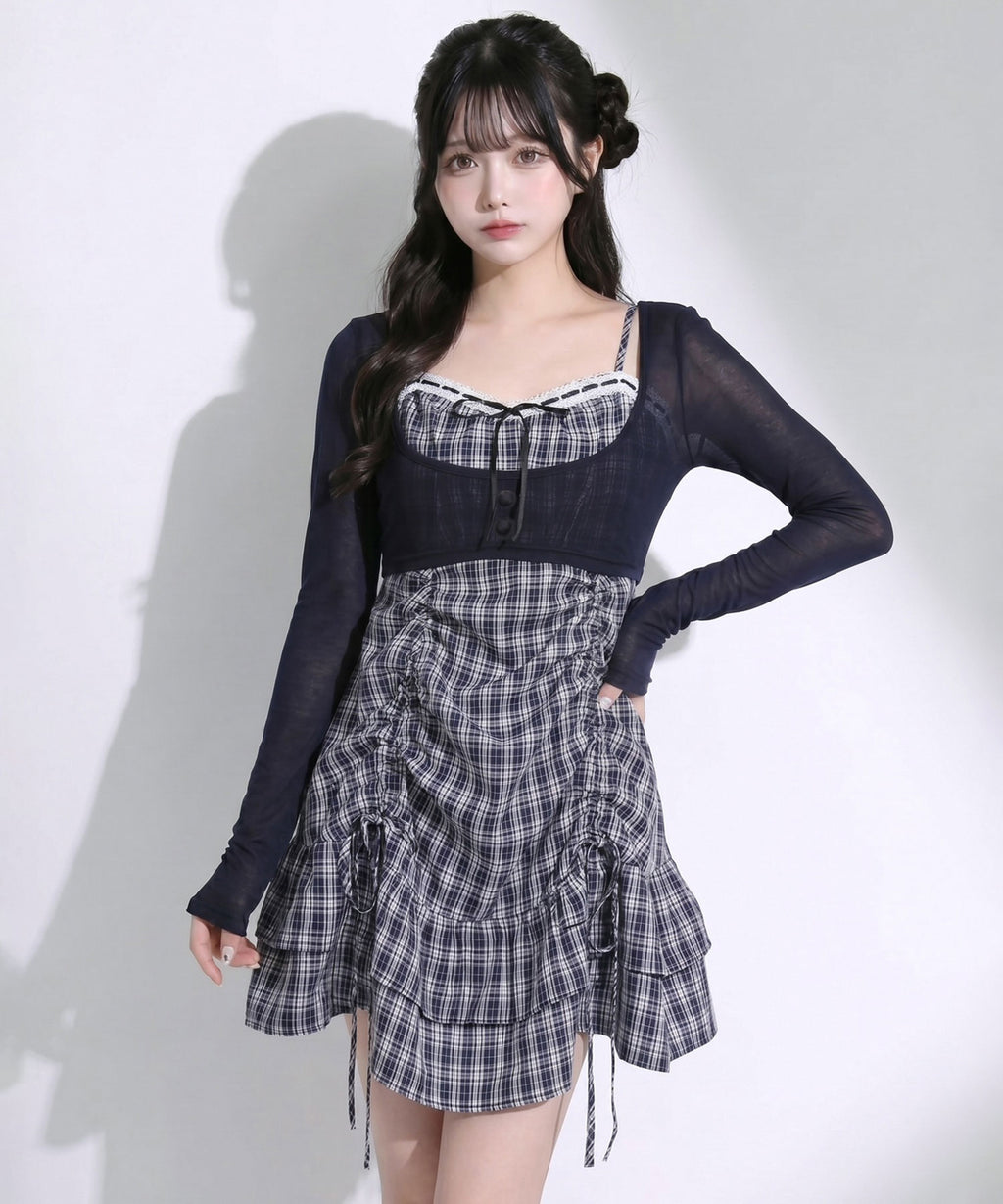 トレンド感溢れるシアーボレロと、ガーリーなチェック柄キャミワンピースがセットになったアンサンブルアイテム。