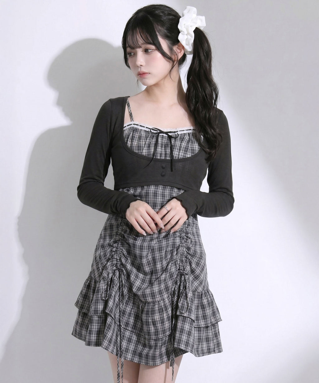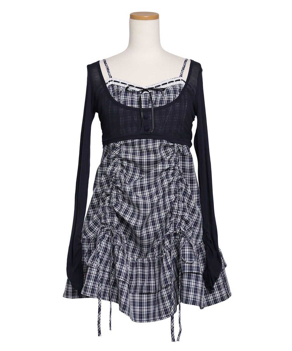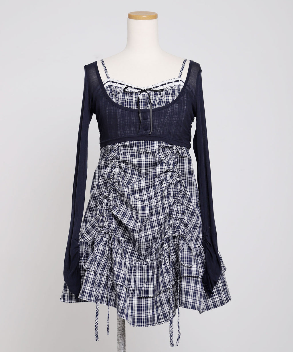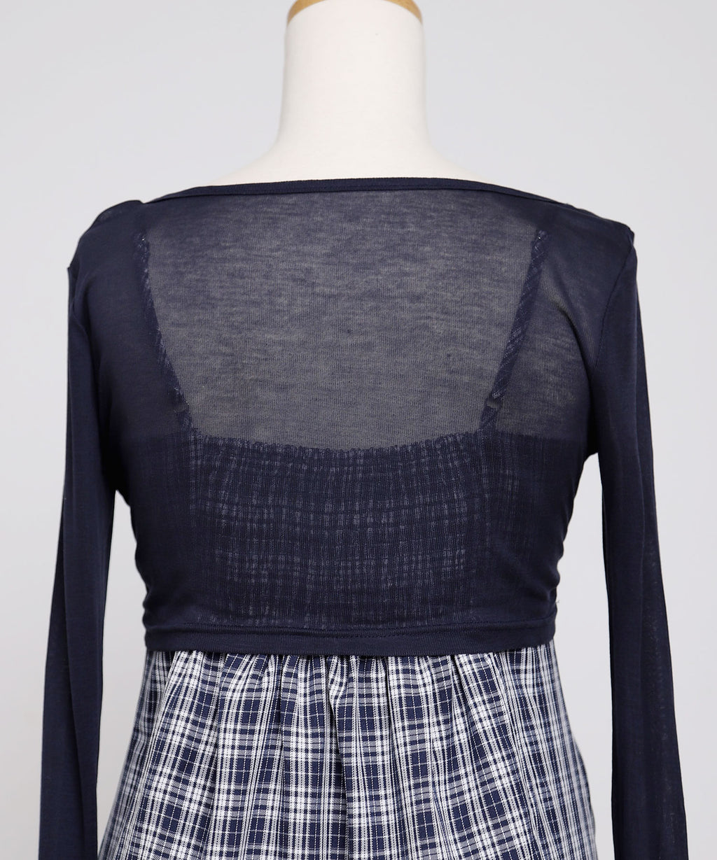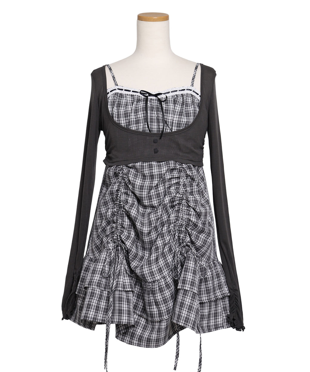トレンド感溢れるシアーボレロと、ガーリーなチェック柄キャミワンピースがセットになったアンサンブルアイテム。