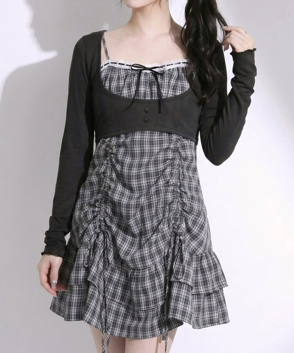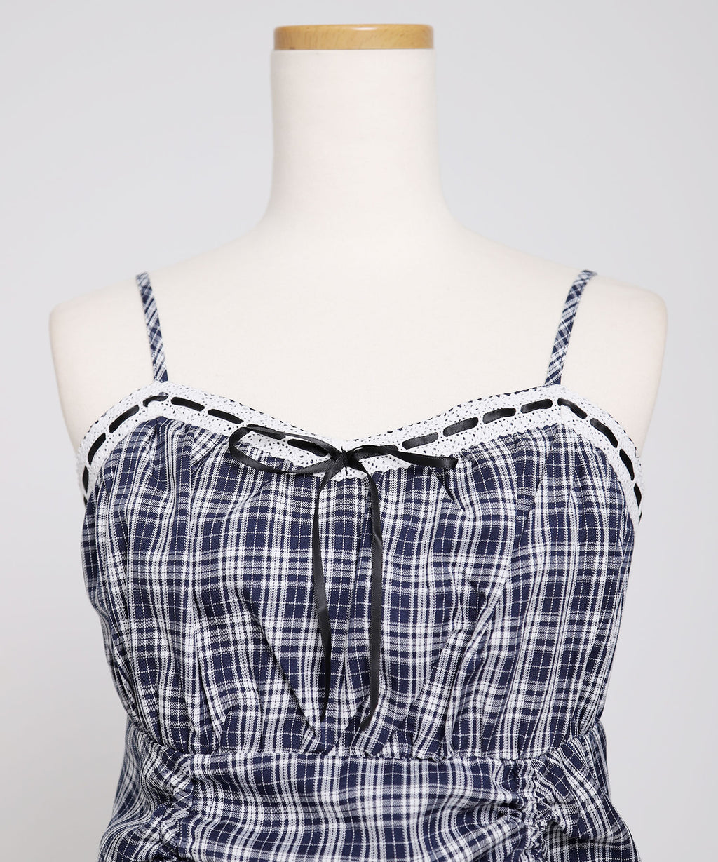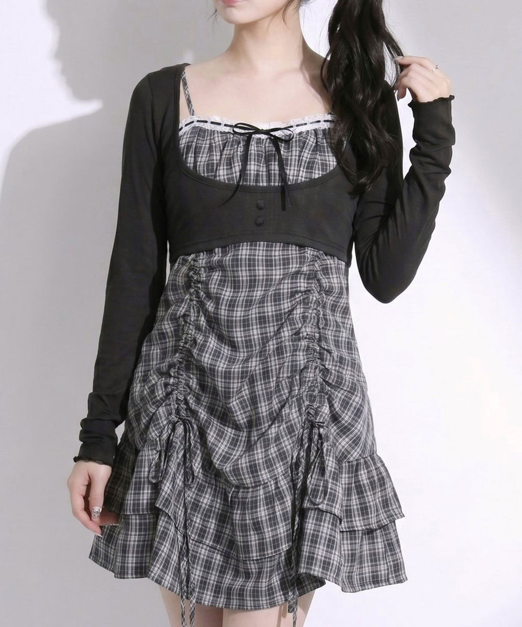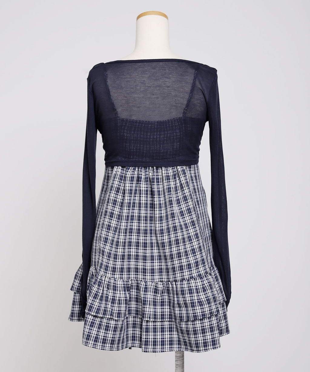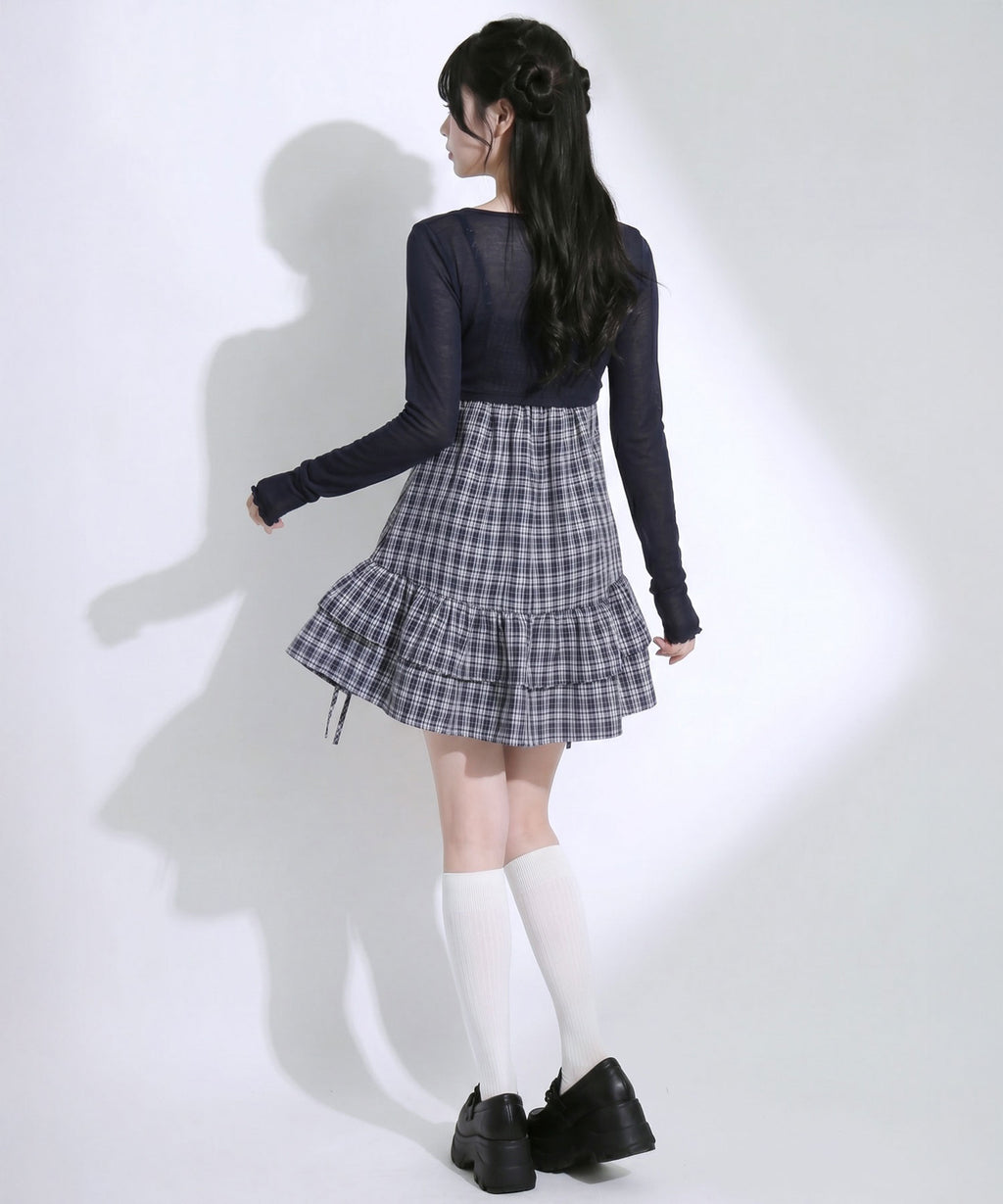 トレンド感溢れるシアーボレロと、ガーリーなチェック柄キャミワンピースがセットになったアンサンブルアイテム。