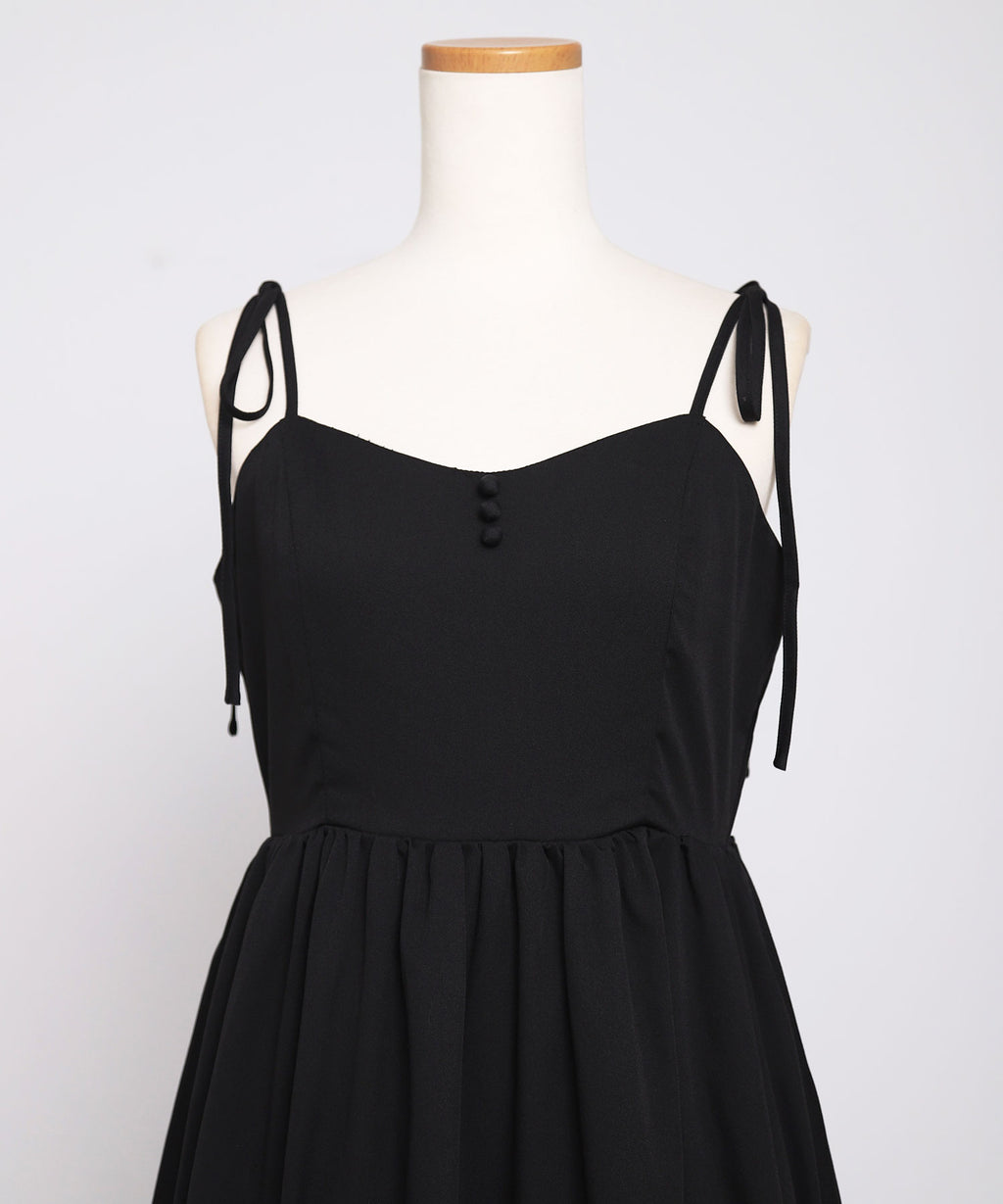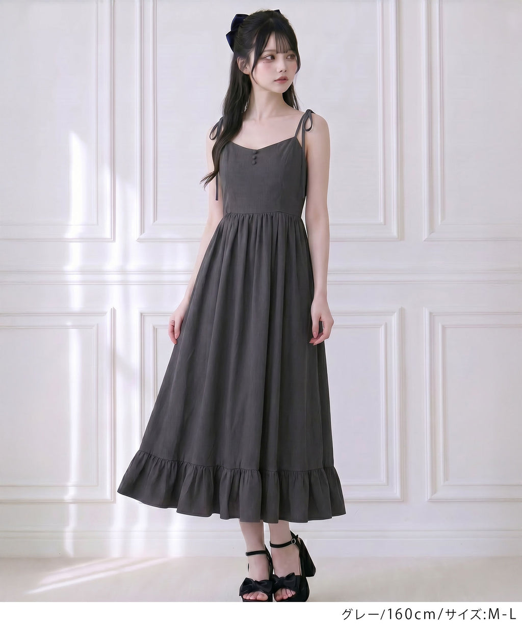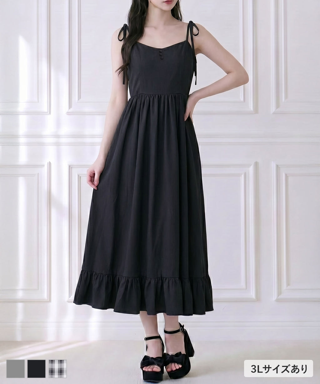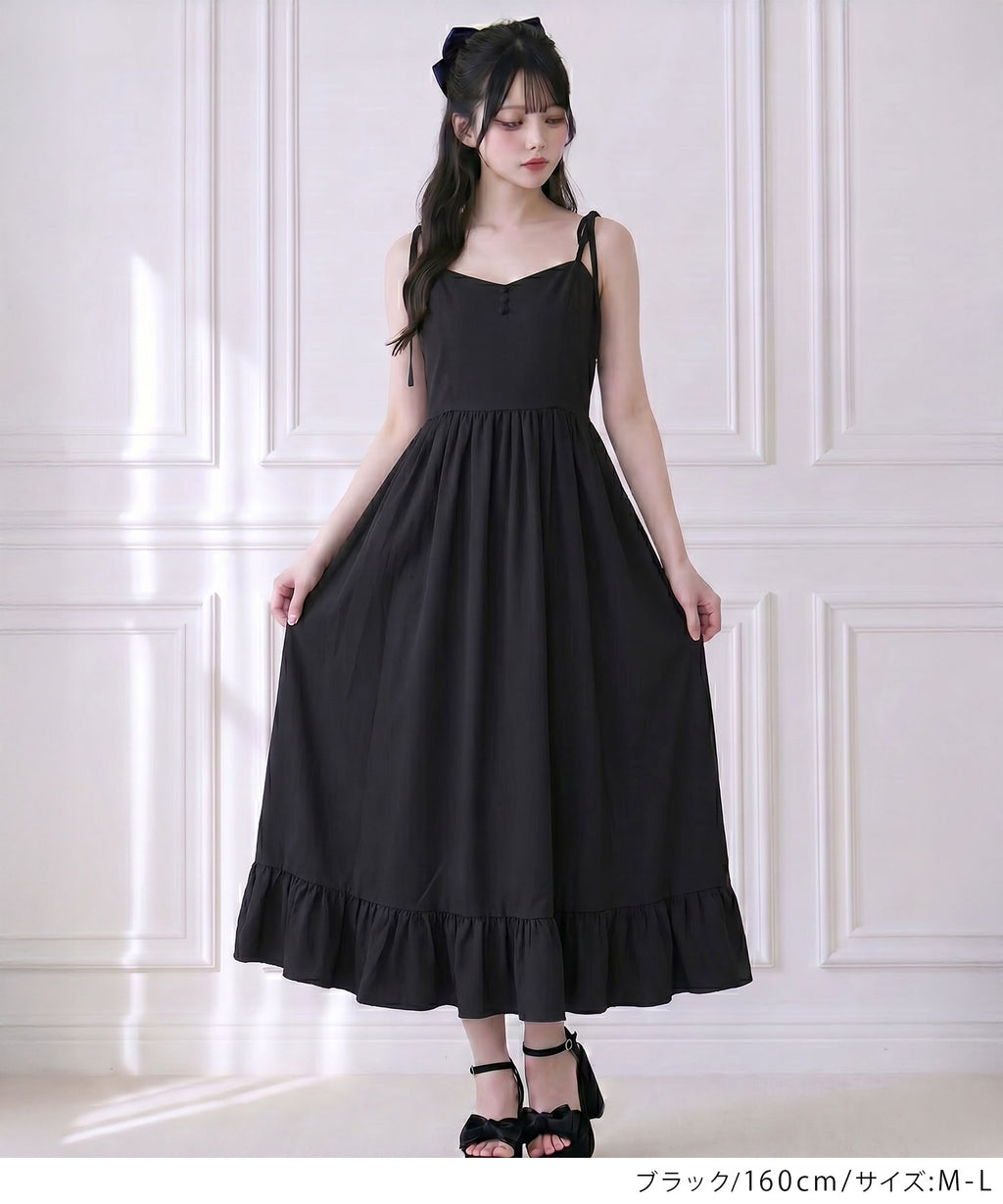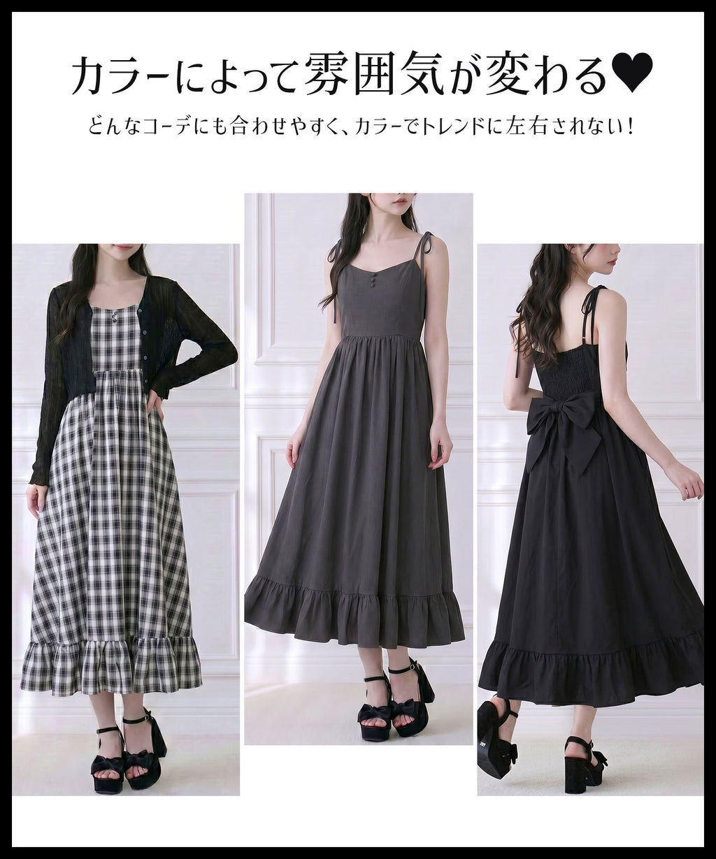 肩紐は自由に長さ調整が可能で、自分の体型にぴったりフィット。背中はシャーリングゴム仕様なので、、着脱がスムーズで着心地もストレスフリー♪裾のフリルが動くたびに揺れ、女性らしい華やかなシルエットを演出します。