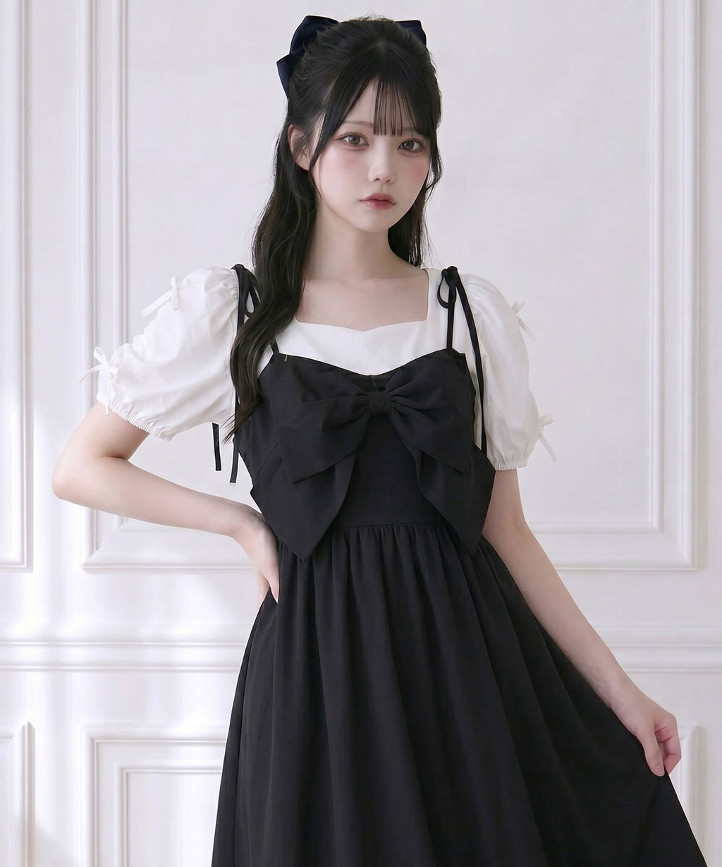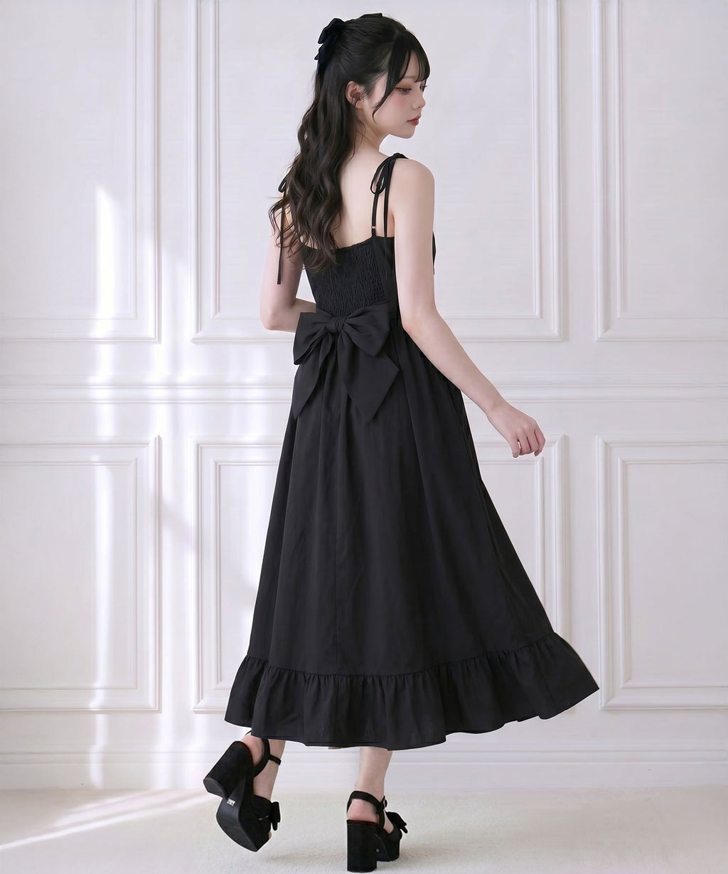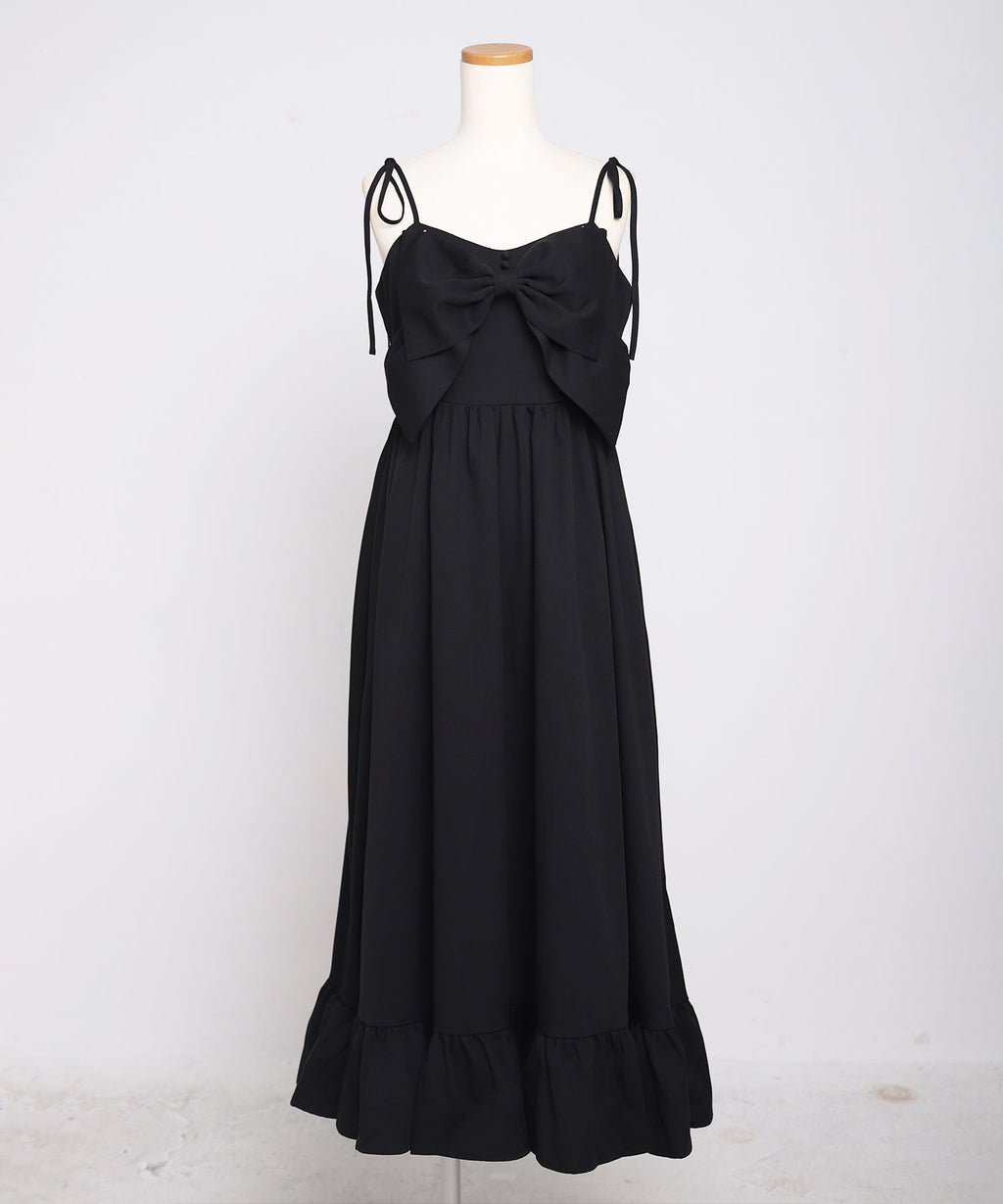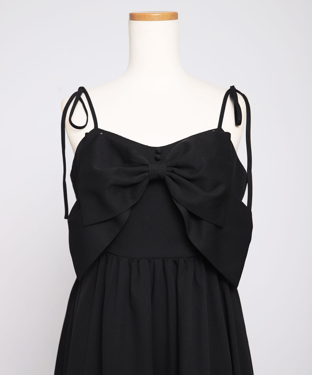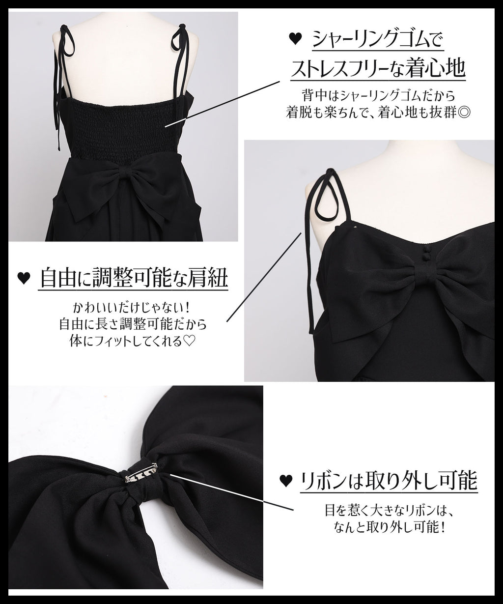目を惹く大きなリボンは取り外し可能で、前身頃・後ろ・リボンなし等お好みの着こなしをマルチに楽しめる万能ワンピース。
