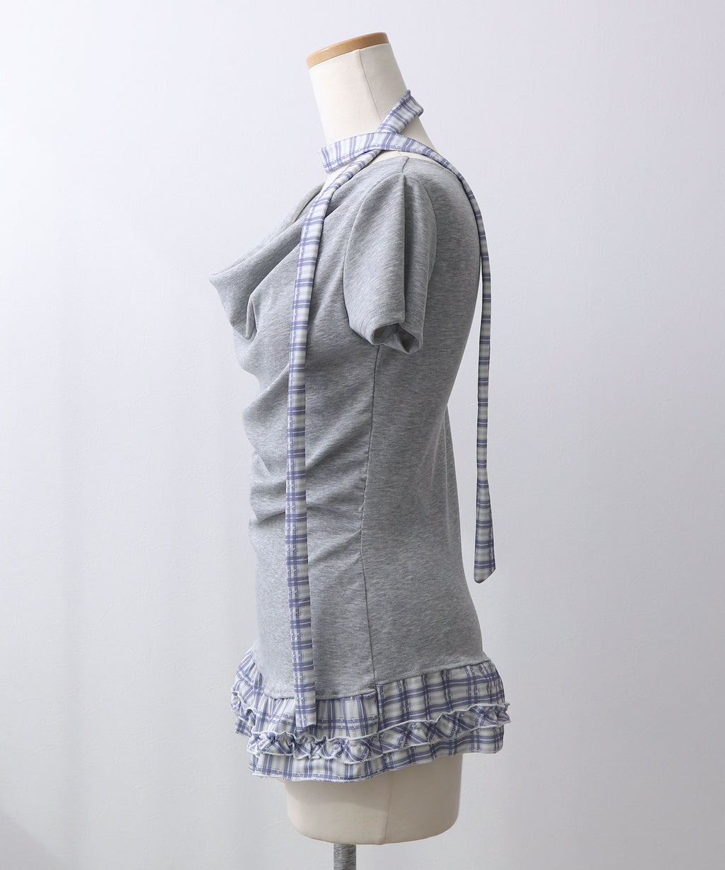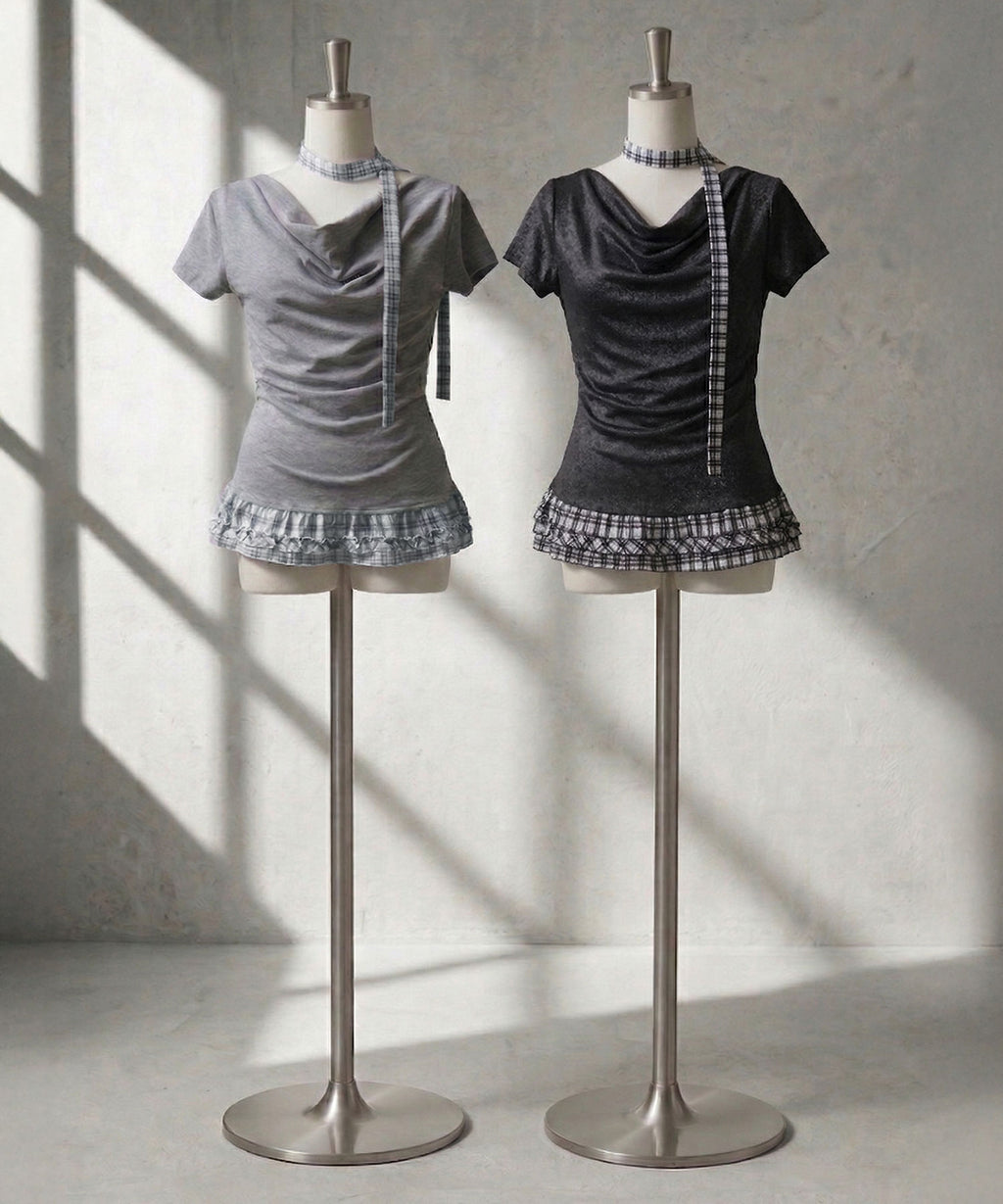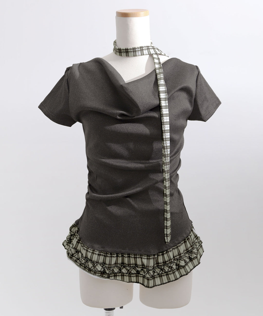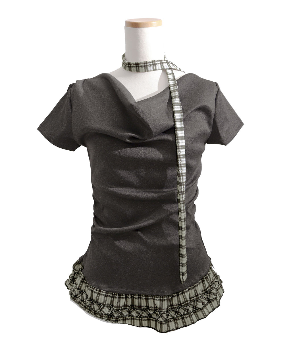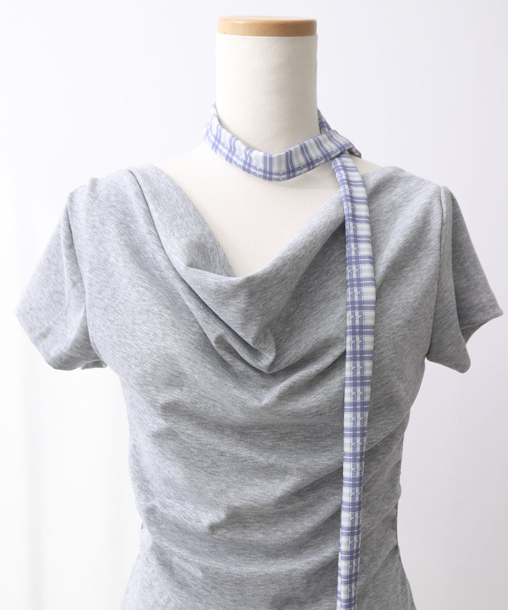 胸元にニュアンスを生むデザインが、シンプルながらも印象的な一枚に。