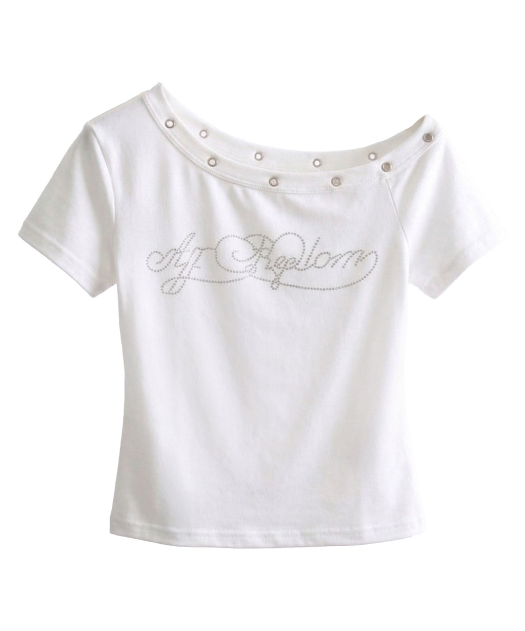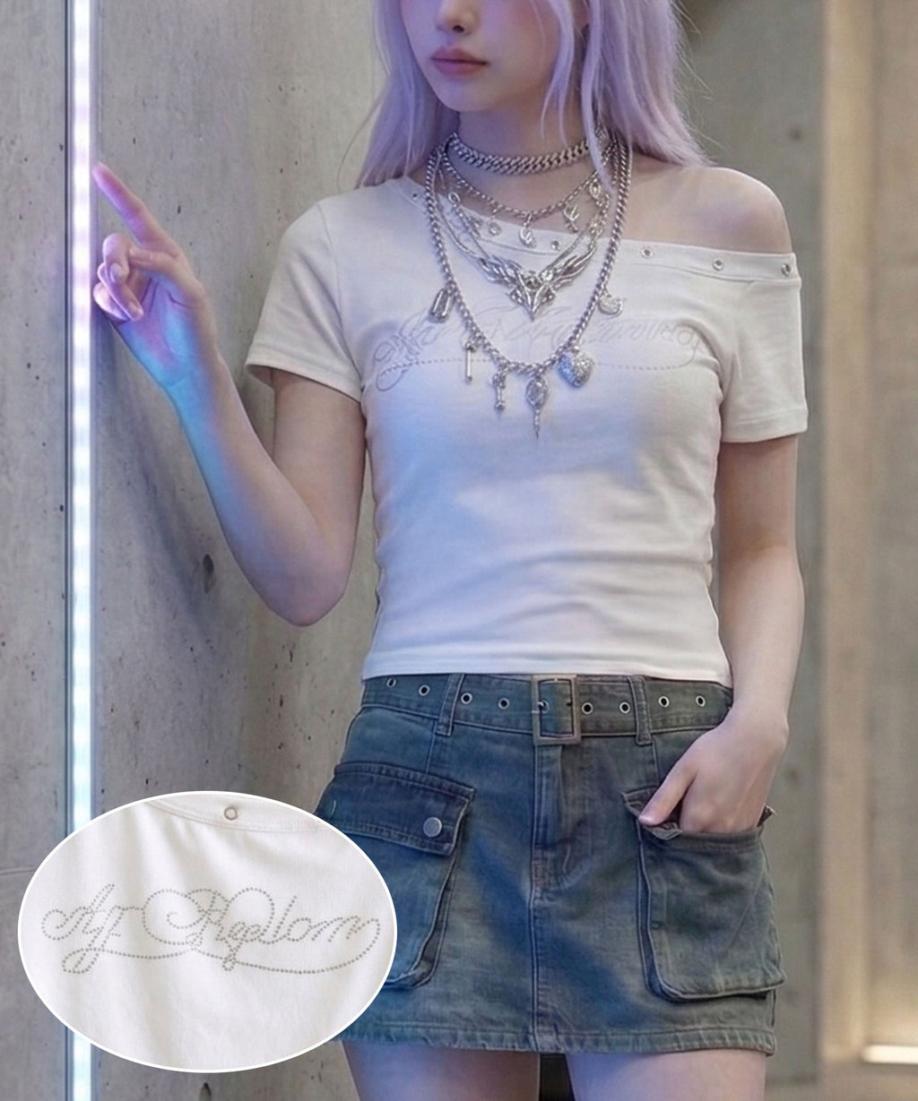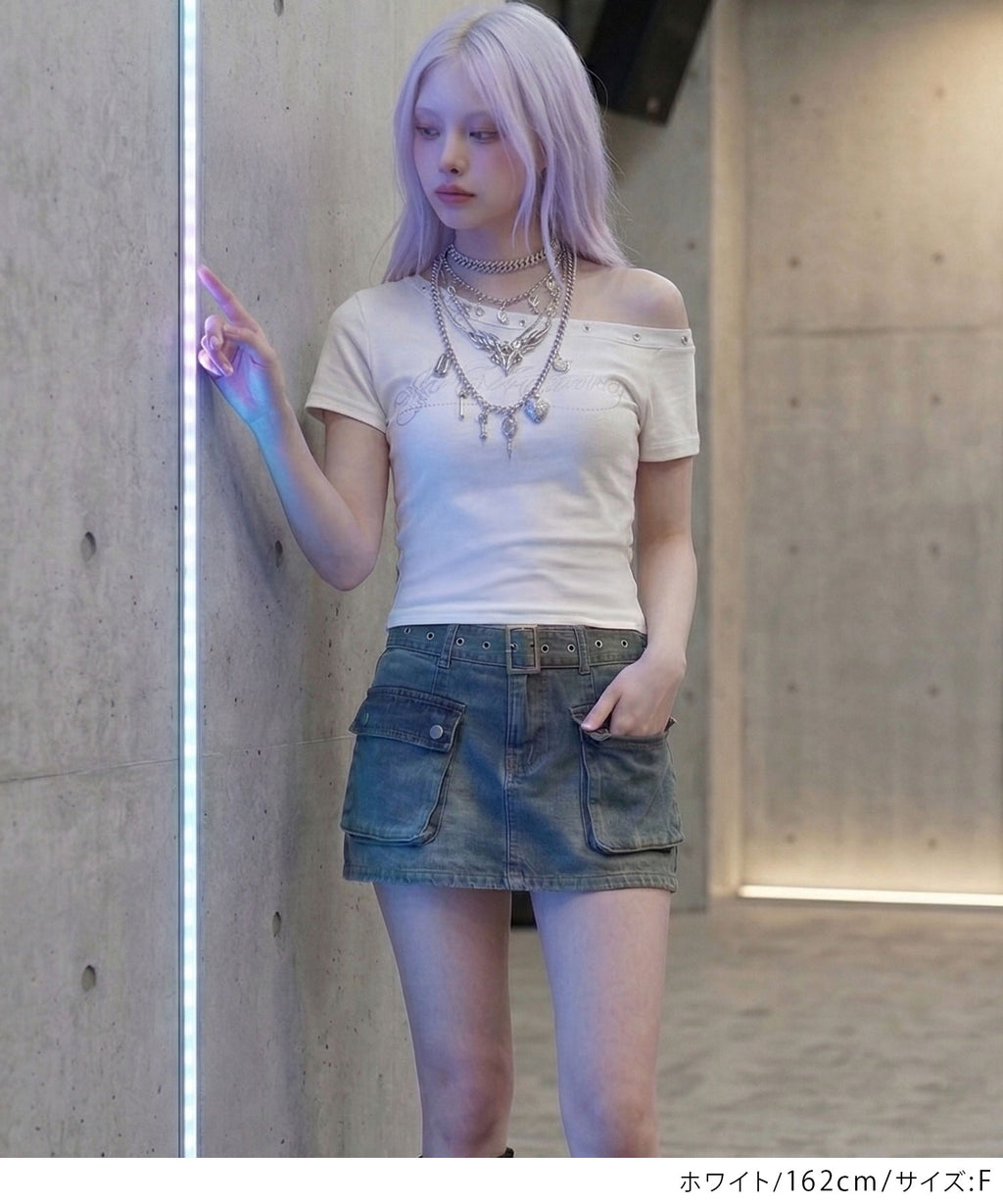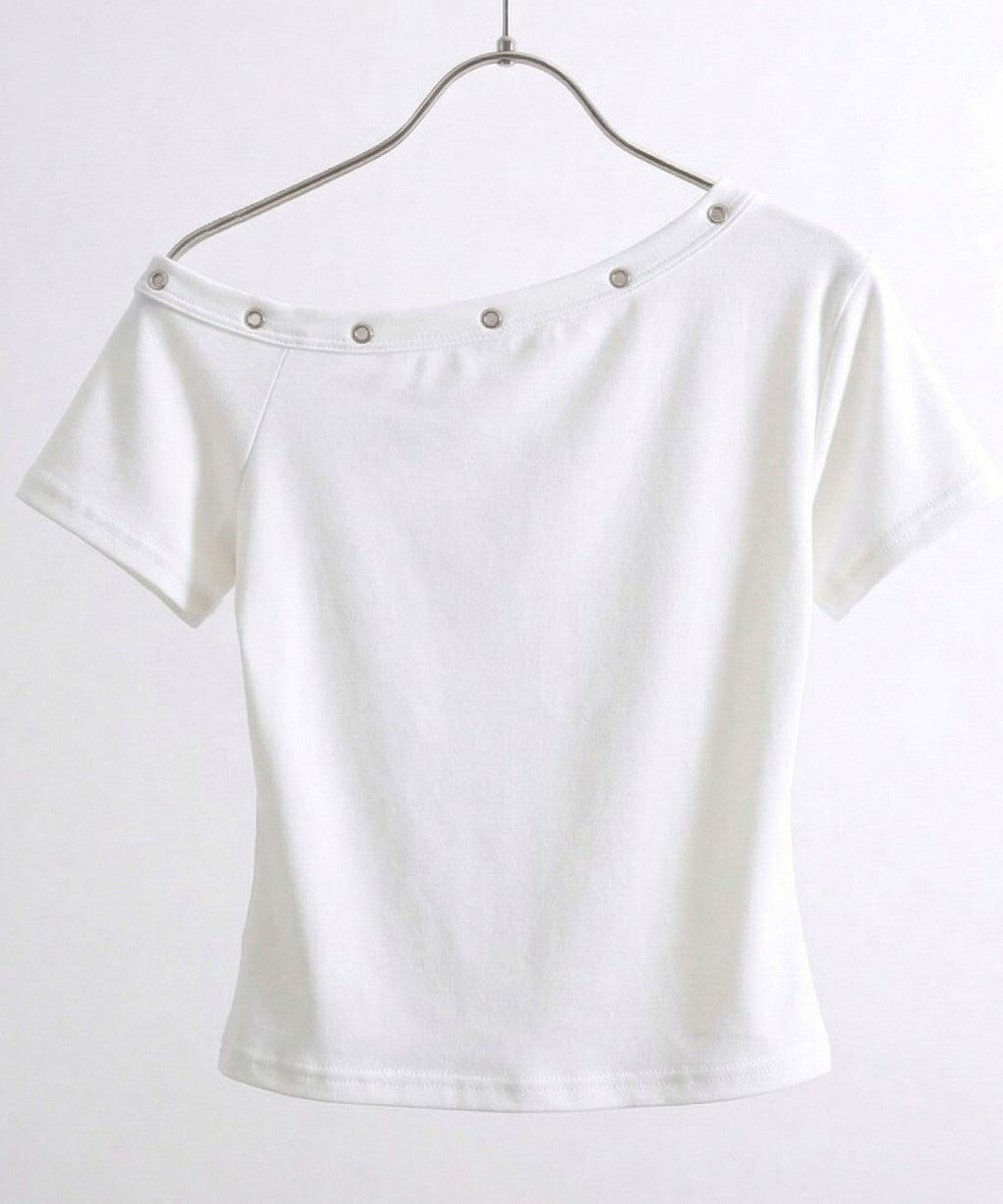 オフショルデザインにハトメスタッズを施した、エッジの効いたTシャツ。