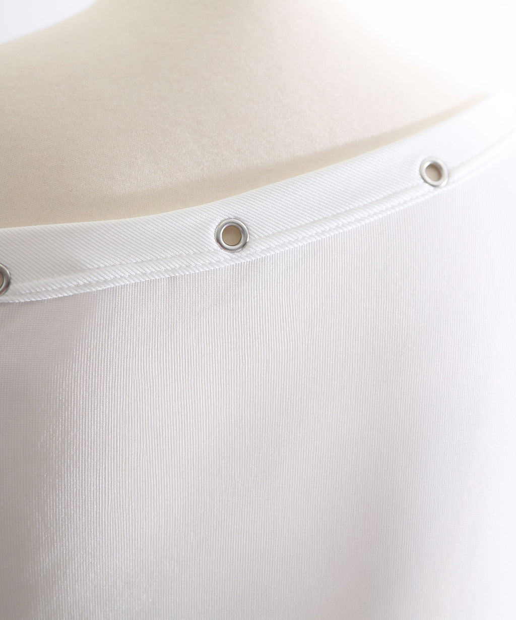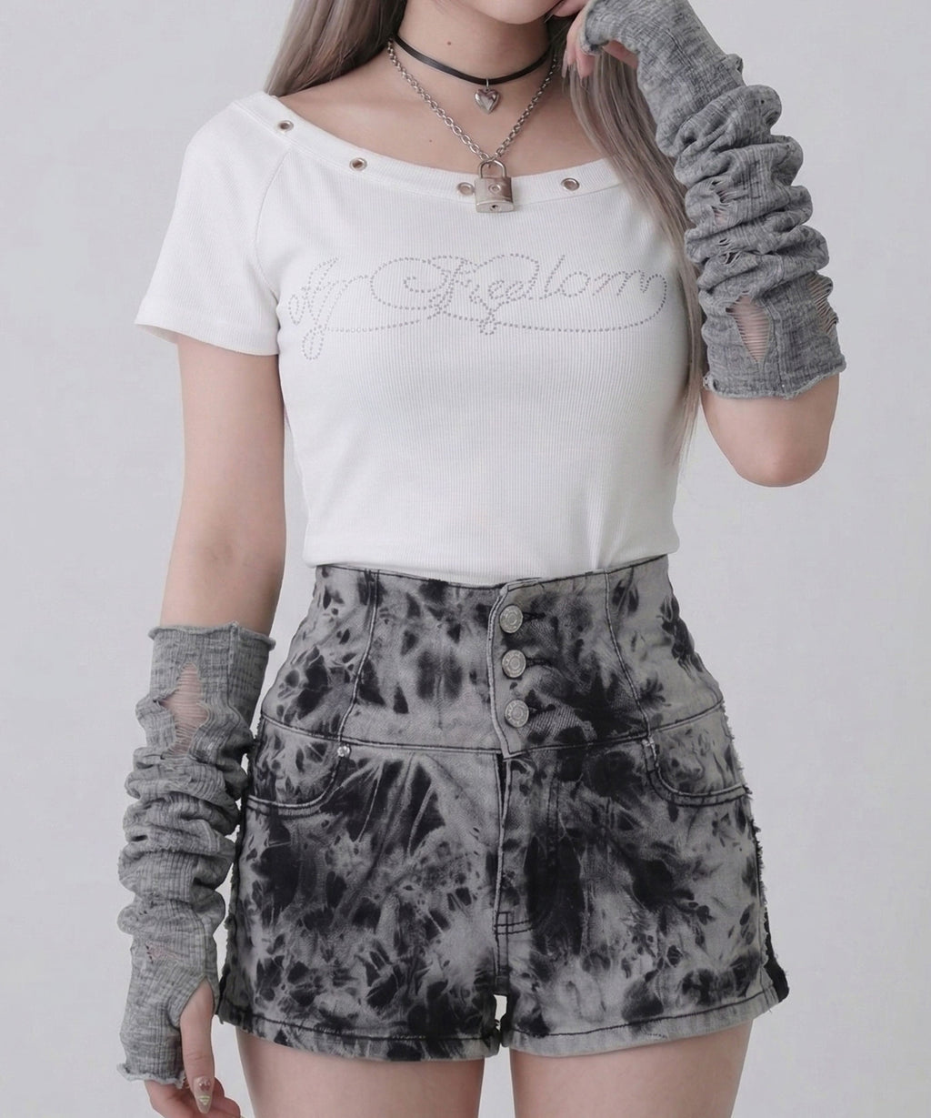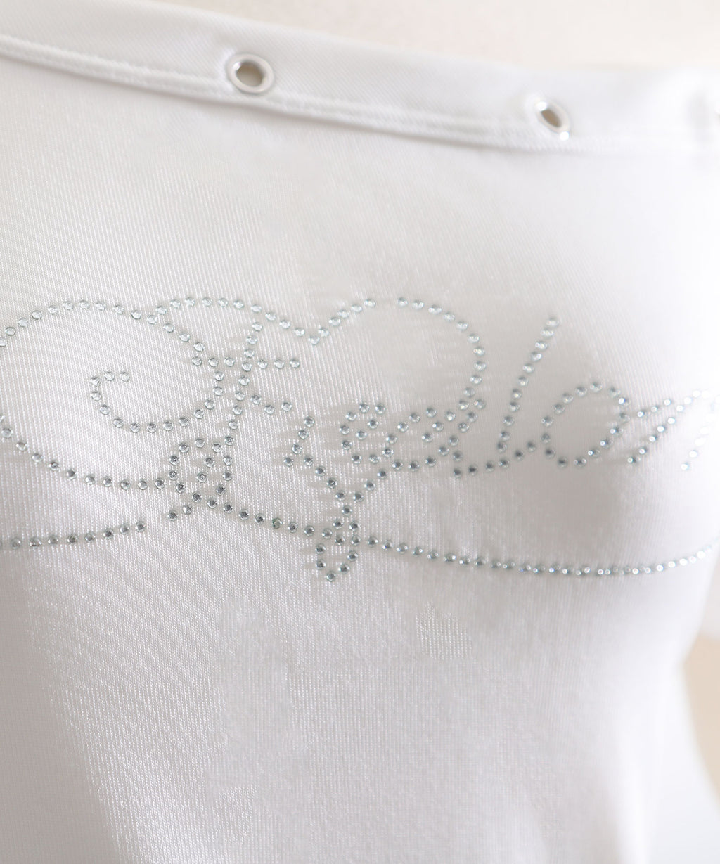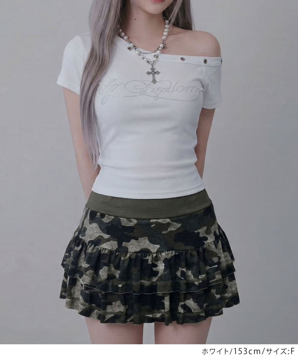 オフショルデザインにハトメスタッズを施した、エッジの効いたTシャツ。